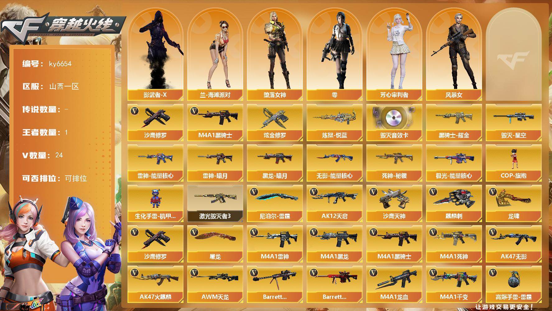 【账号佳】 【可二次实名】山西一区24V-1王者武器数-1炫金武器数 【热门武器】:M4A1-黑骑士,沙鹰-修罗*2 【王者炫金武器】:炼狱-悦蓝,炫金修罗 【音效卡】:Barrett-毁灭音效卡 【皮肤】:雷神-暗月,雷神-能量核心,毁灭-星空,黑龙-暗月,黑骑士耀金皮肤,无影-能量核心,死神-秘银,极光-能量核心 【角色】:零,堕落女神,芳心审判者,风暴女,兰-海滩派对,影武者-X 【人偶武器】:COP-旗袍,生化手雷-机甲核心 【挑战大师】:激光毁灭者III 【英雄级武器】:M4A1-千变,AK47-火麒麟,M4A1-黑龙,M4A1-雷神,M4A1-黑骑士,AK47-无影,M4A1-死神,AK12-天启,M4A1-龙血,AWM-天龙,Barrett-毁灭,Barrett-极光,沙鹰-修罗*2,沙鹰-天神,屠龙,龙啸*2,麒麟刺,尼泊尔-雷霆,高爆手雷-雷霆,闪光弹-雷霆,烟雾弹-雷霆 【其他武器】:源·火麒麟*2,源·雷神,魂·M4A1-雷神-化蛇,御·雷神-机甲刑天,魂·黑骑士-破浪10年,御·黑骑士·哪吒闹海,魂·黑武士-锋芒破茧,源·武圣,源-龙血,魂·HK417-朱雀-凤灵,源-金色蔷薇,魂·玫瑰精灵-傲梅,源·天龙,魂·天龙-彼岸花,魂·裁决-羽掣,魂·毁灭-秦师,御·毁灭-黑大圣,御·毁灭-葫芦兄弟,魂·Barrett-金色蔷薇-蛇姬,魂·Barrett-朱雀-锦鲤,魂·Barrett-朱雀- 新春神龙,灵·Barrett-朱雀-炫光,魂·炼狱-电子连击*2,魂·炼狱-玩具枪,源·武圣glock,魂·擎天-蒸汽钟表,魂·麒麟刺-神秘黑洞,魂·麒麟刺-月 【道具】:亚洲杯纪念炫彩背包,炫彩背包,超级背包,夺命之镰,防化服,枪王排位29赛季金色流光,C4-红龙,防弹头盔*2,防弹衣*2,C4工具钳*2,手雷包*2 【特殊枪械】:1黑骑士