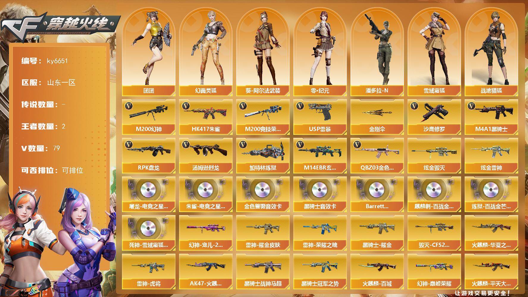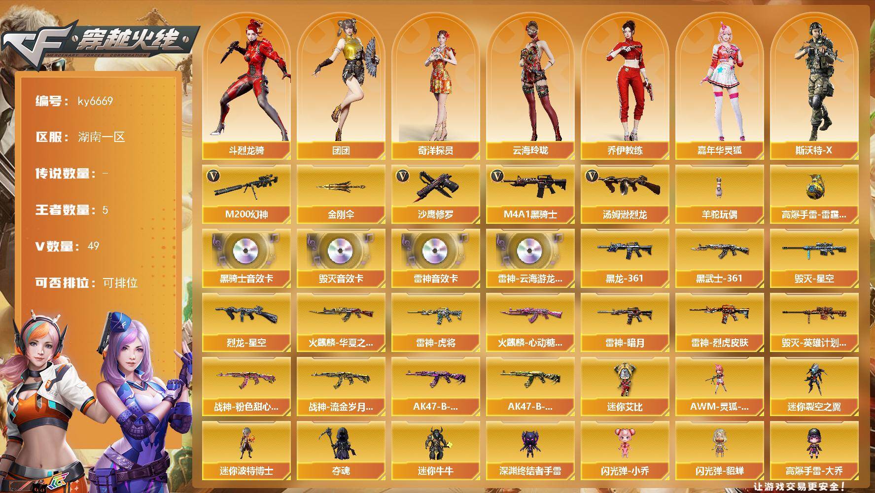 【账号佳】 【可二次实名】湖南一区51V-5王者武器数-0炫金武器数 【热门武器】:M200-幻神,M4A1-黑骑士,汤姆逊-烈龙*3,羊驼玩偶,沙鹰-修罗,金刚伞 【王者炫金武器】:高爆手雷-雷霆王者*3 【音效卡】:M4A1-雷神音效卡,M4A1-雷神-云海游龙音效卡,M4A1-黑骑士音效卡,Barrett-毁灭音效卡 【皮肤】:烈龙-星空,雷神-暗月,雷神-虎将,雷神-烈虎皮肤,火麒麟-华夏之心,火麒麟-心动糖果,毁灭-星空,毁灭-英雄计划 皮肤,M4A1-黑龙-361,AK47-黑武士-361,战神-粉色甜心皮肤,战神-流金岁月皮肤,AK47-B-常胜将军-曹操*2,AK47-B-常胜将军-孙权*2 【角色】:王者玲珑-小乔,奇洋探员,乔伊教练,修道士,云海玲珑,斗烈龙骑,风暴女*2,虎妞,嘉年华灵狐,娟娟,灵狐者-X,潘多拉-X,斯沃特-X,王者-零-传说之路,团团 【人偶武器】:AWM-灵狐-15周年嘉年华,迷你裂空之翼,迷你波特博士,夺魂*2,迷你牛牛,深渊终结者手雷*3,闪光弹-小乔,闪光弹-貂蝉,高爆手雷-大乔,迷你艾比 【挑战大师】:神圣爆裂者III,AK47-冰龙粉碎者,冰龙粉碎者-白马银枪,激光毁灭者III-白马银枪,VEPR-12-金魔,激光毁灭者III,机甲撕裂者III,阐释者III 【英雄级武器】:AK47-火麒麟*2,M4A1-黑龙,M4A1-雷神,M4A1-黑骑士,无影-神兵利器,烈火-动感闪耀,AK47-B-战神,AK47-B-常胜将军,AK47-B-身先士卒,AK47-B-战士,天罚-斗烈龙驹,Barrett-毁灭,M200-幻神,Barrett-暗月传说*2,汤姆逊-烈龙*3,烈龙-云海游龙,沙鹰-修罗,USP-神工天巧,天神-动感闪耀,屠龙,唐刀-神工天巧,屠龙-动感闪耀,擎天-云海游龙,王者之锋-觉醒版,雷霆王者之锋-觉醒版,扳手-量子之心,屠龙-斗烈龙驹,高爆手雷-幻灵*2,高爆手雷-神工天巧*4,手雷-动感闪耀,手雷-云海游龙,高爆手雷-雷霆王者-觉醒版*2,高爆手雷-量子之心,闪光弹-神工天巧*4,闪光弹-量子之心,烟雾弹-神工天巧*4,烟雾弹-量子之心,M4A1-赤狱骑士 【其他武器】:源·火麒麟*3,魂·火麒麟-百城,御·火麒麟-平天大圣,源-黑龙,御·黑龙-龙太子,源·雷神*3,魂·M4A1-雷神-化蛇*2,魂·雷神-维纳斯,魂-雷神-萌杀,魂·雷神-15周年嘉年华,御·雷神-机甲刑天,御·雷神-烈虎,御·雷神-小白龙*2,源·黑骑士*2,魂·黑骑士-现代金属,魂·黑骑士-幻能朋克*2,源·无影,魂-死神-机甲核心,源·AK47-黑武士,源·天启,源·超新星,御·超新星-圣诞,源·机械迷城,源·青龙,魂·QBZ03-金色蔷薇-萌杀*2,源-极光*2,源·天龙,AWM-裁决-百城联赛天津,魂·裁决-新人王绿豆,魂·毁灭-航天科技,魂·毁灭-青帝,御·毁灭-葫芦兄弟,源·Barrett-朱雀,魂·炼狱-月*2,加特林-炼狱-掌火,御·炼狱-女娲*2,魂·修罗-15周年嘉年华,源·天神,魂·天神-宇航兔兔*2,魂·屠龙-都是Cfer,源-擎天,源·龙啸*2 【道具】:云海游龙炫彩背包,全能枪王背包,冰冰企鹅背包-猛男专用,炫彩背包,老虎背包,超级背包,救世主-黑桃战神,绿色巨人,灵魂忍者,迷雾幽灵,夺命之镰,防化服*2,金色流光-枪王排位*2,星辰流光-枪王排位,语音特效-机器人,动感闪耀表情,云海游龙表情,C4-红龙,防弹头盔*3,防弹衣*3,C4工具钳*3,手雷包*3 【特殊枪械】:1黑骑士,3烈龙
