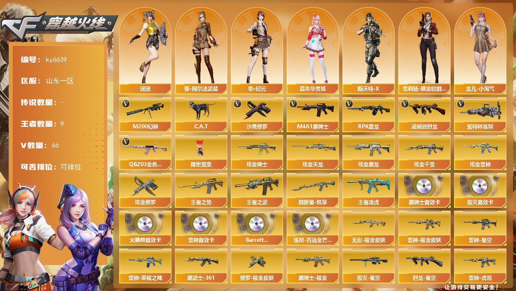 【账号佳】 【可二次实名】山东一区70V-9王者武器数-7炫金武器数 【热门武器】:QBZ03-金色蔷薇,M200-幻神,C.A.T,M4A1-黑骑士*4,汤姆逊-烈龙,RPK-盘龙*2,加特林-炼狱,降世魔童,沙鹰-修罗 【王者炫金武器】:超新星-悦享*2,王者之势,王者之武,王者凌虎,炫金骑士,炫金黑龙*2,炫金千变,炫金雷神,炫金天龙,炫金修罗 【音效卡】:AK47-火麒麟音效卡,M4A1-雷神音效卡*2,M4A1-黑骑士音效卡,Barrett-毁灭音效卡,Barrett-碧霄极光音效卡*2,炼狱-百战金芒-庆典舞曲音效卡 【皮肤】:幻神-动感闪耀 皮肤,烈龙-星空,雷神-暗月,雷神-能量核心,雷神-荣耀之魄*2,雷神-星空,雷神-虎将,雷神-耀金皮肤,雷神-源计划2.0专属 皮肤,M4A1-再燃火线,雷神-蓝风铃 皮肤,火麒麟-雷神,火麒麟-心动糖果,毁灭-暗月,毁灭-星空,毁灭-黑曼巴 皮肤,毁灭-航天科技皮肤,毁灭-斗烈龙驹 皮肤,黑龙-能量核心,黑龙-暗月,黑龙-墨子皮肤,黑骑士-暗月,黑骑士耀金皮肤,无影-能量核心*3,无影耀金皮肤,AK47-黑武士-361,战神-粉色甜心皮肤,战神-紫绶金章皮肤*6,战神-流金岁月皮肤*4,天龙-能量核心,AWM-天龙-传奇白鲨,极光-能量核心,修罗-能量核心*2,修罗耀金皮肤,天神-暗月,龙啸-醒狮 皮肤,轻型军用手斧-再燃火线 【角色】:葵,樱,零·纪元,葵-阿尔法武装,空,暗夜-X,北极狐-X,虎妞,嘉年华灵狐,龙儿-小淘气,潘多拉-X,斯沃特-X,新娜塔莎,雪莉杨-摸金校尉,影武者-X,团团 【人偶武器】:火麒麟-灵狐,M4A1-雷神-精英刀锋,AWM-灵狐-15周年嘉年华*2,COP-旗袍,C.A.T,迷你裂空之翼,迷你波特博士,夺魂,迷你生化手雷,闪光弹-小乔,迷你巨石泰坦-魔花研究所,降世魔童 【暴走生化】:超级对讲机 【挑战大师】:AK47-冰龙粉碎者,冰龙粉碎者-白马银枪,激光毁灭者III-白马银枪,激光毁灭者III,试炼破坏者III 【英雄级武器】:AK47-火麒麟*2,AK47-麒麟,M4A1-黑龙,M4A1-雷神,M4A1-黑骑士*4,AK47-无影,AK47-黑武士,AN94-超新星,无影-神兵利器,QBZ03-金色蔷薇,M4A1-猎神,9A91-烈火,王者之心-觉醒版,王者之魄-觉醒版,AK-47-猩红传说*8,AK47-B-战神,机械迷城-穹宇,AK47-B-战士,天罚-斗烈龙驹,AWM-天龙,Barrett-毁灭,Barrett-极光,AWM-裁决*2,M200-幻神,Barrett-朱雀,Barrett-金色蔷薇*2,王者之怒-觉醒版,Barrett-暗月传说,RPK-盘龙*2,加特林-炼狱,炼狱-百战金芒,汤姆逊-烈龙,AA-12-雷霆,沙鹰-修罗,沙鹰-天神,王者之魂-觉醒版,屠龙*2,龙啸,擎天,麒麟刺*2,尼泊尔-雷霆,麒麟刺-百战金芒,丛林匕首-玄豹,屠龙-斗烈龙驹,龙啸-烈火龙威,高爆手雷-雷霆,闪光弹-雷霆,烟雾弹-雷霆,M4A1-赤狱骑士,M4A1-苍鸣雷神,Barrett-碧霄极光 【其他武器】:源·火麒麟*3,火麒麟-雷神,源-黑龙*2,御·黑龙-龙太子,源·雷神*6,魂·M4A1-雷神-化蛇*2,魂·雷神-神秘按键,魂·雷神-新春神龙,魂-雷神-萌杀,魂·雷神-15周年嘉年华,M4A1-十二生肖·龙-雷神,御·雷神-小白龙,源·黑骑士*3,魂·黑骑士-破浪10年,御·黑骑士·哪吒闹海*2,魂-死神-机甲核心,源·天启*4,源·超新星,源·机械迷城,魂·龙血-锋芒破茧,源·青龙,M4A1-青龙-掌上穿越火线,魂·HK417-朱雀-凤灵,魂·QBZ03-金色蔷薇-萌杀,魂·QBZ03-金色蔷薇-蛇姬,源·玫瑰精灵*2,源·猎神,魂·英雄-湾区光枢,源-极光*2,源·天龙*2,魂·裁决-凤灵,魂·毁灭-青帝*2,魂·毁灭-神秘黑洞*2,魂·Barrett-金色蔷薇-蛇姬,源·Barrett-朱雀,魂·炼狱-电子连击,魂·炼狱-月,加特林-炼狱-掌火*2,御·炼狱-女娲,魂·修罗-15周年嘉年华,魂·修罗-神兵利器,源·天神*3,魂·天神-宇航兔兔,灵·天神-穹宇,魂·屠龙-春桃,魂·屠龙-都是Cfer,魂·擎天-破浪10年,源·擎天-萌杀*2,源·龙啸*3,灵·麒麟刺-穹宇 【道具】:BS战队炫彩背包,女皇终结者-背包,战舰背包,炫彩背包,百战金芒炫彩背包,超级背包*2,女皇终结者-魔龙之吻,妩媚妖姬,绿色巨人,灵魂忍者*2,变异宝贝,迷雾幽灵*2,夺命之镰,防化服*3,金色流光-枪王排位*2,星辰流光-枪王排位,流光-鎏金之域,枪王排位29赛季金色流光,语音特效-盛典烟火,萌萌小葵表情,防弹头盔*4,防弹衣*4,C4工具钳*3,手雷包*4 【特殊枪械】:4黑骑士,1烈龙,2盘龙,1炼狱