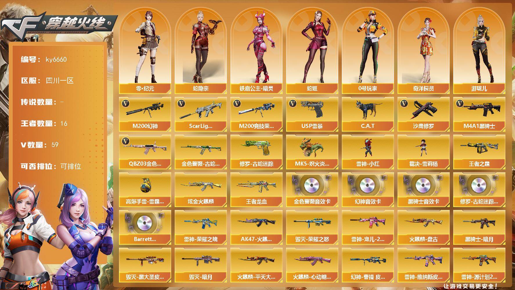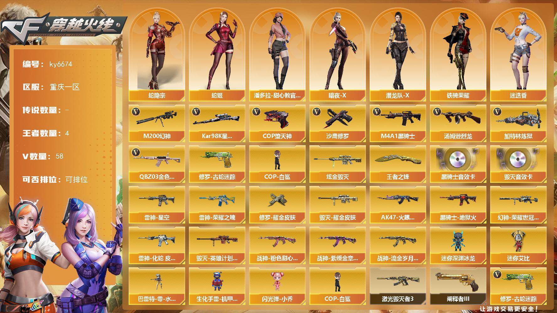 【账号佳】 【可二次实名】重庆一区59V-4王者武器数-1炫金武器数 【热门武器】:QBZ03-金色蔷薇,M200-幻神,修罗-古蛇迷踪,Kar98K-星神,M4A1-黑骑士*2,汤姆逊-烈龙,加特林-炼狱*2,COP-白鲨*2,COP-堕天神,沙鹰-修罗*3 【王者炫金武器】:王者之锋,炫金毁灭 【音效卡】:M4A1-黑骑士音效卡,Barrett-毁灭音效卡 【皮肤】:幻神-荣耀世冠白鲨2023 皮肤,雷神-荣耀之魄,雷神-星空,雷神-化蛇 皮肤,AK47-火麒麟-传奇EVEN,毁灭耀金皮肤,毁灭-英雄计划 皮肤,黑骑士-地狱火,战神-粉色甜心皮肤*2,战神-紫绶金章皮肤,战神-流金岁月皮肤,修罗耀金皮肤 【角色】:零,迷迭香,蛇隐宗,空,暗夜-X,芳心审判者,兰-海滩派对,龙儿,潘多拉-甜心教官,潜龙队-X,蛇姬,铁骑-乘风破浪,铁骑荣耀,王者-零-传说之路,樱-缤纷夏日,影武者-X 【人偶武器】:COP-白鲨*2,巴雷特-零-水下丽影,迷你深渊冰龙*3,生化手雷-机甲核心,闪光弹-小乔,迷你艾比 【挑战大师】:激光毁灭者III,阐释者III 【英雄级武器】:AK47-火麒麟,M4A1-雷神,M4A1-黑骑士*2,AK47-黑武士,AN94-超新星,M4A1-堕天神,QBZ03-金色蔷薇,9A91-烈火,王者之势-觉醒版,王者之幻-觉醒版,AK-47-猩红传说,AK47-B-战神,AK47-B-战士,Barrett-毁灭*3,M200-幻神,Kar98K-星神,王者之怒-觉醒版,加特林-炼狱*2,汤姆逊-烈龙,AA-12-雷霆,沙鹰-修罗*3,COP-堕天神,修罗-古蛇迷踪,屠龙*4,龙啸,麒麟刺-堕天神,麒麟刺,龙啸-堕天神*2,高爆手雷-堕天神*6,高爆手雷-古蛇迷踪,闪光弹-堕天神*6,闪光弹-竞技荣光,烟雾弹-堕天神*6,烟雾弹-竞技荣光 【其他武器】:AK47-火麒麟-猫爪,源·雷神,魂·M4A1-雷神-化蛇*2,魂·雷神-神秘按键,M4A1-十二生肖·龙-雷神,御·黑骑士·哪吒闹海*2,源·武圣,魂·龙血-锋芒破茧,魂·HK417-朱雀-凤灵,魂·QBZ03-金色蔷薇-古蛇迷踪,魂·QBZ03-金色蔷薇-蛇姬,魂·玫瑰精灵-傲梅,源·玫瑰精灵,魂·英雄-湾区光枢,源·天龙,魂·天龙-彼岸花,魂·裁决-凤灵*2,魂·裁决-羽掣,源·毁灭,魂·毁灭-神秘黑洞,御·毁灭-黑大圣,魂·Barrett-金色蔷薇-蛇姬,魂·Barrett-朱雀-锦鲤,灵·Barrett-朱雀-炫光,魂·炼狱-蒸汽钟表,源·武圣glock 【道具】:亚洲杯纪念炫彩背包,冰冰企鹅背包-猛男专用,古蛇迷踪炫彩背包,炫彩背包,超级背包,绿色巨人,灵魂忍者,迷雾幽灵,生化弹匣,夺命之镰,防化服*3,枪王排位29赛季金色流光,蛇隐宗表情,C4-沙漠,防弹头盔*3,防弹衣*4,C4工具钳*4,手雷包*3 【特殊枪械】:2黑骑士,1烈龙,2炼狱