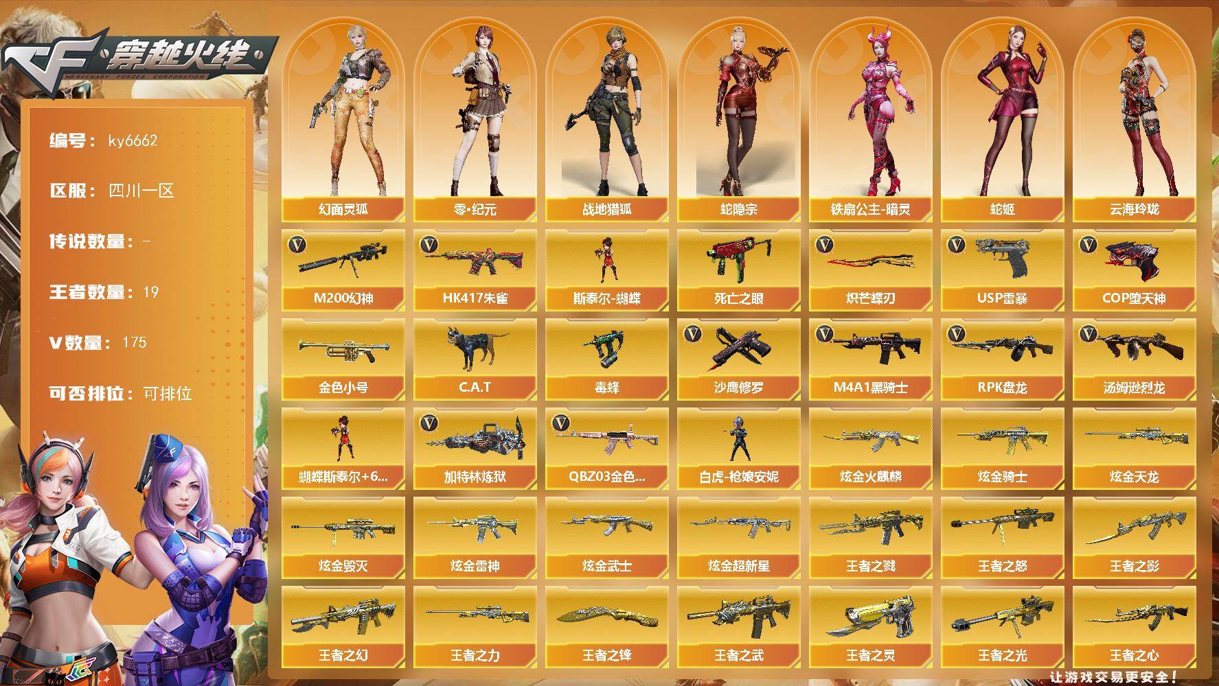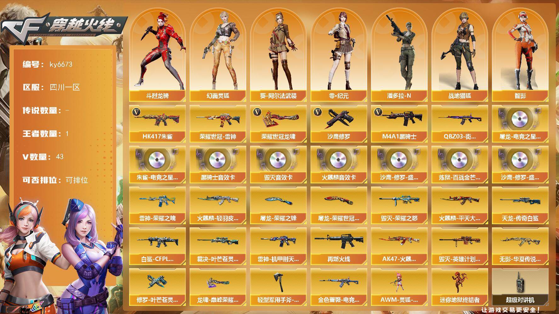 【账号佳】 【可二次实名】四川一区45V-1王者武器数-0炫金武器数 【传说角色】:传说星骇 【热门武器】:HK417-朱雀,荣耀世冠-雷神,QBZ03-街机,M4A1-黑骑士,沙鹰-修罗*2,荣耀世冠-龙啸 【音效卡】:屠龙-电竞之星-竞星跃动音效卡,AK47-火麒麟音效卡,M4A1-黑骑士音效卡,Barrett-毁灭音效卡,HK417-朱雀-电竞之星-竞星跃动音效卡,沙鹰-修罗-盛典舞曲音效卡*2,炼狱-百战金芒-庆典舞曲音效卡 【皮肤】:白虎-白鲨-CFPLS23冠军,金色蔷薇-电竞之星 皮肤,裁决-叶芒苍灵 皮肤,雷神-荣耀之魄,雷神-机甲刑天皮肤,M4A1-再燃火线,火麒麟-轻羽皮肤,火麒麟-平天大圣,AK47-火麒麟-百城23冠军皮肤,毁灭-荣耀之怒,毁灭-英雄计划 皮肤,无影-华夏传说 皮肤,AWM-天龙-传奇白鲨,修罗-叶芒苍灵 皮肤,屠龙-荣耀之锋,屠龙-荣耀世冠AG*2,龙啸-巅峰荣耀 皮肤,轻型军用手斧-再燃火线 【角色】:零·纪元,战地猎狐,奇洋探员,乔伊教练,云海玲珑,葵-阿尔法武装,幻面灵狐,斗烈龙骑,暗夜-X,芳心审判者,飞虎队-X,娟娟,灵狐者-X,龙儿,龙儿-小淘气,曼陀罗-X,娜塔莉娅,潘多拉-甜心教官,蜀雪,维纳斯,夜玫瑰-宠粉,樱-青春偶像,影武者-X,游珑儿,智影,潘多拉-N 【人偶武器】:迷你地狱终结者,AWM-灵狐-15周年嘉年华 【暴走生化】:超级对讲机 【挑战大师】:AK47-冰龙粉碎者,试炼破坏者III,KAC-圣炎切割者III,神圣爆裂者-末日III 【英雄级武器】:AK47-火麒麟,M4A1-雷神*2,M4A1-黑骑士,HK417-朱雀,无影-神兵利器,黑武士-锦绣游龙,9A91-烈火,王者之心-觉醒版,荣耀世冠-雷神,HK417-朱雀-电竞之星,机械迷城-穹宇,天罚-斗烈龙驹,Barrett-毁灭,AWM-裁决,炼狱-百战金芒,AA-12-雷霆,沙鹰-修罗*2,柯尔特-电竞装甲,USP-冥王,屠龙*2,荣耀世冠-龙啸,麒麟刺-百战金芒,丛林匕首-玄豹,屠龙-电竞之星,屠龙-斗烈龙驹,高爆手雷-玄豹,闪光弹-玄豹,烟雾弹-玄豹,M4A1-赤狱骑士,M4A1-苍鸣雷神,AK47-竞魂无影 【其他武器】:源-黑龙,源·雷神,源·黑骑士,M4A1-青龙-掌上穿越火线,源-金色蔷薇,金色蔷薇-狼王,魂·QBZ03-金色蔷薇-萌杀,魂·英雄-湾区光枢,裁决-青叶星芒,魂·裁决-凤灵,魂·裁决-新人王绿豆,源·毁灭,灵·Barrett-金色蔷薇-甜蜜火力,魂·Barrett-朱雀-锦鲤,灵·Barrett-朱雀-炫光*2,加特林-炼狱-掌火,魂·修罗-迷彩,魂·天神-宇航兔兔,灵·天神-穹宇,源·擎天-萌杀,灵·麒麟刺-穹宇 【道具】:BS战队炫彩背包,云山科技背包,亚洲杯纪念炫彩背包,炫彩背包-诺拉,百战金芒炫彩背包,背包-洛丽塔,超级背包,女皇终结者-魔龙之吻,救世主-黑桃战神,绿色巨人,灵魂忍者,迷雾幽灵*2,生化弹匣,夺命之镰,防化服*3,星辰流光-枪王排位,流光-鎏金之域,流光-再燃火线,枪王排位28赛季金色流光,枪王排位29赛季金色流光,语音特效-盛典烟火,萌萌小葵表情,炽雪表情,云海游龙表情,防弹头盔*7,防弹衣*8,C4工具钳*8,手雷包*8 【特殊枪械】:1黑骑士