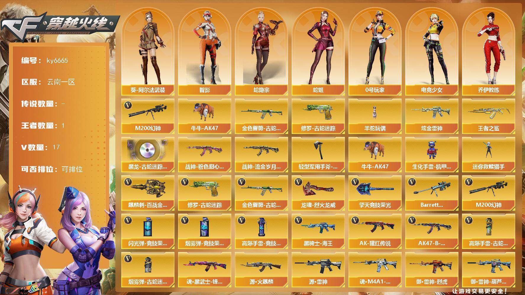 【账号佳】 【可二次实名】云南一区15V-1王者武器数-1炫金武器数 【热门武器】:M200-幻神,金色蔷薇-古蛇迷踪,修罗-古蛇迷踪,牛牛-AK47,羊驼玩偶 【王者炫金武器】:王者之鲨,炫金雷神 【音效卡】:黑龙-古蛇迷踪音效卡 【皮肤】:战神-粉色甜心皮肤,战神-流金岁月皮肤,轻型军用手斧-再燃火线 【角色】:蛇隐宗,乔伊教练,葵-阿尔法武装,暗夜-X,电竞少女,芳心审判者,虎妞,兰-新年限定,0号玩家,灵狐-花神,蛇姬,雪莉杨-摸金校尉,智影 【人偶武器】:迷你救赎猎手,牛牛-AK47,生化手雷-机甲核心*2 【英雄级武器】:金色蔷薇-古蛇迷踪,AK-47-猩红传说,AK47-B-战神*2,黑骑士-海王,M200-幻神,Barrett-暗月传说,修罗-古蛇迷踪,擎天-竞技荣光,麒麟刺-百战金芒,龙啸-烈火龙威,高爆手雷-竞技荣光,高爆手雷-古蛇迷踪,闪光弹-竞技荣光*2,烟雾弹-竞技荣光,烟雾弹-古蛇迷踪 【其他武器】:源·火麒麟,源·雷神,魂·M4A1-雷神-化蛇,御·雷神-烈虎,御·雷神-葫芦兄弟,魂·黑骑士-幻能朋克,御·黑骑士-冰魄,御·黑骑士·哪吒闹海*2,魂·黑武士-锋芒破茧,御·超新星-圣诞,源·机械迷城,魂·HK417-朱雀-凤灵*2,魂·QBZ03-金色蔷薇-古蛇迷踪,魂·QBZ03-金色蔷薇-萌杀,魂·QBZ03-金色蔷薇-蛇姬,QBZ03-文殊坊,魂·9A91·烈火-电子连击,魂·玫瑰精灵-傲梅,源·天龙,魂·天龙-彼岸花,魂·裁决-凤灵,魂·裁决-羽掣,魂·毁灭-航天科技,魂·毁灭-神秘黑洞,御·毁灭-黑大圣,御·毁灭-葫芦兄弟,魂·Barrett-金色蔷薇-蛇姬,源·Barrett-朱雀,灵·Barrett-朱雀-炫光,魂·炼狱-电子连击,魂·炼狱-玩具枪,魂·炼狱-月,魂·修罗-现代金属,魂·天神-宇航兔兔,魂·屠龙-春桃,魂·擎天-破浪10年,源-擎天,魂·龙啸-玩具枪,魂·麒麟刺-神秘黑洞,魂·麒麟刺-月 【道具】:CFS限定背包,亚洲杯纪念炫彩背包,古蛇迷踪炫彩背包,背包-洛丽塔,超级背包,女皇终结者-魔龙之吻,绿色巨人,灵魂忍者*2,变异宝贝,妖姬,迷雾幽灵,生化弹匣,夺命之镰,防化服*2,枪王排位28赛季金色流光,枪王排位29赛季金色流光,古蛇迷踪打击特效,蛇隐宗表情,EP战队击杀图标,防弹头盔*3,防弹衣*3,C4工具钳*3,手雷包*3 【特殊枪械】: