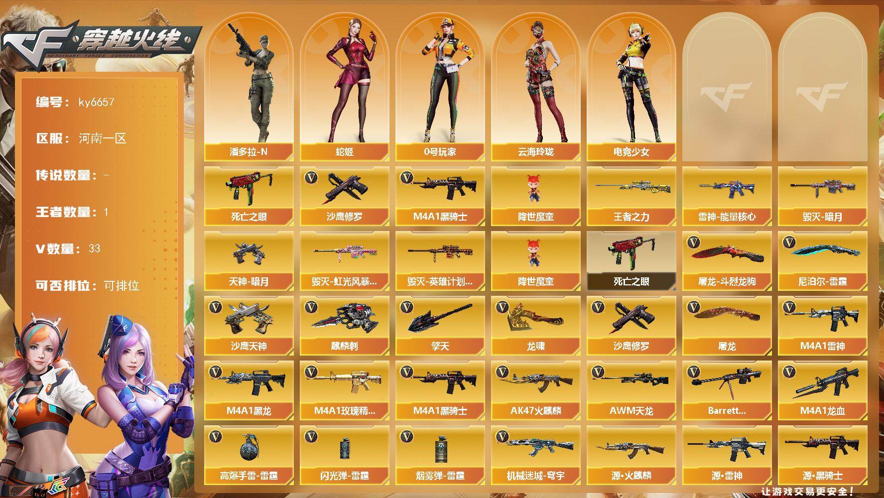 【账号佳】 【可二次实名】河南一区33V-1王者武器数-0炫金武器数 【热门武器】:死亡之眼,M4A1-黑骑士*2,降世魔童,沙鹰-修罗*3 【王者炫金武器】:王者之力 【皮肤】:雷神-能量核心,毁灭-暗月,毁灭-虹光风暴 皮肤,毁灭-英雄计划 皮肤,天神-暗月 【角色】:云海玲珑,电竞少女,0号玩家,蛇姬,潘多拉-N 【人偶武器】:降世魔童 【暴走生化】:死亡之眼 【英雄级武器】:AK47-火麒麟,M4A1-黑龙,M4A1-雷神,M4A1-黑骑士*2,M4A1-龙血,M4A1-玫瑰精灵,机械迷城-穹宇,AWM-天龙,Barrett-毁灭*2,沙鹰-修罗*3,沙鹰-天神*2,屠龙*3,龙啸,擎天,麒麟刺*2,尼泊尔-雷霆,屠龙-斗烈龙驹,高爆手雷-雷霆,闪光弹-雷霆,烟雾弹-雷霆 【其他武器】:源·火麒麟,源·雷神*2,源·黑骑士,魂·黑骑士-破浪10年,御·超新星-圣诞*2,源·武圣,源·机械迷城,魂·龙血-锋芒破茧,魂·HK417-朱雀-凤灵,源·HK417-朱雀,魂·QBZ03-金色蔷薇-蛇姬,QBZ03-文殊坊,源·玫瑰精灵,魂·英雄-湾区光枢,源·天龙,魂·毁灭-神秘黑洞*2,魂·炼狱-电子连击,加特林-炼狱-掌火,魂·天神-宇航兔兔,灵·天神-穹宇,源·武圣glock,魂·擎天-破浪10年,灵·麒麟刺-穹宇 【道具】:BS战队炫彩背包,CFS限定背包,战舰背包,炫彩背包,女皇终结者-魔龙之吻,绿色巨人,灵魂忍者,迷雾幽灵,夺命之镰,防化服*3,枪王排位28赛季金色流光,枪王排位29赛季金色流光,斯沃特表情,EP战队名片,EP战队喷图,EP战队击杀图标,防弹头盔*3,防弹衣*3,C4工具钳*3,手雷包*3 【特殊枪械】:2黑骑士