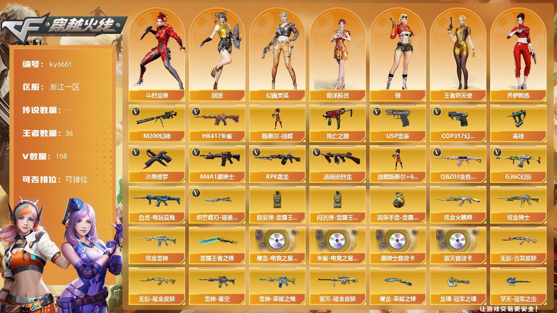 【账号佳】 【可二次实名】浙江一区179V-36王者武器数-3炫金武器数 【传说角色】:传说艾莉莎 【热门武器】:G36C-幻影,QBZ03-金色蔷薇,HK417-朱雀,M200-幻神,死亡之眼,白虎-电玩蓝兔,毒蜂,M4A1-黑骑士*4,汤姆逊-烈龙*7,RPK-盘龙*6,斯泰尔-蝴蝶,USP-雷暴,COP 357-幻灵*2,沙鹰-修罗,炽芒蝶刃-破浪逐光 皮肤 【王者炫金武器】:雷霆王者之锋,高爆手雷-雷霆王者*8,烟雾弹-雷霆王者*5,闪光弹-雷霆王者*5,炫金火麒麟,炫金骑士,炫金雷神 【音效卡】:屠龙-电竞之星-竞星跃动音效卡,M4A1-黑骑士音效卡*2,Barrett-毁灭音效卡,HK417-朱雀-电竞之星-竞星跃动音效卡 【皮肤】:幻神-巅峰荣耀,幻神-电竞之星 皮肤,白虎-量子聚变 皮肤,QBZ03-AG-CFPLS19冠军,雷神-荣耀之魄,雷神-星空,雷神-机甲刑天皮肤,雷神-宇航兔皮肤,雷神-蓝风铃 皮肤,火麒麟-AG战队皮肤,火麒麟-平天大圣,火麒麟-百城,火麒麟-心动糖果,毁灭-荣耀之怒,毁灭耀金皮肤,毁灭-黑大圣皮肤,毁灭-英雄计划 皮肤,M4A1-千变-孔明皮肤,黑龙-能量核心,无影耀金皮肤,无影-霓裳皮肤,战神-粉色甜心皮肤,战神-流金岁月皮肤*3,AK47-B-常胜将军-曹操,AK47-B-常胜将军-刘备,AK47-B-常胜将军-孙权*2,AWM-天龙-传奇70KG,AWM-天龙-传奇白鲨,屠龙-荣耀之锋,龙啸-冠军之啸,擎天-冠军之击,麒麟刺-甜蜜糖果 皮肤,麒麟刺-量子聚变 皮肤,炽芒蝶刃-破浪逐光 皮肤 【角色】:樱,炫,沙漠玫瑰,影豹,隼,研,王者-瞳-闭月羞花,王者樱-热浪之夏,王者炽天使,奇洋探员,乔伊教练,幻面灵狐,斗烈龙骑,暗夜-X,北极狐-X,芳心审判者,风暴女,嘉年华灵狐,娟娟,兰-海滩派对,兰妹妹,灵狐者-X,灵狐者-黄金海岸,灵狐者-七夕宝贝,龙儿,龙儿-小淘气,潘多拉-X,潘多拉-甜心教官,潜龙队-X,邱刚敖,青霞仙子,斯沃特-X,蜀雪,铁骑荣耀,雪莉杨,夜玫瑰-幻能朋克,樱-战斗天使,樱-缤纷夏日,幽,职业选手,团团 【人偶武器】:火麒麟-灵狐,M4A1-雷神-精英刀锋,斯泰尔-蝴蝶,AWM-灵狐-15周年嘉年华*2,M37-葵,COP-旗袍,黄金迷你深渊冰龙,迷你深渊冰龙,迷你牛魔王,黄金迷你裂空之翼,迷你波特博士*2,夺魂,迷你牛牛,迷你火种,迷你生化手雷*6,生化手雷-机甲核心,深渊终结者手雷*4,闪光弹-貂蝉,高爆手雷-大乔,迷你艾比,迷你超能女侍,迷你巨石泰坦-魔花研究所 【暴走生化】:毒蜂,黑龙吞噬者,死亡之眼,超级对讲机 【挑战大师】:神圣爆裂者III,AK47-冰龙粉碎者*3,冰龙粉碎者-白马银枪,激光毁灭者III-白马银枪*2,VEPR-12-金魔,激光毁灭者III,机甲撕裂者III,神圣爆裂者-末日III 【英雄级武器】:M4A1-千变,AK47-火麒麟*2,M4A1-黑龙*2,M4A1-雷神,M4A1-黑骑士*4,AK47-无影,AK12-天启,AK47-黑鲨,HK417-朱雀,M4A1-夜魔,M4A1-幻灵,无影-神兵利器,G36C-幻影,QBZ191-银翼,M4A1-玫瑰精灵,QBZ03-金色蔷薇,9A91-烈火,烈火-动感闪耀,王者之魄-觉醒版,AK-47-猩红传说*4,AK47-B-战神,王者冰魄-觉醒版,黑骑士-海王,AK47-B-常胜将军,M4A1-雷霆王者-觉醒版,白虎-电玩蓝兔,白虎之魄-觉醒版,HK417-朱雀-电竞之星,AK47-B-身先士卒,AK47-B-战士,天罚-斗烈龙驹,AWM-天龙,Barrett-毁灭,AWM-裁决,M200-幻神,Barrett-电竞装甲,Barrett-雷霆王者-觉醒版,王者星神-觉醒版,RPK-盘龙*6,汤姆逊-烈龙*7,烈龙-悦心-觉醒版,AA-12-雷霆,沙鹰-修罗,沙鹰-天神*2,USP-雷暴,COP 357-雷霆王者-觉醒版*3,COP 357-幻灵*2,柯尔特-电竞装甲,柯尔特-竞技荣光*2,破空枪刃-夜魔,USP-冥王,天神-动感闪耀,屠龙,龙啸,马来剑-夜魔,擎天,麒麟刺,幻灵之锋*3,屠龙-动感闪耀,斩神刀-雷暴,王者之锋-觉醒版,王者之啸-觉醒版,雷霆王者之锋-觉醒版,屠龙-电竞之星,屠龙-斗烈龙驹,高爆手雷-雷暴*4,高爆手雷-夜魔*5,高爆手雷-幻灵*7,手雷-动感闪耀,高爆手雷-雷霆王者-觉醒版,闪光弹-雷暴*4,闪光弹-夜魔*5,闪光弹-幻灵*7,闪光弹-雷霆王者-觉醒版*2,烟雾弹-雷暴*4,烟雾弹-夜魔*5,烟雾弹-幻灵*7,烟雾弹-云龙,烟雾弹-雷霆王者-觉醒版*2,AK47-竞魂无影 【其他武器】:源·火麒麟*2,御·黑龙-龙太子,源·雷神,魂·M4A1-雷神-化蛇,魂·雷神-维纳斯,魂·雷神-萌柴,雷神-赛博朋克,源·黑骑士*3,魂·黑骑士-幻能朋克*2,魂·黑骑士-破浪10年*2,御·黑骑士·哪吒闹海*2,源·AK47-黑武士,魂·黑武士-锋芒破茧,源·天启,御·超新星-圣诞,源·武圣,魂·龙血-锋芒破茧,魂·HK417-朱雀-凤灵,源·HK417-朱雀,金色蔷薇-狼王,魂·QBZ03-金色蔷薇-萌杀,源-极光,AWM-裁决-百城联赛天津,魂·裁决-凤灵*2,源·毁灭*2,魂·毁灭-航天科技,魂·毁灭-神秘黑洞,御·毁灭-黑大圣,魂·Barrett-朱雀-锦鲤,魂·Barrett-朱雀- 新春神龙,源·Barrett-朱雀,灵·Barrett-朱雀-炫光,魂·炼狱-电子连击,魂·炼狱-月,加特林-炼狱-掌火,御·炼狱-女娲,魂·修罗-15周年嘉年华,源·天神,魂·天神-阿努比斯,魂·天神-宇航兔兔,灵·天神-炫光,源·武圣glock,魂·屠龙-都是Cfer,源·龙啸*3,魂·龙啸-秦师,魂·麒麟刺-神秘黑洞*2 【道具】:CFS限定背包,云海游龙炫彩背包,全能枪王背包,冰冰企鹅背包-猛男专用,奇洋探员-海龟背包,虎牙炫彩背包,超级背包,黄金生化钩,绿色巨人,灵魂忍者*3,变异宝贝,妖姬,迷雾幽灵,生化弹匣,夺命之镰,防化服*3,金色流光-枪王排位*2,星辰流光-枪王排位,枪王排位28赛季金色流光,枪王排位29赛季金色流光,语音特效-生化,电玩兔兔表情,斯沃特表情,动感闪耀表情,EP战队击杀图标,C4-红龙,防弹头盔*7,防弹衣*7,C4工具钳*6,手雷包*5 【特殊枪械】:蝴蝶斯泰尔+6烈龙,4黑骑士,6烈龙,6盘龙,1蝴蝶斯泰尔