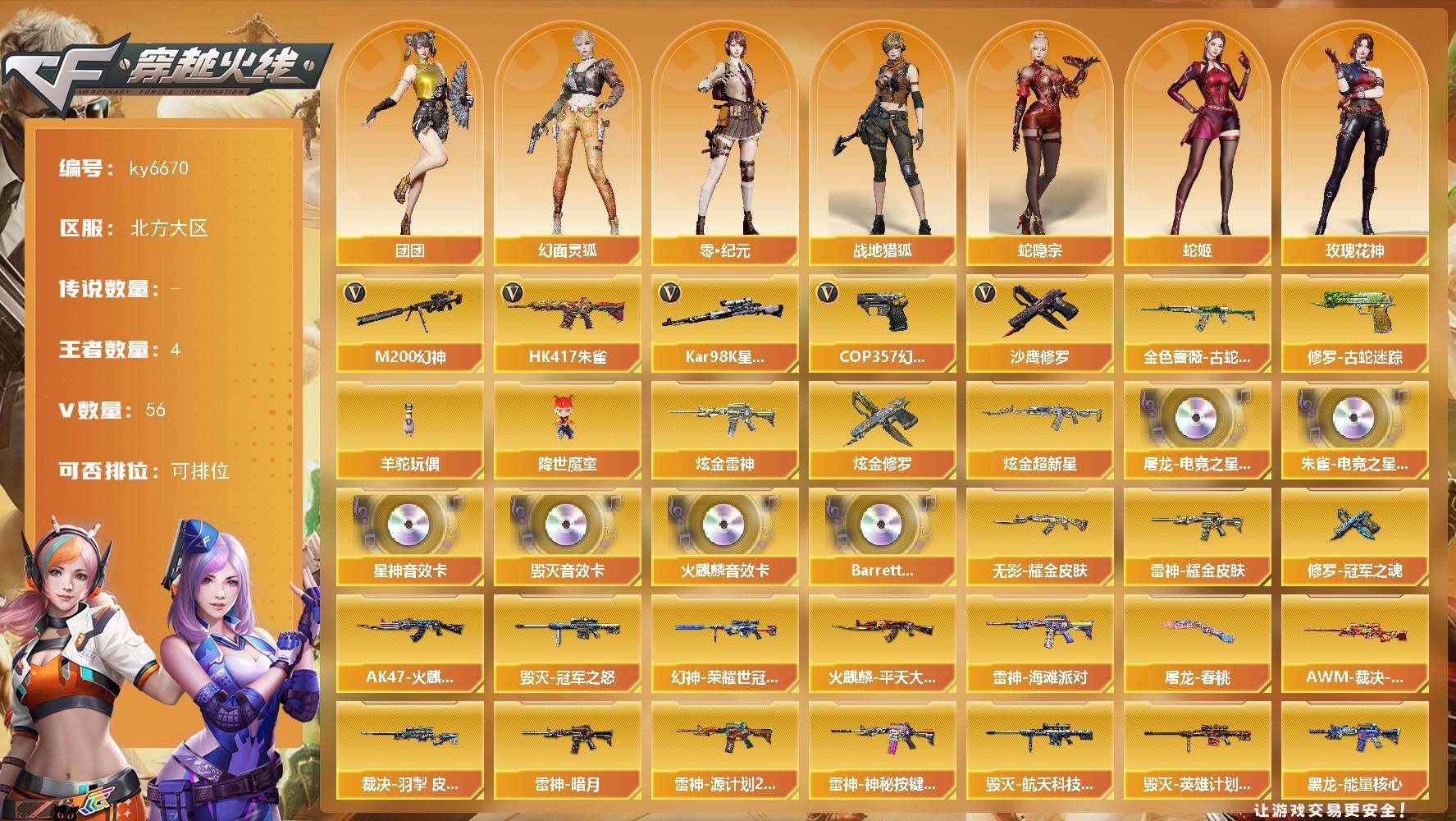 【账号佳】 【可二次实名】北方大区56V-4王者武器数-4炫金武器数 【热门武器】:HK417-朱雀,M200-幻神*2,金色蔷薇-古蛇迷踪,修罗-古蛇迷踪,Kar98K-星神,羊驼玩偶,降世魔童,COP 357-幻灵*3,沙鹰-修罗*4 【王者炫金武器】:炫金雷神,炫金超新星*2,炫金修罗 【音效卡】:Kar98K-星神音效卡,屠龙-电竞之星-竞星跃动音效卡,AK47-火麒麟音效卡,Barrett-毁灭音效卡,HK417-朱雀-电竞之星-竞星跃动音效卡,Barrett-碧霄极光音效卡 【皮肤】:M200-幻神-荣耀世冠白鲨,AWM-裁决-凤灵皮肤,裁决-羽掣 皮肤,雷神-暗月,雷神-耀金皮肤,雷神-海滩派对 皮肤,雷神-源计划2.0专属 皮肤,雷神-神秘按键 皮肤,AK47-火麒麟-传奇EVEN,火麒麟-平天大圣,毁灭-冠军之怒,毁灭-航天科技皮肤,毁灭-英雄计划 皮肤,黑龙-能量核心,无影耀金皮肤,修罗-能量核心*2,修罗-冠军之魂,屠龙-星耀 皮肤,屠龙-春桃 皮肤,屠龙-定军扬威 皮肤 【角色】:零,影豹,零·纪元,战地猎狐,蛇隐宗,乔伊教练,修道士,幻面灵狐,空,暗夜-X,电竞少女,芳心审判者,飞虎队-X,风暴女,嘉年华灵狐,兰-海滩派对,零-水下丽影,灵狐者-职业经理,玫瑰花神,潘多拉-X,潘多拉-甜心教官,蛇姬,兔囡囡,影武者-X,团团 【人偶武器】:迷你钢铁终结者,AWM-灵狐-15周年嘉年华*2,生化手雷-机甲核心,迷你艾比,降世魔童 【暴走生化】:超级对讲机 【挑战大师】:冰龙粉碎者-白马银枪,阐释者III 【英雄级武器】:M4A1-千变,AK47-火麒麟,M4A1-黑龙,M4A1-雷神*2,AK47-无影,AK12-天启,HK417-朱雀,无影-神兵利器,金色蔷薇-古蛇迷踪,QBZ03-独角-III,王者之翼-觉醒版,王者之戮-觉醒版,AK-47-猩红传说,HK417-朱雀-电竞之星,AWM-天龙,Barrett-毁灭,AWM-裁决,M200-幻神*2,Kar98K-星神,炼狱-悦蓝-觉醒版,沙鹰-修罗*4,COP 357-幻灵*3,修罗-古蛇迷踪,屠龙*2,龙啸,麒麟刺,屠龙-电竞之星,高爆手雷-幻灵*5,高爆手雷-古蛇迷踪,闪光弹-幻灵*6,烟雾弹-幻灵*6,烟雾弹-古蛇迷踪,M4A1-赤狱骑士,AK47-竞魂无影,Barrett-碧霄极光 【其他武器】:源·雷神,魂·M4A1-雷神-化蛇,魂·雷神-神秘按键,雷神-极氪汽车,魂·黑骑士-破浪10年,御·黑骑士·哪吒闹海,灵·黑骑士-破界 I,魂·黑武士-锋芒破茧,源·武圣,魂·龙血-锋芒破茧,魂·HK417-朱雀-凤灵,源-金色蔷薇,魂·QBZ03-金色蔷薇-古蛇迷踪,魂·QBZ03-金色蔷薇-萌杀,魂·QBZ03-金色蔷薇-幸运印画,源·玫瑰精灵,魂·天龙-彼岸花,魂·裁决-凤灵,魂·裁决-神秘按键,魂·裁决-羽掣,魂·毁灭-航天科技,魂·毁灭-秦师,魂·毁灭-神秘黑洞,御·毁灭-黑大圣,魂·Barrett-金色蔷薇-蛇姬,灵·Barrett-金色蔷薇-甜蜜火力,魂·Barrett-朱雀-锦鲤,魂·Barrett-朱雀- 新春神龙,灵·Barrett-朱雀-炫光*2,魂·炼狱-电子连击*2,魂·炼狱-玩具枪,魂·炼狱-月,魂·炼狱-蒸汽钟表*2,御·炼狱-女娲,魂·修罗-15周年嘉年华,魂·修罗-迷彩,魂·天神-宇航兔兔,源·武圣glock,魂·擎天-蒸汽钟表,源-擎天,源·龙啸 【道具】:亚洲杯纪念炫彩背包,古蛇迷踪炫彩背包,战舰背包,炫彩背包,背包-葫芦兄弟,超级背包,女皇终结者-魔龙之吻,救世主-黑桃战神,绿色巨人,灵魂忍者,变异宝贝,迷雾幽灵,夺命之镰,防化服*2,金色流光-枪王排位*2,流光-鎏金之域,流光-再燃火线,枪王排位28赛季金色流光,枪王排位29赛季金色流光,古蛇迷踪打击特效,蛇隐宗表情,电玩兔兔表情,动感闪耀表情,防弹头盔*2,防弹衣*2,C4工具钳*2,手雷包*2 【特殊枪械】: