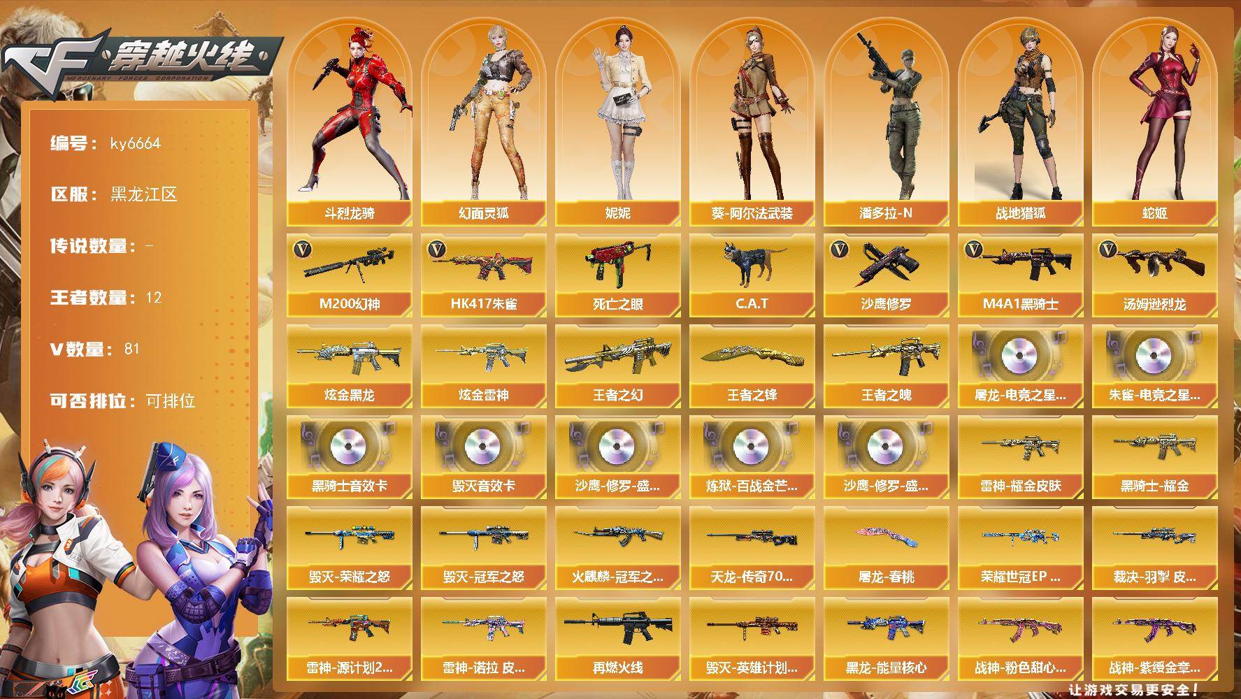 【账号佳】 【可二次实名】黑龙江区84V-12王者武器数-2炫金武器数 【热门武器】:HK417-朱雀,M200-幻神,死亡之眼,C.A.T,M4A1-黑骑士,汤姆逊-烈龙*2,沙鹰-修罗*3 【王者炫金武器】:王者之幻,王者之魄,王者之锋,炫金黑龙,炫金雷神 【音效卡】:屠龙-电竞之星-竞星跃动音效卡,M4A1-黑骑士音效卡,Barrett-毁灭音效卡,HK417-朱雀-电竞之星-竞星跃动音效卡,沙鹰-修罗-盛典舞曲音效卡*2,炼狱-百战金芒-庆典舞曲音效卡 【皮肤】:幻神-荣耀世冠EP 皮肤,裁决-羽掣 皮肤,裁决-星际旅行 皮肤,雷神-耀金皮肤,雷神-源计划2.0专属 皮肤,雷神-诺拉 皮肤,M4A1-再燃火线,火麒麟-冠军之心,毁灭-荣耀之怒,毁灭-冠军之怒,毁灭-英雄计划 皮肤,黑龙-能量核心,黑骑士耀金皮肤,战神-粉色甜心皮肤,战神-紫绶金章皮肤*5,战神-流金岁月皮肤,AWM-天龙-传奇70KG,屠龙-春桃 皮肤*2,轻型军用手斧-再燃火线,龙啸-青青莓果 皮肤 【角色】:魅影,妮妮,战地猎狐,王者玲珑,奇洋探员,乔伊教练,云海玲珑,葵-阿尔法武装,幻面灵狐,斗烈龙骑,空,暗夜-X,风暴女,兰-新年限定,灵狐-花神,灵狐者-X,灵狐者-黄金海岸,灵狐者-职业经理,玫瑰花神,潘多拉-X,潘多拉-甜心教官,潜龙队-X,蛇姬,斯沃特-X,蜀雪,新娜塔莎,雪莉杨,影武者-X,潘多拉-N,雅典娜 【人偶武器】:AWM-灵狐-15周年嘉年华,C.A.T,迷你牛牛,生化手雷-机甲核心,闪光弹-小乔 【暴走生化】:死亡之眼,超级对讲机 【挑战大师】:神圣爆裂者III,AK47-冰龙粉碎者,VEPR-12-金魔,激光毁灭者III,神圣爆裂者-末日III,阐释者III 【英雄级武器】:AK47-火麒麟,M4A1-黑龙,M4A1-雷神*3,M4A1-黑骑士,M4A1-龙血*2,HK417-朱雀,王者之魄-觉醒版,AK-47-猩红传说*6,AK47-B-战神,黑骑士-海王,HK417-朱雀-电竞之星,机械迷城-穹宇,AK47-B-战士,天罚-斗烈龙驹,AWM-天龙,Barrett-毁灭*2,AWM-裁决,M200-幻神,炼狱-百战金芒,汤姆逊-烈龙*2,沙鹰-修罗*3,沙鹰-天神,COP-雷霆,柯尔特-荣耀世冠EP*2,屠龙*5,麒麟刺-堕天神,马来剑-夜魔,尼泊尔-雷霆*2,龙啸-堕天神,斩神刀-雷暴,麒麟刺-百战金芒,王者之锋-觉醒版,屠龙-电竞之星,屠龙-斗烈龙驹,高爆手雷-雷霆*2,高爆手雷-雷暴*2,高爆手雷-堕天神*2,高爆手雷-夜魔,高爆手雷-雷暴王者,闪光弹-雷霆*2,闪光弹-雷暴*2,闪光弹-堕天神*2,闪光弹-夜魔,闪光弹-雷暴王者*4,烟雾弹-雷霆*2,烟雾弹-雷暴*2,烟雾弹-堕天神*2,烟雾弹-夜魔,烟雾弹-雷暴王者*2,烟雾弹-荣耀世冠EP*2,M4A1-赤狱骑士,M4A1-苍鸣雷神,AK47-竞魂无影 【其他武器】:源·火麒麟,源·雷神*3,魂·M4A1-雷神-化蛇,魂·雷神-诺拉,魂·雷神-新春神龙,魂-雷神-萌杀,M4A1-十二生肖·龙-雷神,源·黑骑士,魂·黑骑士-现代金属,魂·黑骑士-幻能朋克,御·黑骑士·哪吒闹海*3,源·武圣*2,源·机械迷城,魂·龙血-锋芒破茧,源·青龙*2,魂·HK417-朱雀-凤灵,源·HK417-朱雀,源-金色蔷薇,魂·QBZ03-金色蔷薇-萌杀,魂·QBZ03-金色蔷薇-蛇姬,魂·9A91·烈火-电子连击,源·玫瑰精灵,魂·英雄-湾区光枢,Barrett-极光-掌火,源·天龙*2,魂·天龙-彼岸花,魂·裁决-凤灵,魂·裁决-神秘按键,魂·裁决-羽掣,源·毁灭,御·毁灭-黑大圣,魂·Barrett-金色蔷薇-蛇姬,魂·Barrett-朱雀-锦鲤,灵·Barrett-朱雀-炫光,魂·炼狱-电子连击*2,加特林-炼狱-掌火,魂·修罗-现代金属,魂·天神-宇航兔兔*2,源·武圣glock,魂·屠龙-惊鸿,魂·擎天-蒸汽钟表,魂·龙啸-秦师,魂·龙啸-玩具枪 【道具】:EP战队炫彩背包,云山科技背包,亚洲杯纪念炫彩背包,女皇终结者-背包,炫彩背包-诺拉,炫彩背包,百战金芒炫彩背包,超级背包,黑桃战神背包,女皇终结者-魔龙之吻,救世主-黑桃战神,绿色巨人,灵魂忍者,妖姬,迷雾幽灵,夺命之镰*2,防化服*3,流光-鎏金之域,流光-再燃火线,枪王排位29赛季金色流光,语音特效-盛典烟火,萌萌小葵表情,热带奇洋表情,动感闪耀表情,云海游龙表情,防弹头盔*6,防弹衣*7,C4工具钳*8,手雷包*7 【特殊枪械】:1黑骑士,2烈龙