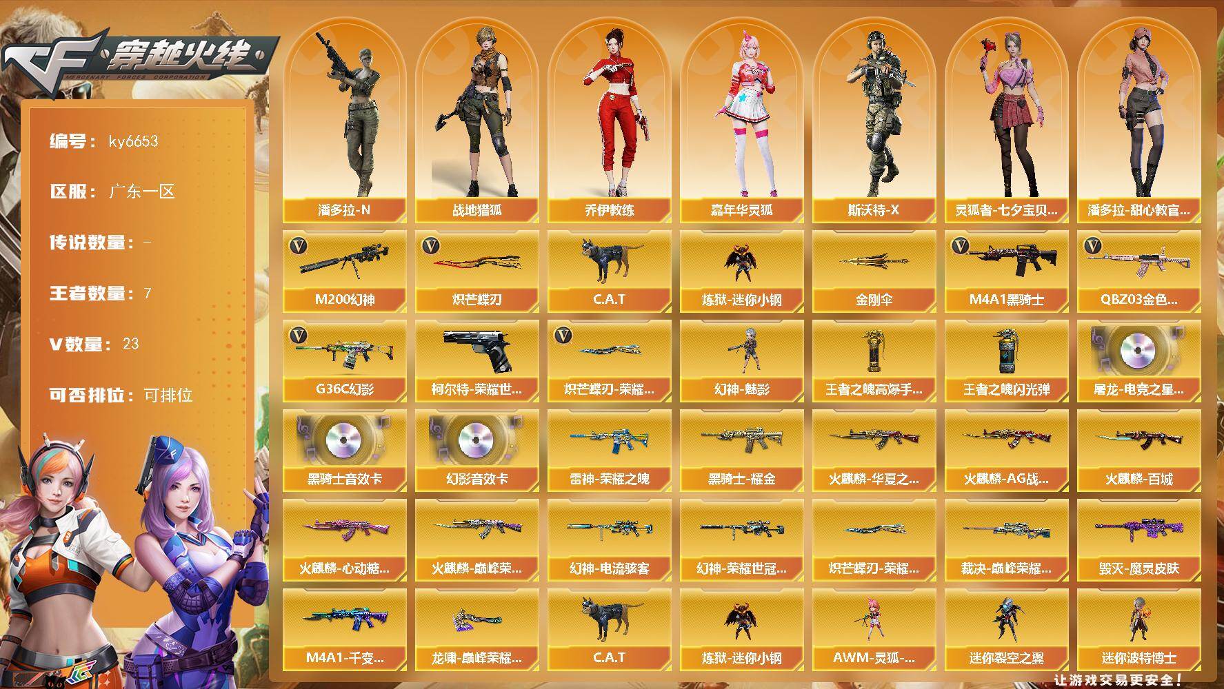 【账号佳】 【可二次实名】广东一区28V-7王者武器数-0炫金武器数 【热门武器】:G36C-幻影,QBZ03-金色蔷薇,M200-幻神,柯尔特-荣耀世冠白鲨2023,C.A.T,炼狱-迷你小钢,M4A1-黑骑士,幻神-魅影,炽芒蝶刃,炽芒蝶刃-荣耀世冠白鲨2023 皮肤,金刚伞 【王者炫金武器】:王者之魄高爆手雷,王者之魄闪光弹 【音效卡】:屠龙-电竞之星-竞星跃动音效卡,M4A1-黑骑士音效卡,G36C-幻影音效卡 【皮肤】:幻神-电流骇客 皮肤,幻神-荣耀世冠白鲨2023 皮肤,裁决-巅峰荣耀 皮肤,雷神-荣耀之魄,火麒麟-AG战队皮肤,火麒麟-华夏之心,火麒麟-百城,火麒麟-巅峰荣耀,火麒麟-心动糖果,毁灭-魔灵皮肤,M4A1-千变-孔明皮肤,黑骑士耀金皮肤,龙啸-巅峰荣耀 皮肤,炽芒蝶刃-荣耀世冠白鲨2023 皮肤 【角色】:魅影,战地猎狐,乔伊教练,风暴女,嘉年华灵狐,娟娟,灵狐者-X,灵狐者-七夕宝贝,龙儿-小淘气,麻雀,潘多拉-X,潘多拉-甜心教官,斯沃特-X,蜀雪,潘多拉-N 【人偶武器】:幻神-魅影,炼狱-迷你小钢,迷你钢铁终结者,AWM-灵狐-15周年嘉年华,C.A.T,迷你裂空之翼*2,迷你波特博士 【挑战大师】:神圣爆裂者III,激光毁灭者III,机甲撕裂者III,神圣爆裂者-末日III,阐释者III,VEPR-12-紫魔 【英雄级武器】:AK47-火麒麟,M4A1-雷神,M4A1-黑骑士,AK47-机械迷城,无影-神兵利器,G36C-幻影,QBZ03-金色蔷薇,白虎之魄-觉醒版,机械迷城-穹宇,M200-幻神,王者之怒-觉醒版,王者之决-觉醒版,王者风神-觉醒版,AA-12-雷霆,沙鹰-天神,柯尔特-荣耀世冠白鲨2023,USP-冥王*2,王者之魂-觉醒版,擎天,炽芒蝶刃,屠龙-电竞之星,高爆手雷-神工天巧,闪光弹-神工天巧,烟雾弹-神工天巧,AK47-竞魂无影 【其他武器】:魂·Barrett-朱雀-锦鲤,加特林-炼狱-掌火,魂·龙啸-秦师 【道具】:BS战队炫彩背包,机械魔影背包-红色,沙漠龙背包-猛男专属,超级背包,女皇终结者-魔龙之吻,救世主-黑桃战神,绿色巨人,灵魂忍者,迷雾幽灵,夺命之镰,防化服*2,金色流光-枪王排位,枪王排位29赛季金色流光,CFPL选手表情-第1套,CFPL选手表情-第2套,防弹头盔*4,防弹衣*4,C4工具钳*4,手雷包*4 【特殊枪械】:1黑骑士
