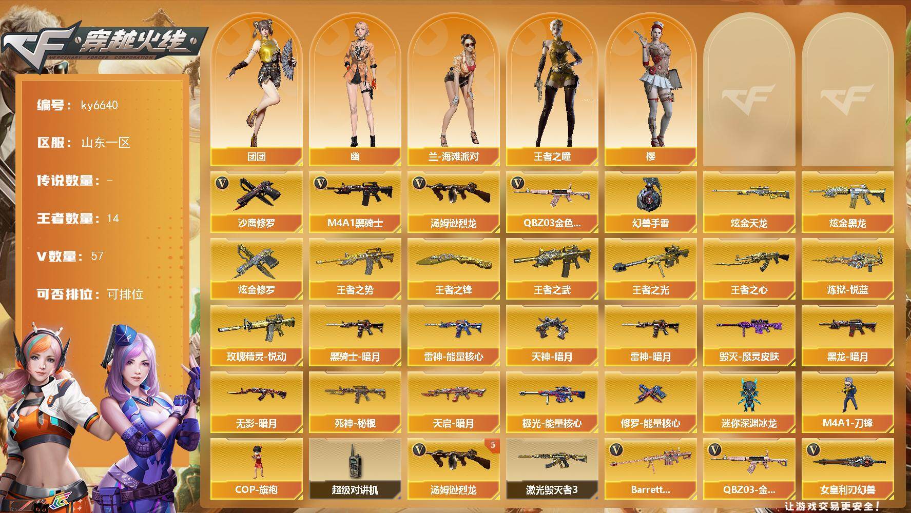 【账号佳】 【可二次实名】山东一区58V-14王者武器数-3炫金武器数 【热门武器】:QBZ03-金色蔷薇,M4A1-黑骑士*3,汤姆逊-烈龙*5,沙鹰-修罗*4,高爆手雷-幻兽*2 【王者炫金武器】:王者之势,王者之武,玫瑰精灵-悦动,王者之心,王者之光*2,炼狱-悦蓝*2,王者之锋*5,炫金黑龙,炫金天龙,炫金修罗 【皮肤】:雷神-暗月,雷神-能量核心,毁灭-魔灵皮肤,黑龙-暗月,黑骑士-暗月,无影-暗月,死神-秘银,天启-暗月*3,极光-能量核心,修罗-能量核心*3,天神-暗月*4 【角色】:樱,王者之瞳,兰-海滩派对,幽,团团 【人偶武器】:COP-旗袍,M4A1-刀锋,迷你深渊冰龙 【暴走生化】:超级对讲机 【挑战大师】:激光毁灭者III 【英雄级武器】:AK47-火麒麟*2,M4A1-黑龙,M4A1-雷神*2,M4A1-黑骑士*3,AK47-无影,M4A1-死神,AK47-黑武士,AK12-天启*3,AN94-超新星,AK47-机械迷城*4,M4A1-玫瑰精灵,QBZ03-金色蔷薇,M4A1-猎神,王者之影-觉醒版,AWM-天龙*4,Barrett-毁灭,Barrett-极光*3,Barrett-金色蔷薇,汤姆逊-烈龙*5,沙鹰-修罗*4,沙鹰-天神,沙鹰-幻兽*2,屠龙*2,龙啸,擎天*2,麒麟刺,女皇利刃-幻兽,高爆手雷-幻兽*2,闪光弹-幻兽*2,烟雾弹-幻兽*2 【其他武器】:魂·雷神-新春神龙,白虎-九尾白狐 【道具】:战舰背包,炫彩背包,超级背包,夺命之镰,防化服,防弹头盔,防弹衣,C4工具钳,手雷包 【特殊枪械】:3黑骑士,5烈龙