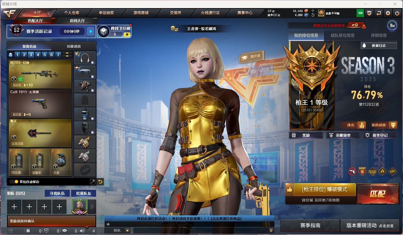 【账号佳】 【可包人脸】hmc ak023323 湖南一区 32v 【m200-竞技荣光】 【98k星神+音效卡】 【qbz金色蔷薇】 【雷神】 【毁灭】 【王者之决】 【天启】 【3近战 斩神刀雷暴 炽芒蝶刃蝴蝶刀】 【手雷 雷暴雷 竞技荣光*3】 【角色 战地猎狐 乔伊教练】----更多炫彩背包/光效/名片/武器具体看图!截图展示段位不代实际段位,赛季更新等不可抗拒因素发生变化、时限道具不保证所剩时间、标题未写送点券默认不送】【主播担保+安全至上+性价比 买号卖号只选金牌商家一左友】