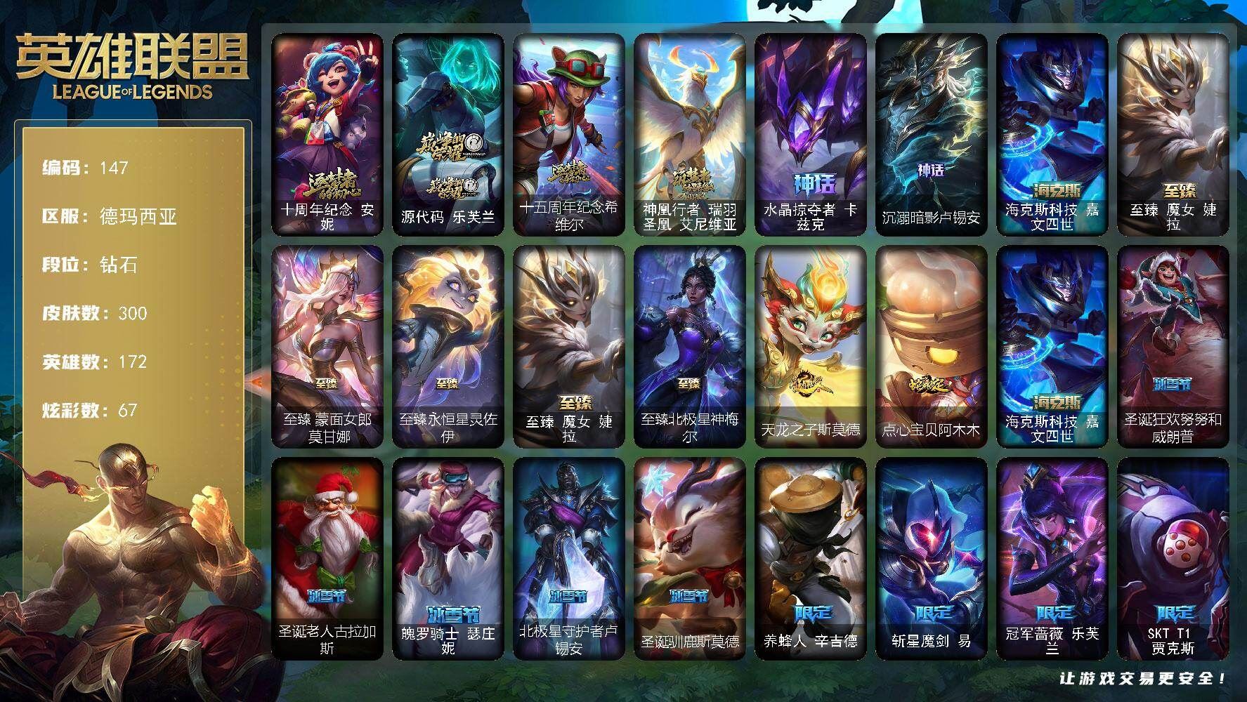【账号佳】 【可二次实名】可二次 德玛西亚 钻石段位-172英雄-300皮肤-67炫彩-0终极-11神话-24限定-33传说-71史诗【神话皮肤】:十周年纪念安妮,源代码乐芙兰,十五周年纪念希维尔,神凰行者瑞羽圣凰艾尼维亚,水晶掠夺者卡兹克,沉溺暗影卢锡安,海克斯科技嘉文四世,至臻魔女婕拉【热门头像】:爱意绵绵头像【至臻皮肤】:至臻蒙面女郎莫甘娜,至臻永恒星灵佐伊,至臻魔女婕拉,至臻北极星神梅尔【臻彩皮肤】:无畏骑士瑟庄妮赤子初心,玉剑传说翼剑仙珠光,霸天异形卡兹克刹那银光,破败军团厄运小姐灵岛征伐使,可爱可爱粉红红布里茨,魔女阿卡丽虚荣,净雪之月莫甘娜冬虹【年限皮肤】:天龙之子斯莫德,点心宝贝阿木木【海克斯皮肤】:海克斯科技嘉文四世【冰雪限定】:圣诞狂欢努努和威朗普,圣诞老人古拉加斯,魄罗骑士瑟庄妮,北极星守护者卢锡安,圣诞驯鹿斯莫德【限定皮肤】:养蜂人辛吉德,斩星魔剑易,冠军蔷薇乐芙兰,SKTT1贾克斯,SSW雷恩加尔,SSW锤石,SKTT1阿兹尔,SKTT1伊莉丝,SKTT1娜美,玉剑传说舞剑仙,海贼瑞兹,南瓜头费德提克,破空枪骑孙悟空,波比的巧克力工坊,防暴天使凯尔,双城之战2救世主维克托【传说皮肤】:铁哥们儿奥拉夫,地狱之门卫士加里奥,大天使长米迦勒凯尔,战场女武神凯尔,源计划林易,墨之影武者易,黑夜使者索拉卡,约德尔国队长提莫,幻灵战斗队长厄运小姐,恶魔之刃泰达米尔,鬼魂新娘莫甘娜,双重冰晶艾尼维亚,电玩女神娑娜,未来战士凯特琳,女帝卡特琳娜,上古战魂魔腾,源计划泯灭雷克顿,地狱行者孙悟空,银河魔装机神兰博,炼狱魔犬内瑟斯,青花瓷伊泽瑞尔,黎明使者锐雯,冰霜亚龙希瓦娜,焰尾妖狐阿狸,符文战熊沃利贝尔,苍穹之光韦鲁斯,泳池派对吉格斯,霸天异形卡兹克,灌篮高手德莱厄斯,神王德莱厄斯,暗星尊烬,西部魔影卢锡安,星之守护者洛,各种道具详情看截图、低价出售找回包 赔、截图展示段位不代 表实际段位,如赛季更新等不可抗拒因素发生变化、时限道具不保证所剩时间、标题未写送点劵默认不送【卖号买号首选亿梦】