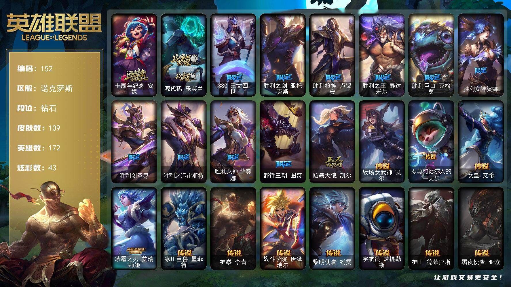 【账号佳】 【可二次实名】可二次QQ 【电信】钻石段位-172英雄-109皮肤-43炫彩-0终极-2神话-12限定-13传说-35史诗【神话皮肤】:十周年纪念安妮,源代码乐芙兰【限定皮肤】:SSG嘉文四世,胜利之剑亚托克斯,胜利枪神卢锡安,胜利之王泰达米尔,胜利巨口克格莫,胜利女神娑娜,胜利剑圣易,胜利之运崔斯特,胜利女神菲奥娜,都铎王朝图奇,防暴天使凯尔【传说皮肤】:战场女武神凯尔,提莫约德尔人的一大步,女皇艾希,冰霜之刃艾瑞莉娅,冰川巨兽墨菲特,神拳李青,战斗学院伊泽瑞尔,黎明使者锐雯,宇航员诺提勒斯,神王德莱厄斯,黑夜使者亚索,西部魔影卢锡安,星之守护者霞【史诗皮肤】:铁钩船长费德提克,圣光审判凯尔,钢铁之心希维尔,圣洁化身索拉卡,战争血统蒙多,掠星魔刃卡萨丁,夜行义贼艾瑞莉娅,沙漠风暴卡特琳娜,三昧真火孙悟空,至高之拳李青,屠龙勇士薇恩,苍穹之光薇恩,深海妖姬卡西奥佩娅,铁血猎手奈德丽,军神战甲波比,冰川勇者伊泽瑞尔,铁甲雄心盖伦,腥红之月泰隆,侏罗纪化石克格莫,星际迷航拉克丝,暗影妖狐阿狸,黑帮教父格雷福斯,海牛猎手菲兹,虚空海灵菲兹,铁血猎人雷恩加尔,沙之守护卡兹克,暗星卡兹克,生化骑士德莱厄斯,最后一只恐龙纳尔,西部牛仔亚索,黑帮狂花金克丝,源计划雷卢锡安,冲击之刃劫,时之砂艾克,炼狱魔女蔚【王者皮肤】:五杀摇滚鼓手奥拉夫,星空之门内瑟斯,西部牛仔崔斯特【勇士皮肤】:烈焰猛士奥拉夫【其他皮肤】:小红帽安妮,社会名流乐芙兰,暗影易,玉剑传说无极,黑暗骑士阿利斯塔,咖啡甜心希维尔,约德尔海贼团崔丝塔娜,西部牛仔厄运小姐,勇敢的心泰达米尔,光明骑士贾克斯,武神贾克斯,惊天魔盗伊芙琳,北风冻原图奇,自由女神卡尔萨斯,狂欢阿木木,恐怖之源萨科,虚空前世卡萨丁,塔里克辉盾,荒野治安官凯特琳,战场BOSS布里茨,银白枪骑布里茨,黑色玫瑰假面舞会伊莉丝,末日余生布兰德,摩登骇客薇恩,沙暴巨蝎斯卡纳,乡村农夫古拉加斯,冒险精神伊泽瑞尔,光明哨兵锐雯,欲望之主泽拉斯,怒之火炮格雷福斯,绒毛菲兹,坚韧不屈沃利贝尔,初号机维克托,玉剑传说无双,胜利女神菲奥娜,灵魂收割者德莱文,泳池派对德莱文,地下都市梦魇德莱厄斯,杰斯光明之锤,KDA卡莎,KDAALLOUT卡莎,奥德赛亚索,女帝奇亚娜,源代码娜美,各种道具详情看截图、低价出售找回包 赔、截图展示段位不代 表实际段位,如赛季更新等不可抗拒因素发生变化、时限道具不保证所剩时间、标题未写送点劵默认不送【卖号买号首选亿梦】