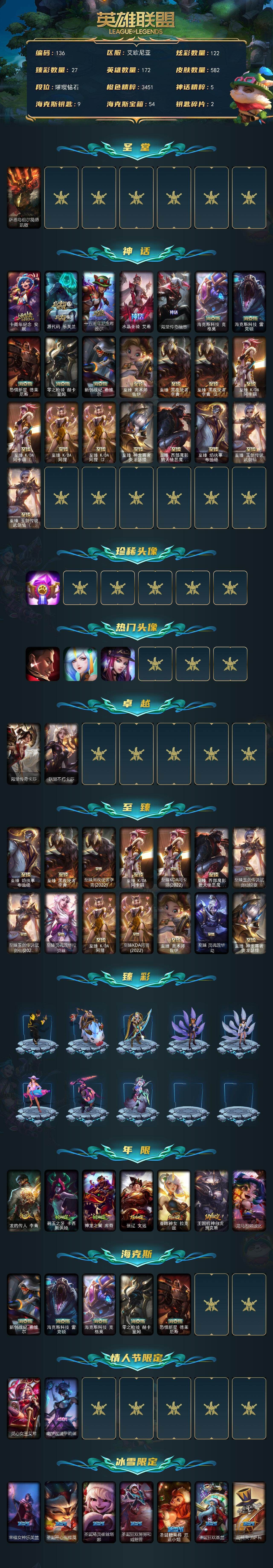 【账号佳】 【可二次实名】可二次 艾欧尼亚【钻石段位-172英雄-582皮肤-122炫彩-3终极-24神话-106限定-53传说-133史诗】【圣堂皮肤】:萨恩乌祖尔莫德凯撒【卓越皮肤】:殿堂传奇卡莎,联盟不朽卡莎【至臻皮肤】:至臻焰执事布兰德,至臻黑夜使者李青,至臻黑夜使者李青(2022),至臻KDA阿卡丽,至臻KDA阿卡丽(2022),至臻西部魔影猎天使恶魔泰隆,至臻玉剑传说武剑仙锐雯,至臻玉剑传说武剑仙(2022),至臻灵魂莲华拉克丝,至臻KDA阿狸,至臻KDA阿狸(2022),至臻奥术师佐伊,至臻灵魂莲华劫,至臻神龙尊者炎龙瑟提【臻彩皮肤】:龙的传人李青飞龙在天,天龙之子卡莎飞龙乘云,无畏骑士瑟庄妮赤子初心,冠军之箭艾希凯旋圣装,墨之影武者亚索金墨耀影,偶像歌手阿狸皇室鸢尾,偶像歌手阿狸极地雪莲,泳池派对凯特琳粉红冰川,女帝厄运小姐纹章之刻印敏锐,源计划毁灭派克幻灭,黎明使者薇恩虹辉,星之守护者娑娜未来之光,魔女阿卡丽虚荣,净雪之月莫甘娜冬虹,霸天异形卡兹克黄金异端,北极星守护者卢锡安圣洁光带,黑夜使者嘉文四世白夜,王国机神白虎贾克斯云霄,心之钢伊泽瑞尔天纵才华【年限皮肤】:龙的传人李青,碧玉之牙卡西奥佩娅,神龙之翼库奇,张辽文远,春晖神女拉克丝,王国机神白虎贾克斯,龙马烈焰波比【海克斯皮肤】:新创战纪希维尔,海克斯科技雷克顿,海克斯科技克格莫,零之枪骑赫卡里姆,恐惧新星德莱厄斯【终极皮肤】:大元素使拉克丝,灵魂守卫乌迪尔,未来战士伊泽瑞尔【限定皮肤】:诺斯费拉图弗拉基米尔,送披萨的小姐姐希维尔,冠军之箭艾希,Fnatic古拉加斯,Fnatic迦娜,Fnatic卡尔萨斯,暗杀星奥莉安娜,暗杀星蒙多,暗杀星努努和威朗普,暗杀星慎,SKTT1婕拉,SSW辛吉德,SSW图奇,SSW泰隆,SSW雷恩加尔,SSW锤石,SKTT1阿利斯塔,SKTT1卡莉丝塔,SKTT1瑞兹,SKTT1伊莉丝,SKTT1艾克,SKTT1奥拉夫,SKTT1烬,SKTT1娜美,SKTT1辛德拉,SKTT1扎克,iG菲奥娜,iG艾瑞莉娅,iG卡蜜尔,iG卡莎,iG乐芙兰,iG洛,安妮梦游仙境,电玩女神厄运小姐,星之守护者伊泽瑞尔,玉剑传说舞剑仙,胜利女神菲奥娜,海贼瑞兹,南瓜头费德提克,鬼影重重魔腾,鬼影森森茂凯,无头骑士赫卡里姆,魅惑女巫奈德丽,泳池派对厄运小姐,泳池派对菲奥娜,泳池派对凯特琳,泳池派对雷克顿,泳池派对普朗克,泳池派对瑟提,泳池派对佐伊,机械迷城加里奥,蓝色忧郁崔斯特,蒙多蒙多,密林猎手提莫,女猎手希维尔,外星装甲库奇,黯然心伤阿木木,暗影沃里克,波比的巧克力工坊,创战纪希维尔,勇者奈德丽,都铎王朝图奇,玉剑传说舞龙卫,钢铁之翼艾尼维亚,红桃杰克崔斯特,防暴士兵格雷福斯,海之歌艾希,海之歌永恩,惊悚派对阿木木,克格汪【传说皮肤】:铁哥们儿奥拉夫,地狱之门卫士加里奥,血石领主弗拉基米尔,大天使长米迦勒凯尔,战场女武神凯尔,霸天零式赛恩,提莫约德尔人的一大步,太空律动律动队长提莫,驯龙炮手崔丝塔娜,合金巨兽努努和威朗普,女皇艾希,源计划联合艾希,鬼魂新娘莫甘娜,双重冰晶艾尼维亚,黯晶凤凰艾尼维亚,律政大亨蒙多,电玩女神娑娜,冰霜之刃艾瑞莉娅,女主播迦娜,红色男爵库奇,最终BOSS维迦,未来战士凯特琳,苹果机器人布里茨,冰川巨兽墨菲特,地狱行者孙悟空,神拳李青,神龙尊者圣龙李青,第三类接触黑默丁格,黑夜使者亚索,星之守护者金克丝,星之守护者洛,黎明使者永恩】各种道具详情看截图、低价出售找回包 赔、截图展示段位不代 表实际段位,如赛季更新等不可抗拒因素发生变化、时限道具不保证所剩时间、标题未写送点劵默认不送【卖号买号首选亿梦】