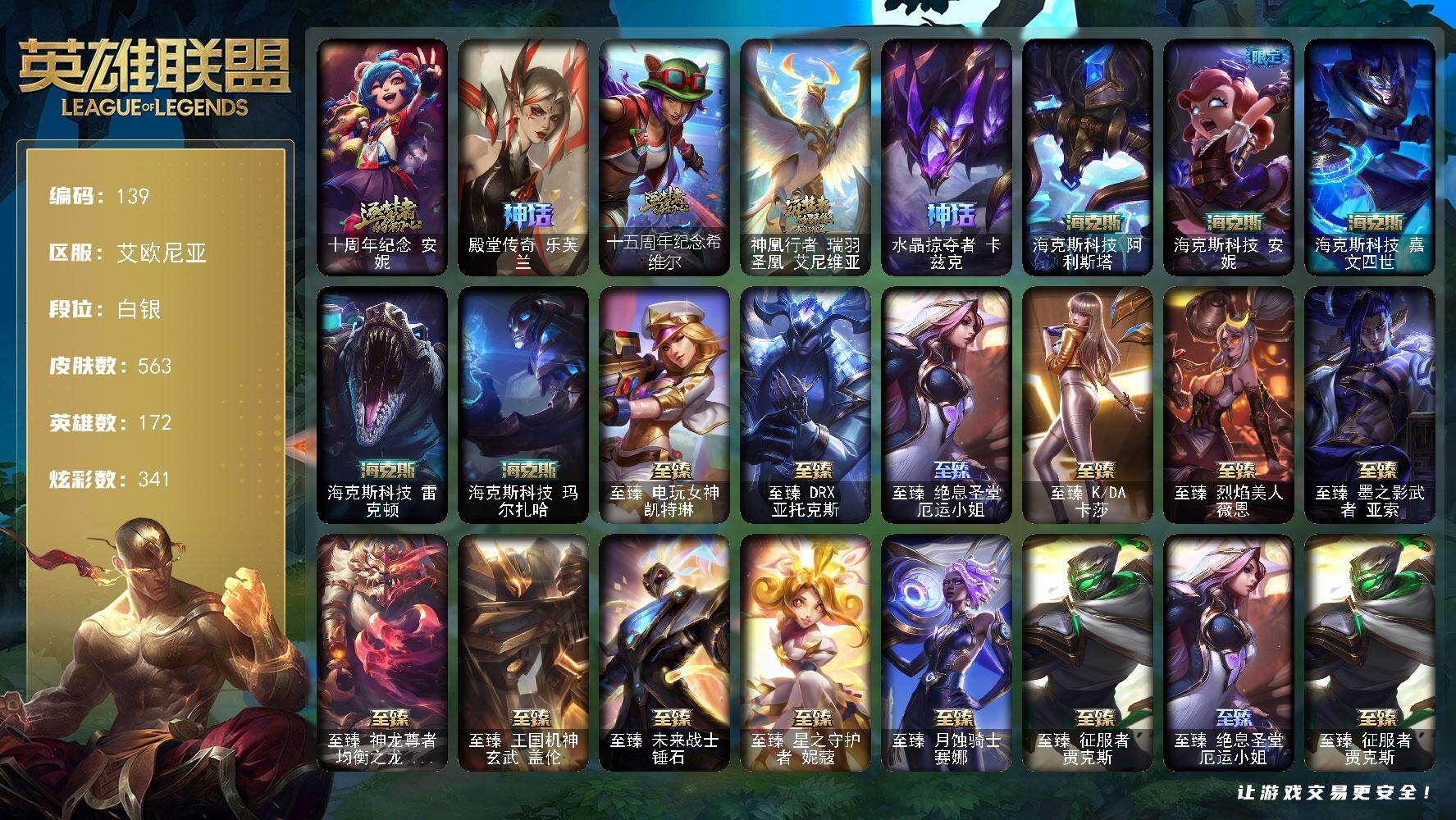 【账号佳】 【可二次实名】可二次QQ 【LOL电信】白银段位-172英雄-563皮肤-341炫彩-3终极-24神话-75限定-63传说-124史诗【神话皮肤】:十周年纪念安妮,殿堂传奇乐芙兰,十五周年纪念希维尔,神凰行者瑞羽圣凰艾尼维亚,水晶掠夺者卡兹克,海克斯科技阿利斯塔,海克斯科技安妮,海克斯科技嘉文四世,海克斯科技雷克顿,海克斯科技玛尔扎哈,至臻征服者贾克斯,至臻电玩女神凯特琳,至臻DRX亚托克斯,至臻绝息圣堂厄运小姐,至臻KDA卡莎,至臻烈焰美人薇恩,至臻墨之影武者亚索,至臻神龙尊者均衡之龙沃利贝尔,至臻王国机神玄武盖伦,至臻未来战士锤石,至臻星之守护者妮蔻,至臻月蚀骑士赛娜【至臻皮肤】:至臻绝息圣堂厄运小姐,至臻征服者贾克斯,至臻电玩女神凯特琳,至臻烈焰美人薇恩,至臻王国机神玄武盖伦,至臻灵魂莲华拉克丝,至臻神龙尊者均衡之龙沃利贝尔,至臻凯旋将军德莱厄斯,至臻KDA卡莎,至臻墨之影武者亚索,至臻月蚀骑士赛娜,至臻DRX亚托克斯,至臻未来战士锤石,至臻星之守护者妮蔻【臻彩皮肤】:天龙之子卡莎飞龙乘云,无畏骑士瑟庄妮赤子初心,墨之影武者亚索金墨耀影,冰雪游神巴德炫金,神龙尊者圣龙李青龙腾云起,玉剑传说无极麒麟,星之守护者金克丝黑洞,霸天异形卡兹克刹那银光,灵魂莲华锐雯流火,可爱可爱粉红红布里茨,殿堂传奇乐芙兰登神,魔女阿卡丽虚荣,净雪之月莫甘娜冬虹,心之钢伊泽瑞尔天纵才华【年限皮肤】:神龙之翼库奇,纳财大帝塔姆,王国机神朱雀蕾欧娜,王国机神苍狼瑟提,猛虎下山赵信,天龙之子斯莫德,点心宝贝阿木木【海克斯皮肤】:海克斯科技安妮,海克斯科技阿利斯塔,海克斯科技雷克顿,海克斯科技嘉文四世,海克斯科技玛尔扎哈【情人节限定】:穿心之剑菲奥娜,幽梦玫瑰辛德拉【冰雪限定】:幸福女神乐芙兰,圣诞开心鬼提莫,圣诞狂欢努努和威朗普,圣诞糖果棒厄运小姐,圣诞狂欢基兰,胡桃夹子萨科,邪恶圣诞老人维迦,喜庆之树茂凯,雪默丁格,圣诞玩偶波比,圣诞老人古拉加斯,圣诞驯鹿克格莫,魄罗骑士瑟庄妮,冰雪节辛吉德,冰雪节格雷福斯,冰雪女神辛德拉【终极皮肤】:大元素使拉克丝,DJ娑娜,未来战士伊泽瑞尔【限定皮肤】:地底世界崔斯特,冠军典狱长锤石,冠军之矛卡莉丝塔,冠军之箭艾希,冠军掠夺者卡兹克,2021全球总决赛嘉文四世,Fnatic迦娜,Fnatic嘉文四世,暗杀星努努和威朗普,暗杀星伊泽瑞尔,SKTT1劫,SKTT1婕拉,SSW辛吉德,SSW图奇,SSW雷恩加尔,SKTT1雷克顿,SKTT1瑞兹,SKTT1辛德拉,iG菲奥娜,iG卡蜜尔,iG卡莎,iG洛,胜利之树茂凯,胜利女神奥莉安娜,胜利之剑亚托克斯,胜利凤凰艾尼维亚,胜利之王泰达米尔,胜利巨口克格莫,胜利女神娑娜,胜利剑圣易,胜利之运崔斯特,鬼影重重魔腾,鬼影森森茂凯,无头骑士赫卡里姆,克烈古拉伯爵,魅惑女巫辛德拉,魅惑女巫娜美,泳池派对厄运小姐,泳池派对格雷福斯,泳池派对李青,泳池派对佐伊,暗影沃里克,野兽猎人瑟庄妮,勇者奈德丽,电玩战魂赫卡里姆,都铎王朝图奇,玉剑传说舞龙卫,制胜金靴李青,防暴士兵辛吉德,防暴天使凯尔【传说皮肤】:铁哥们儿奥拉夫,地狱之门卫士加里奥,魔幻卡牌崔斯特,战地机甲厄加特,邪鸦魅影乐芙兰,血石领主弗拉基米尔,战场女武神凯尔,钢铁之翼凯尔,恶魔男爵瑞兹,霸天零式赛恩,提莫约德尔人的一大步,烈焰雄心崔丝塔娜,驯龙炮手崔丝塔娜,女皇艾希,源计划联合艾希,恶魔之刃泰达米尔,鬼魂新娘莫甘娜,至尊魔女莫甘娜,魔女伊芙琳,绅士科加斯,战地巨兽科加斯,律政大亨蒙多,电玩女神娑娜,灵能特工娑娜,红色男爵库奇,女警狙击凯特琳,战斗学院凯特琳,冰川巨兽墨菲特,上古战魂魔腾,源计划泯灭雷克顿,地狱行者孙悟空,神拳李青,神龙尊者圣龙李青,源计划净化薇恩,第三类接触黑默丁格,炼狱魔犬内瑟斯,战斗学院伊泽瑞尔,源计划超体莫德凯撒,耀星女神拉克丝,枯萎之壤泽拉斯,黯黑魔龙希瓦娜,焰尾妖狐阿狸,偶像歌手阿狸,光明哨兵格雷福斯,苍穹之光韦鲁斯,宇航员诺提勒斯,女校长菲奥娜,泳池派对吉格斯,金牌主播德莱文,霸天异形卡兹克,灌篮高手德莱厄斯,神王德莱厄斯,蔷薇绅士杰斯,奥德赛凯隐,黑夜使者亚索,神龙尊者昼日真龙亚索,西部魔影卢锡安,天煞劫,真实伤害艾克,海魔至尊亚托克斯,灵魂莲华锤石,星之守护者霞,黎明使者永恩【史诗皮肤】:冰霜烈焰安妮,安伯斯与提妮,皇家火枪手崔斯特,腥红之月崔斯特,特战先锋赵信,绞肉机角斗士赵信,翼骑统领赵信,摄魂男爵弗拉基米尔,铁钩船长费德提克,圣光审判凯尔,铁血剑豪易,地狱火阿利斯塔,钢铁之心希维尔,圣洁化身索拉卡,源代码索拉卡,兔宝宝提莫,熊猫提莫,荒野豺狼沃里克,法国皇室厄运小姐,女船长厄运小姐,紫晶射手艾希,国王泰达米尔,少林武僧贾克斯,刀锋女王莫甘娜,炼金狂士辛吉德,死神