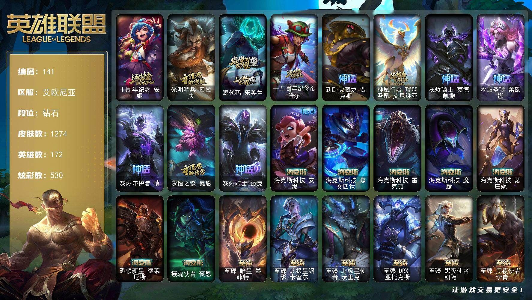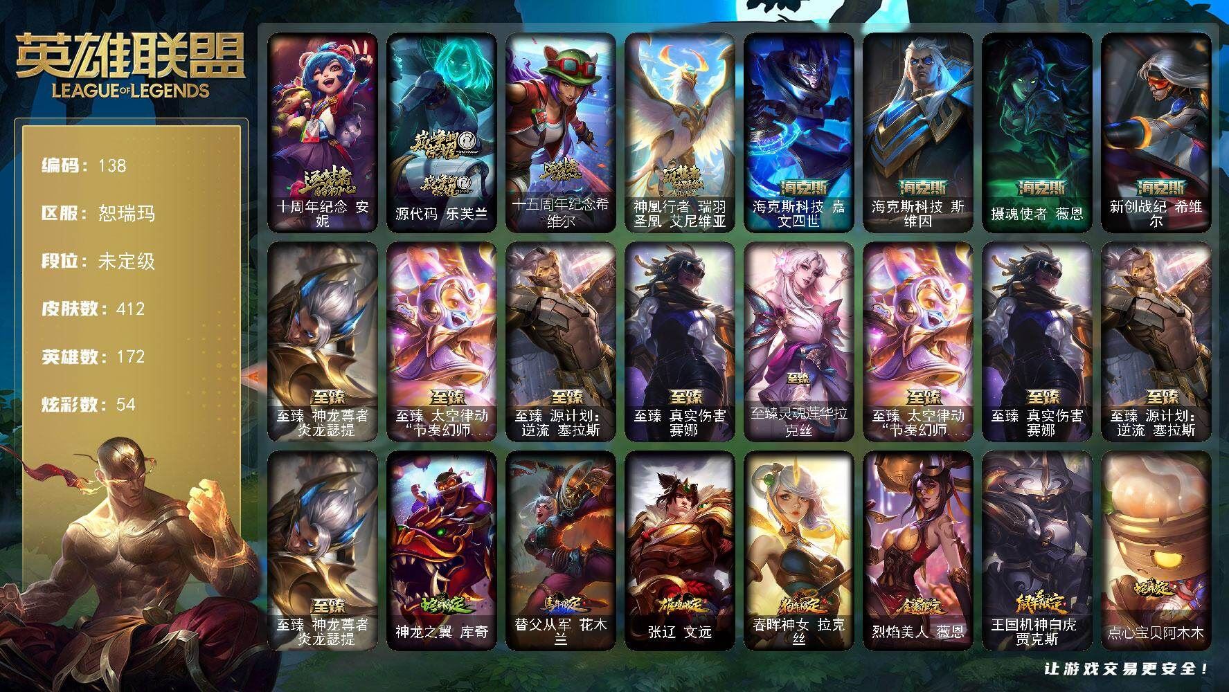 【账号佳】 【可二次实名】可二次QQ 【LOL网通】未定级段位-172英雄-412皮肤-54炫彩-2终极-13神话-82限定-46传说-106史诗【神话皮肤】:十周年纪念安妮,源代码乐芙兰,十五周年纪念希维尔,神凰行者瑞羽圣凰艾尼维亚,海克斯科技嘉文四世,海克斯科技斯维因,摄魂使者薇恩,新创战纪希维尔,至臻真实伤害赛娜,至臻神龙尊者炎龙瑟提,至臻太空律动节奏幻师璐璐,至臻源计划逆流塞拉斯【至臻皮肤】:至臻灵魂莲华拉克丝,至臻太空律动节奏幻师璐璐,至臻真实伤害赛娜,至臻源计划逆流塞拉斯,至臻神龙尊者炎龙瑟提【臻彩皮肤】:天龙之子卡莎飞龙乘云,墨之影武者亚索金墨耀影,冠军之隐劫凯旋圣装,山海绘卷科加斯朱红,霸天巨兽雪崩墨菲特,玉剑传说神机花火青竹,魔女阿卡丽虚荣,净雪之月莫甘娜冬虹【年限皮肤】:神龙之翼库奇,替父从军花木兰,张辽文远,春晖神女拉克丝,烈焰美人薇恩,王国机神白虎贾克斯,点心宝贝阿木木【海克斯皮肤】:新创战纪希维尔,海克斯科技斯维因,海克斯科技嘉文四世,摄魂使者薇恩【情人节限定】:甜心宝贝安妮,觅心猎手薇恩,觅心女王艾希【冰雪限定】:圣诞开心鬼提莫,圣诞精灵崔丝塔娜,圣诞狂欢努努和威朗普,圣诞糖果棒厄运小姐,圣诞狂欢基兰,阿木木“主人不要我了”,胡桃夹子萨科,平安夜女神娑娜,冬季仙境卡尔玛,邪恶圣诞老人维迦,圣诞玩偶波比,圣诞老人古拉加斯,圣诞驯鹿克格莫,寒冬精灵璐璐【终极皮肤】:大元素使拉克丝,未来战士伊泽瑞尔【限定皮肤】:卧虎藏龙贾克斯,地底世界崔斯特,冠军之血希瓦娜,冠军之隐劫,Fnatic嘉文四世,Fnatic卡尔萨斯,暗杀星伊泽瑞尔,SKTT1贾克斯,SKTT1李青,SKTT1薇恩,SSW辛吉德,SSW图奇,SSW锤石,SKTT1阿利斯塔,SKTT1瑞兹,SKTT1伊莉丝,iG菲奥娜,iG艾瑞莉娅,iG卡蜜尔,iG卡莎,iG乐芙兰,iG洛,星之守护者伊泽瑞尔,神凰行者烈羽焰凰霞,海珀利安小队Z01猎户座卢锡安,胜利女神希维尔,胜利之树茂凯,胜利枪神格雷福斯,胜利女神奥莉安娜,胜利之剑亚托克斯,胜利枪神卢锡安,胜利机器人布里茨,海贼瑞兹,南瓜头费德提克,鬼影重重魔腾,魅惑女巫奈德丽,糖果使徒费德提克,泳池派对厄运小姐,泳池派对菲奥娜,泳池派对格雷福斯,泳池派对普朗克,泳池派对佐伊,蓝色忧郁崔斯特,蒙多蒙多,破空枪骑孙悟空,外星装甲库奇,暗影沃里克,野兽猎人德莱文,波比的巧克力工坊,电玩战魂赫卡里姆,都铎王朝图奇,御星魔矢艾希,钢铁之翼艾尼维亚,征服者韦鲁斯,防暴士兵辛吉德,防暴天使凯尔,惊悚派对阿木木,克格汪【传说皮肤】:铁哥们儿奥拉夫,魔幻卡牌崔斯特,邪鸦魅影乐芙兰,大天使长米迦勒凯尔,战场女武神凯尔,钢铁之翼凯尔,恶魔男爵瑞兹,霸天零式赛恩,提莫约德尔人的一大步,约德尔国队长提莫,烈焰雄心崔丝塔娜,合金巨兽努努和威朗普,恶魔之刃泰达米尔,鬼魂新娘莫甘娜,绅士科加斯,黯晶凤凰艾尼维亚,律政大亨蒙多,电玩女神娑娜,冰霜之刃艾瑞莉娅,女主播迦娜,红色男爵库奇,最终BOSS维迦,未来战士凯特琳,上古战魂魔腾,地狱行者孙悟空,神拳李青,源计划净化薇恩,第三类接触黑默丁格,炼狱魔犬内瑟斯,屠龙勇士潘森,腥红之月鬼武姬阿卡丽,钢铁军团盖伦,黎明使者锐雯,黯黑魔龙希瓦娜,冰霜亚龙希瓦娜,偶像歌手阿狸,符文战熊沃利贝尔,女校长菲奥娜,泳池派对吉格斯,金牌主播德莱文,霸天异形卡兹克,灌篮高手德莱厄斯,黑夜使者亚索,神龙尊者昼日真龙亚索,星之守护者金克丝,暗星锤石【史诗皮肤】:冰霜烈焰安妮,皇家火枪手崔斯特,翼骑统领赵信,摄魂男爵弗拉基米尔,铁钩船长费德提克,重生之沙费德提克,圣光审判凯尔,铁血剑豪易,地狱火阿利斯塔,战场公主希维尔,钢铁之心希维尔,月光女神阿忒弥斯索拉卡,源代码索拉卡,兔宝宝提莫,熊猫提莫,火牙狼人沃里克,女船长厄运小姐,紫晶射手艾希,死神卡尔萨斯,卡尔萨斯祸害之光,殇之机器人阿木木,熔火之心拉莫斯,全金属狂潮拉莫斯,武动巅峰萨科,战争血统蒙多,掠星魔刃卡萨丁,恐惧新星普朗克,血石诅咒塔里克,穿着正装的恶魔维迦,北领前线斯维因,绝代智将斯维因,抵抗军天使凯特琳,古墓丽影凯特琳,铁血狙击手凯特琳,黑曜石守护者墨菲特,霸天巨兽墨菲特,无畏号墨菲特,前线指挥官卡特琳娜,源计划雄心卡特琳娜,枯萎之壤雷克顿,死亡绽放伊莉丝,灵骨工匠奥莉安娜,暗星奥莉安娜,灵魂烈焰布兰德,地下拳王李青,屠龙勇士薇恩,苍穹之光薇恩,深海妖姬卡西奥佩娅,战地机甲斯卡纳,四神之力乌迪尔,血色之锤波比,大夏武士潘森,面包之王潘森,死亡领主莫德凯撒,实习护士阿卡丽,刺客信条凯南,腥红之月凯南,钢铁烈阳蕾欧娜,至高君王玛尔扎哈,腥红之月泰隆,刺客信条锐雯,兔女郎锐雯,侏罗纪化石克格莫,腥红之月鬼武者慎,战国大名慎,ODST地狱伞兵拉克丝,