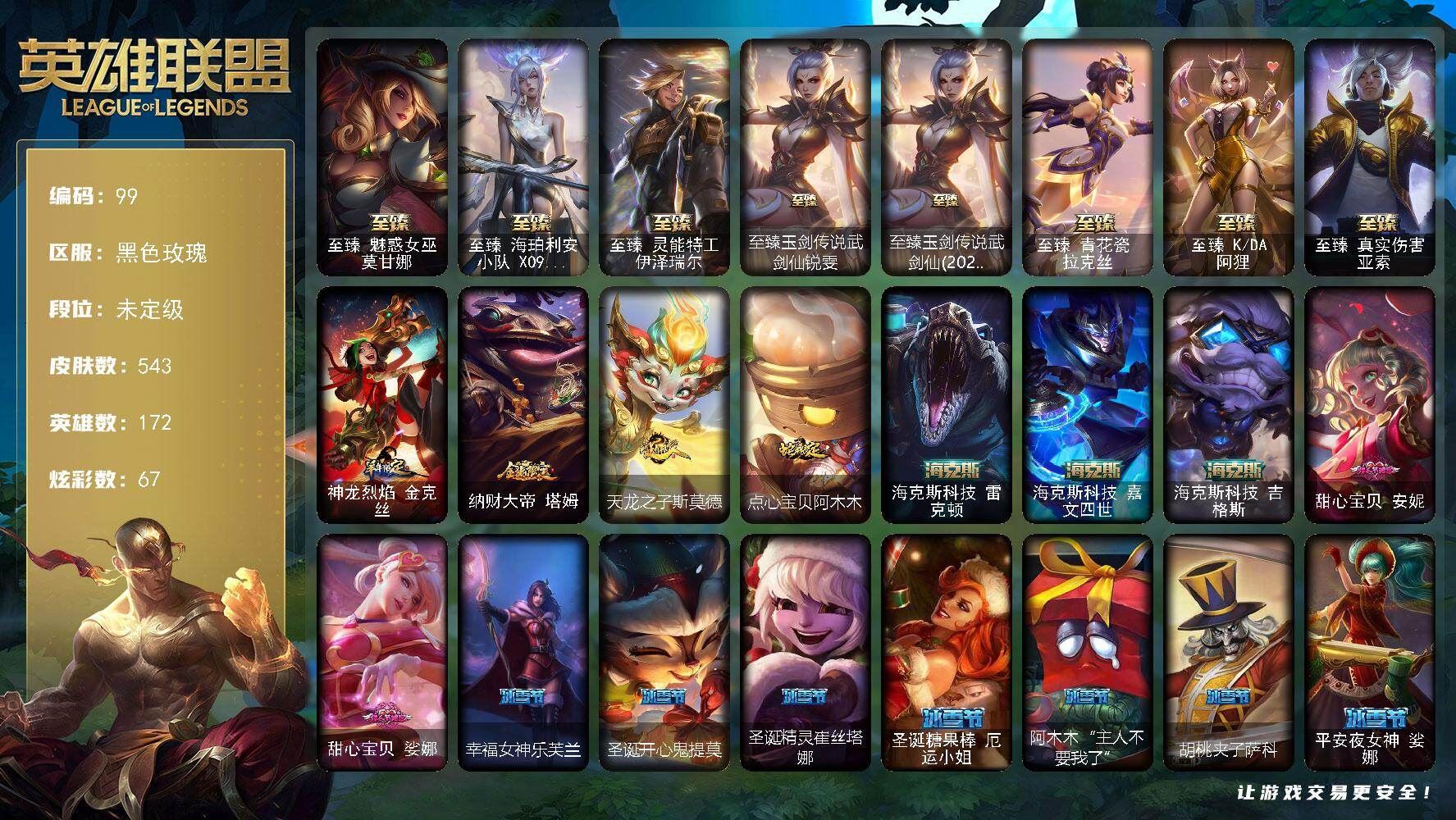 【账号佳】 【可二次实名】R49694 可二次黑色玫瑰 未定级段位-172英雄-543皮肤-67炫彩-1终极-15神话-79限定-44传说-122史诗【热门头像】:春晖神女头像【至臻皮肤】:至臻魅惑女巫莫甘娜,至臻海珀利安小队X09星环灵风迦娜,至臻灵能特工伊泽瑞尔,至臻玉剑传说武剑仙锐雯,至臻玉剑传说武剑仙(2022),至臻青花瓷拉克丝,至臻KDA阿狸,至臻真实伤害亚索【臻彩皮肤】:天龙之子卡莎飞龙乘云,无畏骑士瑟庄妮赤子初心,墨之影武者亚索金墨耀影,雾雨之刃锐雯,斗魂觉醒拉克丝无限斗志,西部魔影卢锡安贝利尔之怠,玉剑传说寒潭夭夭胭脂,可爱可爱粉红红布里茨,魔女阿卡丽虚荣,净雪之月莫甘娜冬虹,幽梦玫瑰辛德拉纯洁花蕾,红莲之刃锐雯,心之钢伊泽瑞尔天纵才华【年限皮肤】:神龙烈焰金克丝,纳财大帝塔姆,天龙之子斯莫德,点心宝贝阿木木【海克斯皮肤】:海克斯科技雷克顿,海克斯科技嘉文四世,海克斯科技吉格斯【情人节限定】:甜心宝贝安妮,甜心宝贝娑娜【冰雪限定】:幸福女神乐芙兰,圣诞开心鬼提莫,圣诞精灵崔丝塔娜,圣诞糖果棒厄运小姐,阿木木“主人不要我了”,胡桃夹子萨科,平安夜女神娑娜,英勇玩具兵普朗克,邪恶圣诞老人维迦,喜庆之树茂凯,雪默丁格,雪装奈德丽,圣诞玩偶波比,圣诞老人古拉加斯,圣诞驯鹿克格莫,魄罗骑士瑟庄妮,雪球也能爆炸吉格斯,冰雪节玛尔扎哈,冰雪女神辛德拉,冰雪兽纳尔【终极皮肤】:武装战姬厄运小姐【神话皮肤】:十周年纪念安妮,源代码乐芙兰,十五周年纪念希维尔,神凰行者瑞羽圣凰艾尼维亚,海克斯科技嘉文四世,海克斯科技吉格斯,海克斯科技雷克顿,至臻真实伤害亚索,至臻海珀利安小队X09星环灵风迦娜,至臻KDA阿狸,至臻灵能特工伊泽瑞尔,至臻魅惑女巫莫甘娜,至臻青花瓷拉克丝,至臻玉剑传说武剑仙,至臻玉剑传说武剑仙2022【限定皮肤】:钢铁军团拉克丝,奥斯曼大帝泰达米尔,生化领主泰达米尔,卧虎藏龙贾克斯,诺斯费拉图弗拉基米尔,地底世界崔斯特,冠军典狱长锤石,冠军之矛卡莉丝塔,冠军之隐劫,冠军之箭艾希,Fnatic古拉加斯,Fnatic嘉文四世,暗杀星蒙多,暗杀星努努和威朗普,暗杀星慎,SKTT1劫,SKTT1婕拉,SSW辛吉德,SSW图奇,SSW泰隆,勇敢的心德莱厄斯,电玩勇者锐雯,星之守护者伊泽瑞尔,暗裔英雄盖伦,胜利之树茂凯,海贼瑞兹,南瓜头费德提克,灵魂收割者索拉卡,鬼影重重魔腾,鬼影森森茂凯,魅惑女巫奈德丽,糖果使徒费德提克,泳池派对菲奥娜,泳池派对雷克顿,泳池派对李青,机械迷城加里奥,蓝色忧郁崔斯特,蒙多蒙多,密林猎手提莫,女猎手希维尔,外星装甲库奇,暗影沃里克,波比的巧克力工坊,创战纪希维尔,勇者阿狸,都铎王朝图奇,玉剑传说舞龙卫,钢铁之翼艾尼维亚,红桃杰克崔斯特,征服者韦鲁斯,防暴士兵辛吉德,防暴天使凯尔,惊悚派对费德提克【传说皮肤】:铁哥们儿奥拉夫,地狱之门卫士加里奥,魔幻卡牌崔斯特,血石领主弗拉基米尔,大天使长米迦勒凯尔,战场女武神凯尔,钢铁之翼凯尔,源计划林易,霸天零式赛恩,提莫约德尔人的一大步,约德尔国队长提莫,合金巨兽努努和威朗普,源计划联合艾希,绅士科加斯,黯晶凤凰艾尼维亚,电玩女神娑娜,冰霜之刃艾瑞莉娅,女主播迦娜,最终BOSS维迦,女警狙击凯特琳,未来战士凯特琳,陆地王者4WD布里茨,冰川巨兽墨菲特,地狱行者孙悟空,丧尸布兰德,光明哨兵薇恩,第三类接触黑默丁格,驯龙学者黑默丁格,炼狱魔犬内瑟斯,腥红之月鬼武姬阿卡丽,死亡骑士盖伦,日蚀骑士蕾欧娜,黎明使者锐雯,耀星女神拉克丝,枯萎之壤泽拉斯,黯黑魔龙希瓦娜,符文战熊沃利贝尔,宇航员诺提勒斯,女校长菲奥娜,泳池派对吉格斯,金牌主播德莱文,霸天异形卡兹克,蔷薇绅士杰斯,暗星锤石,各种道具详情看截图、低价出售找回包 赔、截图展示段位不代 表实际段位,如赛季更新等不可抗拒因素发生变化、时限道具不保证所剩时间、标题未写送点劵默认不送【卖号买号首选亿梦】