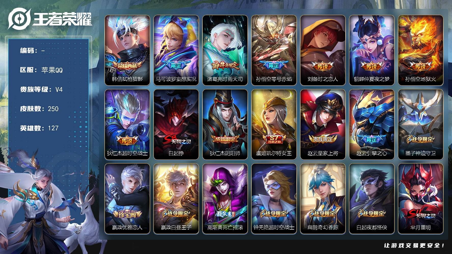 【账号佳】 【可包人脸】苹果Q V4 至尊星耀V段位 127英雄 250皮肤 1典藏 0珍品无双 0无双 0珍品传说 7传说 71史诗大区:苹果Q,营地:346946774,贵族等级:4,【热门皮肤】:,【限定皮肤】:亚瑟荣光之誓,王昭君幻想奇妙夜,扁鹊救世之瞳,关羽龙腾万里,赵云忍·炎影,狂铁龙之律动,苏烈春野闲踪,梦奇顽趣,钟馗虚灵犬护,花木兰兔女郎,刘备浪漫序章,阿轲化蝶舞,戈娅玫蓝誓约,明世隐景韶洛都,甄姬花好人间,百里玄策原初追逐者,孙膑茶境仙,马超访茗客,太乙真人谧流熔炉,安琪拉玩偶对对碰,白起白色死神,姜子牙星梦巡礼,廉颇功夫炙烤,芈月浮光幕影,刘邦剑破天穹,鬼谷子天穹祈灯,戈娅驭风魔法,马可波罗妄想实况,赵云引擎之心,姬小满零食大作战,鲁班大师探海日志,西施玲珑珍味,扁鹊奇幻香踪,莱西奥西部游侠,太乙真人劲辣红锅,裴擒虎擒涛扼浪,杨戬潮玩骑兵,刘备万事如意,猪八戒潮玩探月行,桑启海盐诗旅,元歌无心,钟无艳超时空战士,甄姬落雪兰心,鬼谷子五谷丰年,李元芳云中旅人,王昭君午后时光,狂铁电玩高手,达摩大发明家,张飞五福同心,蒙犽胡桃狂想曲,蒙恬蔚蓝守将,沈梦溪大漠名商,兰陵王金庭之子,白起夜都怪侠,雅典娜黎明之约,黄忠火炮绅士,云中君时之祈愿,小乔丁香结,孙尚香沉稳之力,姜子牙时尚教父,刘邦虎啸剑宗,程咬金无双福将,芈月幻夜卜梦,达摩沙漠行僧,马可波罗潮玩牛仔,干将莫邪真爱魔法,后羿圣弓游侠,宫本武藏未来纪元,嫦娥拒霜思,达摩拳王,狂铁特工战影,嬴政优雅恋人,猪八戒猪悟能,苏烈千军破阵,典韦铁甲之心,刘备纽约教父,老夫子航海奇遇记,墨子神迹守卫,大乔守护之力,鲁班大师乓乓大师【荣耀典藏】:韩信弑枪猎影【截图或标题展示段位不代表实际段位,赛季更新等不可抗拒因素发生变化、时限道具不保证所剩时间,详情请看截图哦~】