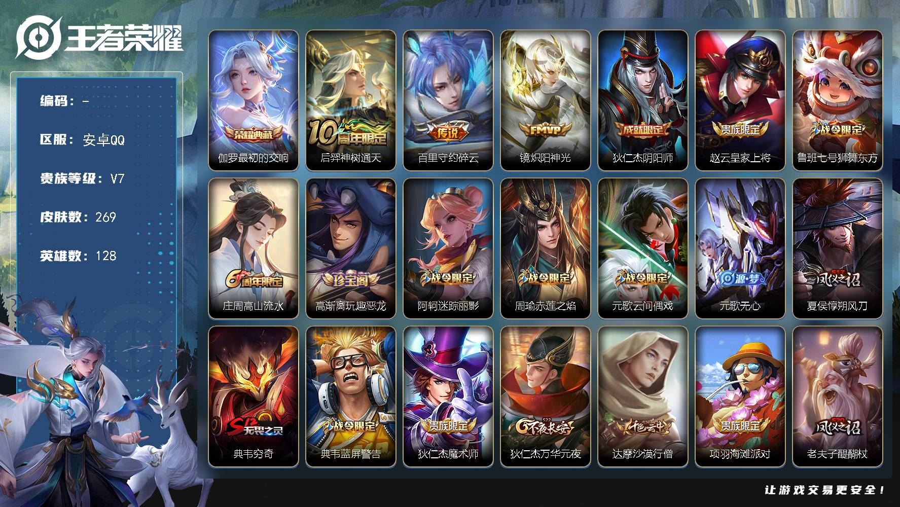 【账号佳】 【可包人脸】安卓Q V7 尊贵铂金II段位 128英雄 269皮肤 1典藏 0珍品无双 0无双 0珍品传说 3传说 62史诗大区:安卓Q,营地:407023365,贵族等级:7,【热门皮肤】:,【限定皮肤】:姜子牙时尚教父,周瑜线条小狗,兰陵王雾影缉谜,达摩大发明家,西施雪境奇遇,桑启线条小狗,鲁班七号班班快跑,程咬金星际陆战队,后羿神树通天,艾琳女武神,少司缘巫礼祀神,艾琳鹤鸣心笺,明世隐往忆晖光,莱西奥光弋星穹,庄周高山流水,孙权径山谋武,张良罗小黑战记,亚瑟荣光之誓,妲己紫罗兰之誓,芈月红桃皇后,哪吒罗小黑战记,桑启青衿临川,西施织梦人,安琪拉心灵骇客,鬼谷子克喵,孙膑天使之翼,宫本武藏未来纪元,盘古重装意志,莱西奥踏浪烽翎,狂铁龙之律动,典韦铁甲之心,周瑜百相守梦,孙策百相守梦,甄姬逆浪荇歌,朵莉亚幻珠鲛人,诸葛亮掌控之力,戈娅玫蓝誓约,姜子牙星梦巡礼,姬小满零食大作战,影魅影绮裳,苍苍林狼骑,赵云白执事,露娜哥特玫瑰,干将莫邪雾都夜雨,廉颇功夫炙烤,吕布逐霄战戟,后羿完美运算,李元芳蔬乡物语,鲁班七号蔬乡物语,刘邦剑破天穹,刘禅唤灵魔甲,钟无艳春野之旅,沈梦溪龙舞盛年,扁鹊救世之瞳,朵莉亚金色潮汐,海诺时空谍影,鬼谷子天穹祈灯,蒙恬荣光圣徽,云中君纤云弄巧,李元芳妄想特派,艾琳流音漫舞,司空震地狱燃心,曹操决胜大满贯,阿古朵江河有灵,亚连破局者,钟无艳聚星闪耀,海月王牌新星,张良古海寻踪,雅典娜黎明之约,孙膑归虚梦演,李白敏锐之力,鲁班大师探海日志,莱西奥西部游侠,太乙真人劲辣红锅,镜炽阳神光,裴擒虎擒涛扼浪,赵怀真太极少年,牛魔西部大镖客,蒙恬蔚蓝守将,梦奇顽趣【荣耀典藏】:伽罗最初的交响【截图或标题展示段位不代表实际段位,赛季更新等不可抗拒因素发生变化、时限道具不保证所剩时间,详情请看截图哦~】