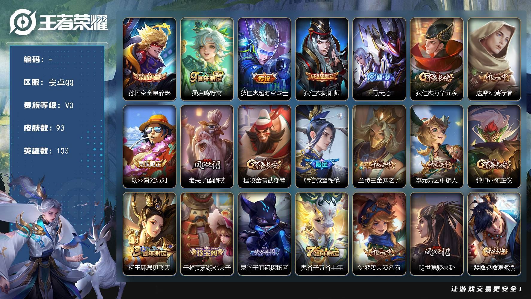 【账号佳】 【可包人脸】安卓Q V0 永恒钻石V段位 103英雄 93皮肤 1典藏 0珍品无双 0无双 0珍品传说 2传说 19史诗大区:安卓Q,营地:1833964628,贵族等级:0,【热门皮肤】:,【限定皮肤】:关羽龙腾万里,露娜哥特玫瑰,阿轲化蝶舞,戈娅玫蓝誓约,明世隐景韶洛都,太乙真人谧流熔炉,海诺时空谍影,后羿阿尔法小队,姜子牙星梦巡礼,桑启鸣野蒿,杨玉环遇见飞天,东皇太一噬灭天穹,韩信街头霸王,周瑜熔金海岸,刘邦剑破天穹,程咬金群星魔术团,后羿完美运算,鬼谷子天穹祈灯,刘备汉昭烈帝,干将莫邪胡桃夹子,阿古朵江河有灵,张良古海寻踪,钟无艳聚星闪耀,小乔丁香结,狂铁特工战影,刘备万事如意,哪吒热血海滩,李元芳妄想特派,鲁班大师探海日志,裴擒虎擒涛扼浪,孙策猫狗日记,桑启海盐诗旅,狂铁命运角斗场,元歌无心,鬼谷子五谷丰年,李元芳云中旅人,安琪拉玩偶对对碰,沈梦溪大漠名商,兰陵王金庭之子,吕布野性能量,狄仁杰阴阳师,赵云白执事,项羽海滩派对,孙尚香沉稳之力,韩信傲雪梅枪,达摩沙漠行僧,钟馗驱傩正仪,程咬金演武夺筹,狄仁杰万华元夜,花木兰兔女郎,鬼谷子原初探秘者,典韦黄金武士,老夫子醍醐杖,明世隐疑决卦【荣耀典藏】:孙悟空全息碎影【截图或标题展示段位不代表实际段位,赛季更新等不可抗拒因素发生变化、时限道具不保证所剩时间,详情请看截图哦~】
