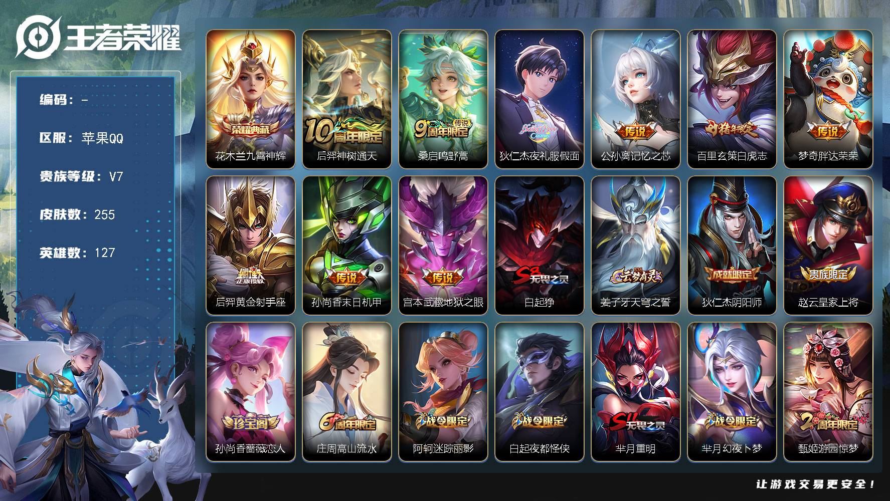 【账号佳】 【可包人脸】苹果Q V7 永恒钻石I段位 127英雄 255皮肤 1典藏 0珍品无双 0无双 0珍品传说 9传说 64史诗大区:苹果Q,营地:468746349,贵族等级:7,【热门皮肤】:,【限定皮肤】:兰陵王雾影缉谜,海诺时空谍影,项羽九幽镇关,云中君云械蓝图,后羿神树通天,艾琳鹤鸣心笺,女娲万灵启世,孙权径山谋武,亚瑟荣光之誓,姜子牙星梦巡礼,哪吒罗小黑战记,程咬金星际陆战队,桑启青衿临川,公孙离涂山容容,鬼谷子克喵,莱西奥踏浪烽翎,朵莉亚幻珠鲛人,甄姬逆浪荇歌,艾琳女武神,后羿阿尔法小队,露娜命运加冕,苏烈坚韧之力,赵云忍·炎影,阿古朵布丁狗之约,扁鹊救世之瞳,钟馗虚灵犬护,戈娅玫蓝誓约,明世隐景韶洛都,姬小满零食大作战,西施雪境奇遇,典韦铁骨偃魂,苍苍林狼骑,太乙真人谧流熔炉,牛魔星界战将,海月幻泉雾影,孙膑天使之翼,干将莫邪雾都夜雨,宫本武藏未来纪元,杨玉环遇见飞天,桑启鸣野蒿,东皇太一噬灭天穹,大乔猫狗日记,盘古敬我三分,程咬金无双福将,周瑜熔金海岸,孙尚香沉稳之力,姜子牙天穹之誓,廉颇功夫炙烤,程咬金群星魔术团,花木兰兔女郎,刘邦剑破天穹,老夫子航海奇遇记,高渐离燃音魔法,妲己灵卜魔法,甄姬花好人间,鬼谷子天穹祈灯,蒙恬荣光圣徽,李元芳妄想特派,嫦娥拒霜思,程咬金暖冬絮语,后羿完美运算,蒙犽百解令,司空震地狱燃心,艾琳流音漫舞,狄仁杰夜礼服假面,阿古朵江河有灵,鬼谷子幻乐之宴,钟无艳聚星闪耀,亚连破局者,张良古海寻踪,刘禅秘密基地,鲁班大师探海日志,明世隐虹云星官,典韦黄金武士,莱西奥西部游侠,太乙真人劲辣红锅,孙尚香蔷薇恋人,孙悟空至尊宝,露娜哥特玫瑰,达摩大发明家【荣耀典藏】:花木兰九霄神辉【截图或标题展示段位不代表实际段位,赛季更新等不可抗拒因素发生变化、时限道具不保证所剩时间,详情请看截图哦~】