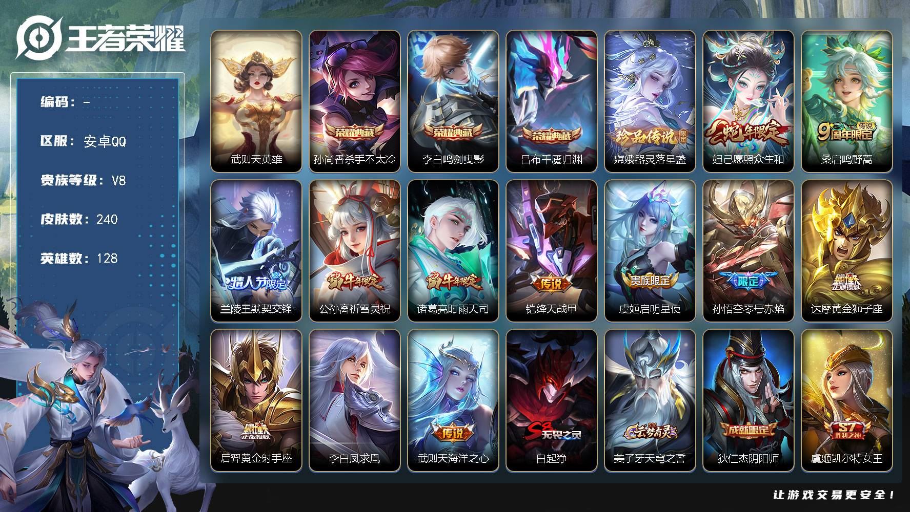 【账号佳】 【可包人脸】安卓Q V8 永恒钻石I段位 128英雄 240皮肤 3典藏 0珍品无双 0无双 1珍品传说 12传说 65史诗大区:安卓Q,营地:220113794,贵族等级:8,【热门皮肤】:,【限定皮肤】:桑启线条小狗,廉颇撼地雄心,小乔线条小狗,钟馗锁墨魂,露娜紫霞仙子,周瑜线条小狗,安琪拉心灵骇客,赵云引擎之心,嫦娥器灵·落星盏,姜子牙星梦巡礼,妲己愿照·众生和,牛魔星界战将,太乙真人谧流熔炉,刘备汉昭烈帝,干将莫邪雾都夜雨,百里守约百相守梦,老夫子百相守梦,牛魔西部大镖客,桑启鸣野蒿,甄姬花好人间,东皇太一噬灭天穹,海月幻泉雾影,姜子牙天穹之誓,亚瑟心灵战警,狂铁命运角斗场,猪八戒猪悟能,镜青焰无极,项羽苍威无极,貂蝉长夏之忆,百里玄策原初追逐者,程咬金群星魔术团,刘邦剑破天穹,廉颇功夫炙烤,嫦娥漠中幻影,鬼谷子天穹祈灯,蒙恬荣光圣徽,孙膑天使之翼,后羿完美运算,程咬金暖冬絮语,钟无艳聚星闪耀,张良古海寻踪,吕布野性能量,李元芳妄想特派,鲁班大师探海日志,梦奇顽趣,雅典娜黎明之约,太乙真人劲辣红锅,高渐离玩趣恶龙,裴擒虎擒涛扼浪,白起乐园追猎者,白起白色死神,猪八戒潮玩探月行,牛魔牛运亨通,桑启海盐诗旅,鬼谷子五谷丰年,大乔守护之力,李元芳云中旅人,沈梦溪大漠名商,程咬金无双福将,兰陵王金庭之子,孙尚香沉稳之力,达摩沙漠行僧,安琪拉玩偶对对碰,姜子牙时尚教父,兰陵王默契交锋,花木兰默契交锋,孙膑天狼运算者,虞姬启明星使,孙悟空零号·赤焰,芈月白晶晶,吕布御风骁将,公孙离祈雪灵祝,牛魔奔雷神使,诸葛亮时雨天司,刘禅秘密基地,项羽霸王别姬,杨戬次元傲视,元歌云间偶戏,赵云白执事,虞姬霸王别姬【荣耀典藏】:武则天,吕布千魇归渊,李白鸣剑·曳影,孙尚香杀手不太冷【截图或标题展示段位不代表实际段位,赛季更新等不可抗拒因素发生变化、时限道具不保证所剩时间,详情请看截图哦~】