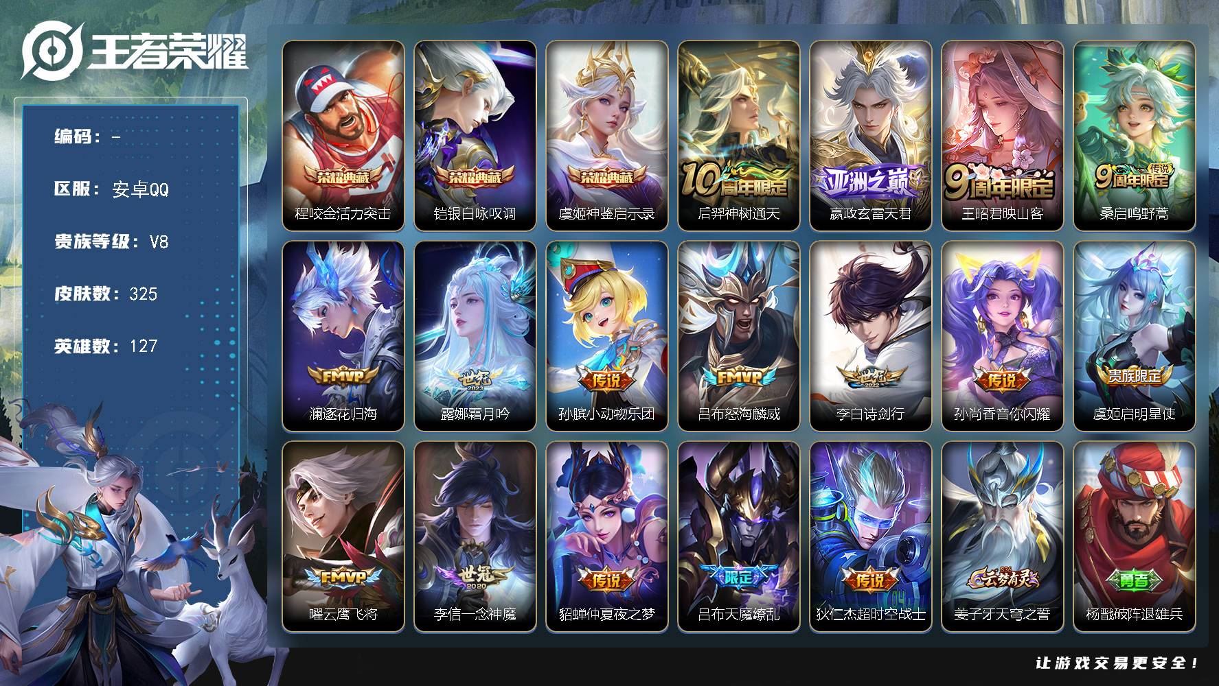 【账号佳】 【可包人脸】安卓Q V8 最强王者段位 127英雄 325皮肤 3典藏 0珍品无双 0无双 0珍品传说 16传说 104史诗大区:安卓Q,营地:1889347170,贵族等级:8,【热门皮肤】:,【限定皮肤】:韩信街头霸王,敖隐赤刃凌霄,兰陵王雾影缉谜,周瑜线条小狗,莱西奥光弋星穹,明世隐往忆晖光,曹操逐霄之志,后羿神树通天,亚瑟荣光之誓,女娲万灵启世,后羿阿尔法小队,程咬金星际陆战队,刘备万事如意,姜子牙星梦巡礼,典韦铁骨偃魂,王昭君映山客,澜逐花归海,马超访茗客,影魅影绮裳,孙膑茶境仙,嬴政玄雷天君,虞姬启明星使,露娜霜月吟,李白诗剑行,太乙真人谧流熔炉,苍苍林狼骑,牛魔星界战将,老夫子百相守梦,百里守约百相守梦,杨玉环遇见飞天,桑启鸣野蒿,李白敏锐之力,大乔猫狗日记,孙膑天使之翼,东皇太一噬灭天穹,姜子牙天穹之誓,周瑜熔金海岸,露娜紫霞仙子,杨戬破阵·退雄兵,镜青焰无极,大司命暗都幽影,项羽苍威无极,姬小满妄想食味,廉颇功夫炙烤,鲁班七号蔬乡物语,刘邦剑破天穹,扁鹊无尽旅途,钟无艳春野之旅,王昭君幻想奇妙夜,李元芳蔬乡物语,沈梦溪龙舞盛年,吕布猎兽之王,高渐离燃音魔法,妲己灵卜魔法,海诺时空谍影,鬼谷子天穹祈灯,蒙恬荣光圣徽,周瑜雪夜绮愿,后羿完美运算,程咬金暖冬絮语,蒙犽百解令,曹操决胜大满贯,司空震地狱燃心,兰陵王幻夜行动,亚瑟心灵战警,阿古朵江河有灵,钟无艳聚星闪耀,亚连破局者,海月王牌新星,艾琳流音漫舞,张良古海寻踪,李信一念神魔,西施玲珑珍味,戈娅驭风魔法,赵云白执事,李元芳妄想特派,鲁班大师探海日志,杨戬潮玩骑兵,扁鹊奇幻香踪,貂蝉圣诞恋歌【荣耀典藏】:铠银白咏叹调,虞姬神鉴启示录,程咬金活力突击【截图或标题展示段位不代表实际段位,赛季更新等不可抗拒因素发生变化、时限道具不保证所剩时间,详情请看截图哦~】