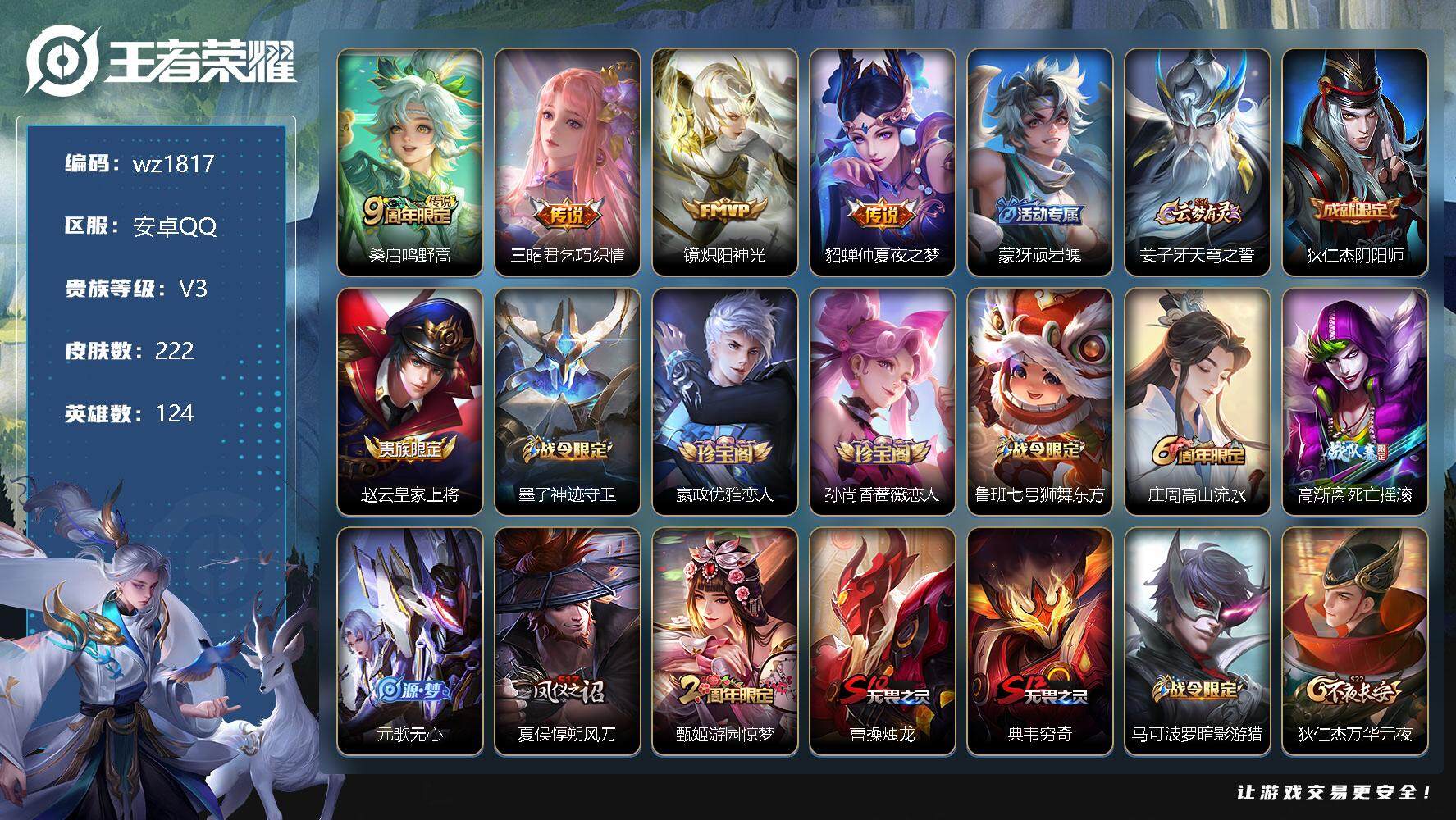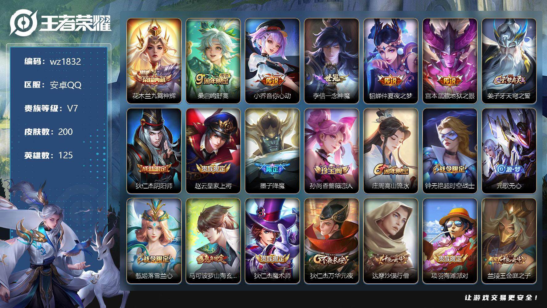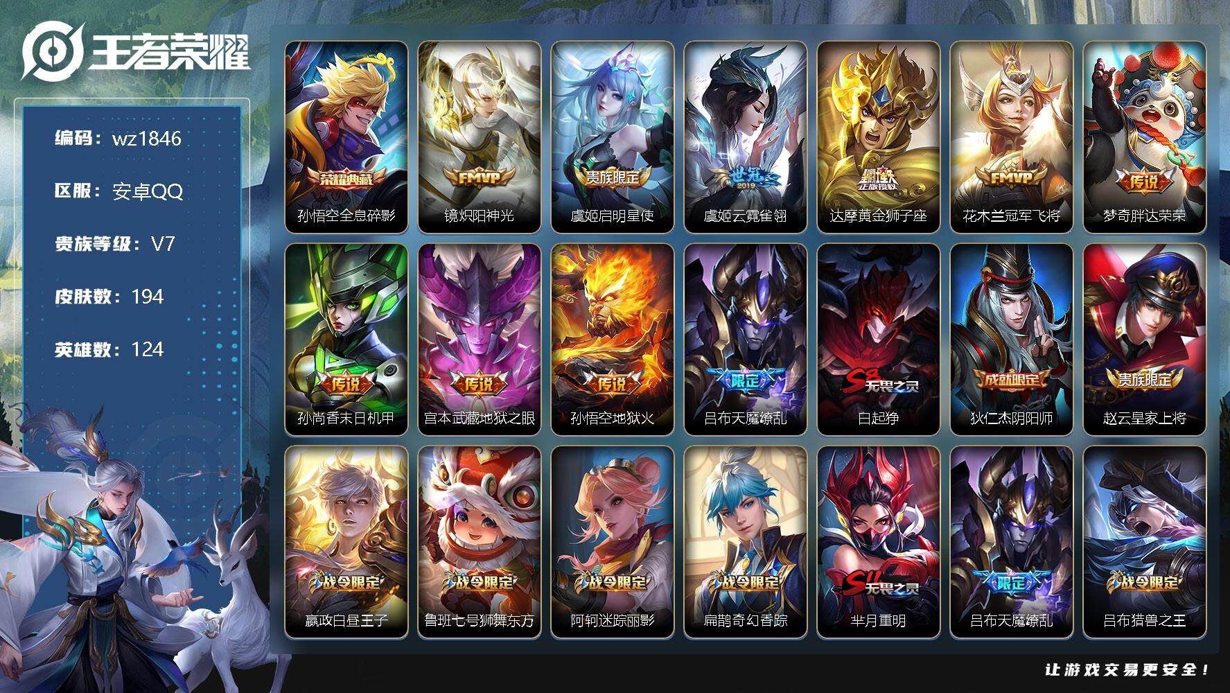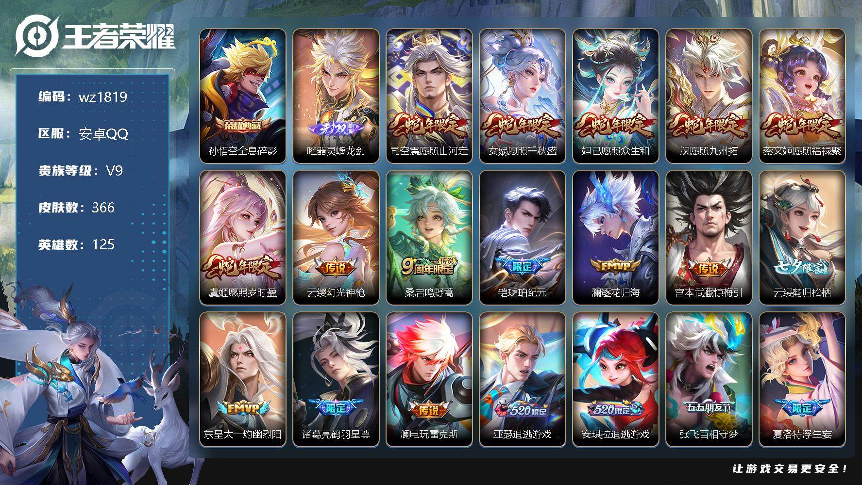 【账号佳】 【可二次实名】【wz1819】【商品标题】:安卓Q-V9-最强王者段位-125英雄-366皮肤-1典藏-0珍品无双-1无双-0珍品传说-51传说-117史诗 【英雄全皮】:娜可露露全皮,橘右京全皮,刘备全皮,李信全皮,曜全皮,澜全皮,夏洛特全皮,司空震全皮,赵怀真全皮,戈娅全皮,空空儿全皮,影全皮,海诺全皮 【荣耀典藏】:孙悟空全息碎影 【无双皮肤】:曜器灵螭龙剑 【传说皮肤】:司空震愿照山河定,女娲愿照千秋盛,妲己愿照众生和,澜愿照九州拓,蔡文姬愿照福禄聚,虞姬愿照岁时盈,云缨幻光神枪,桑启鸣野蒿,铠琥珀纪元,澜逐花归海,宫本武藏惊梅引,云缨鹤归松栖,东皇太一灼幽烈阳,诸葛亮鹤羽星尊,澜电玩雷克斯,亚瑟追逃游戏,安琪拉追逃游戏,张飞百相守梦,夏洛特浮生妄,花木兰燃星之曲,虞姬无限倾心,项羽无限倾心,孙悟空齐天大圣,小乔山海琳琅生,曜山海苍雷引,李信山海炽霜斩,吕布怒海麟威,李白诗剑行,狄仁杰神器狴犴令,不知火舞绯月行,橘右京枫霜尽,娜可露露前尘镜,后羿无尽星芒,马超无双飞将,孙策末日机甲,裴擒虎寅虎赤拳,鲁班七号寅虎瑞焰,赵云淬星耀世,曜李逍遥 ,周瑜音你心动,李元芳飞鸢探春,诸葛亮时雨天司,铠绛天战甲,虞姬启明星使,孙悟空零号赤焰,曜云鹰飞将,李信一念神魔,刘备时之恋人,诸葛亮武陵仙君,宫本武藏地狱之眼,孙悟空地狱火 【限定皮肤】:蒙犽顽岩魄,蔡文姬夏日便利店,大乔绒语心约,虞姬夏日便利店,姜子牙天穹之誓,杨戬破阵退雄兵,狄仁杰阴阳师,小乔山海琳琅生,赵云皇家上将,赵云引擎之心,赵云百木心枪,墨子神迹守卫,墨子降魔,孙尚香蔷薇恋人,鲁班七号乒乒小将,鲁班七号寅虎瑞焰,庄周高山流水,高渐离玩趣恶龙,钟无艳超时空战士,扁鹊奇幻香踪,白起夜都怪侠,芈月幻夜卜梦,吕布猎兽之王,元歌云间偶戏,元歌无心,夏侯惇匿光决锋者,甄姬落雪兰心,曹操天狼征服者,典韦岱宗,马可波罗暗影游猎,马可波罗山海玄木吟,狄仁杰魔术师,狄仁杰神器狴犴令,达摩沙漠行僧,项羽海滩派对,项羽无限倾心,老夫子航海奇遇记,关羽百相守梦,安琪拉追逃游戏,韩信飞衡,韩信傲雪梅枪,王昭君午后时光,兰陵王金庭之子,花木兰瑞麟志,花木兰燃星之曲,不知火舞绯月行,娜可露露前尘镜,橘右京枫霜尽,亚瑟追逃游戏,孙悟空美猴王,孙悟空至尊宝,孙悟空零号赤焰,孙悟空孙行者,孙悟空齐天大圣,后羿圣弓游侠,后羿无尽星芒,刘备百相守梦,张飞虎魄,张飞百相守梦,李元芳匿光侦查者,李元芳云中旅人,虞姬启明星使,虞姬无限倾心,钟馗神迹守卫,钟馗驱傩正仪,杨戬潮玩骑兵,女娲朔望之晖,干将莫邪真爱魔法,雅典娜单词大作战,鬼谷子五谷丰年,诸葛亮武陵仙君,诸葛亮时雨天司,诸葛亮鹤羽星尊,黄忠烈魂,黄忠火炮绅士,铠青龙志,苏烈玄武志,苏烈千军破阵,百里守约朱雀志,梦奇顽趣,沈梦溪大漠名商,沈梦溪匿光破解者,明世隐吟游魔法,裴擒虎天狼狩猎者,裴擒虎李小龙,裴擒虎寅虎赤拳,裴擒虎擒涛扼浪,狂铁电玩高手,瑶山海碧波行,云中君纤云弄巧,李信山海炽霜斩,嫦娥拒霜思,嫦娥暖冬兔眠,曜李逍遥 ,曜山海苍雷引,西施玲珑珍味,鲁班大师探海日志,桑启海盐诗旅,夏洛特浮生妄,暃星界游侠,戈娅驭风魔法,艾琳流音漫舞,赵怀真鹤归松栖,云缨鹤归松栖,司空震地狱燃心,阿古朵江河有灵,张良古海寻踪,蒙犽百解令,高渐离燃音魔法,妲己灵卜魔法,鬼谷子天穹祈灯,伽罗琥珀纪元,铠琥珀纪元,姬小满妄想食味,沈梦溪龙舞盛年,鲁班七号蔬乡物语,李元芳蔬乡物语,刘邦剑破天穹,程咬金群星魔术团,镜青焰无极,项羽苍威无极,海诺心动手记,刘备异域游侠,芈月浮光幕影,周瑜熔金海岸 【年限皮肤】:百里守约朱雀志,花木兰瑞麟志,铠青龙志,苏烈玄武志,孙悟空美猴王,裴擒虎寅虎赤拳,鲁班七号寅虎瑞焰,诸葛亮时雨天司,韩信飞衡,典韦岱宗,黄忠烈魂,张飞虎魄,瑶山海碧波行,马可波罗山海玄木吟,李信山海炽霜斩,小乔山海琳琅生,曜山海苍雷引 【赛季限定】:达摩沙漠行僧,兰陵王金庭之子,张良古海寻踪,李元芳云中旅人,钟馗驱傩正仪,苏烈千军破阵,梦奇顽趣,沈梦溪大漠名商,裴擒虎擒涛扼浪,鲁班大师探海日志,桑启海盐诗旅,鬼谷子天穹祈灯,刘邦剑破天穹,姜子牙天穹之誓 【战令限定】:墨子神迹守卫,蔡文姬夏日便利店,虞姬夏日便利店,钟无艳超时空战士,扁鹊奇幻香踪,白起夜都怪侠,芈月幻夜卜梦,吕布猎兽之王,元歌云间偶戏,甄姬落雪兰心,马可波罗暗影游猎,老夫子航海奇遇记,王昭君午后时光,艾琳流音漫舞,后羿圣弓游侠,钟馗神迹守卫,杨戬潮玩骑兵,女娲朔望之晖,干将莫邪真爱魔法,雅典娜单词大作战,黄忠火炮绅士,明世隐吟游魔法,狂铁电玩高手,嫦娥暖冬兔眠,西施玲珑珍味,司空震地狱燃心,暃星界游侠,戈娅驭风魔法,高渐离燃音魔法,妲己灵卜魔法,鲁班七号蔬乡物语,李元芳蔬乡物语,镜青焰无极,项羽苍威无极 【史诗皮肤】:鲁