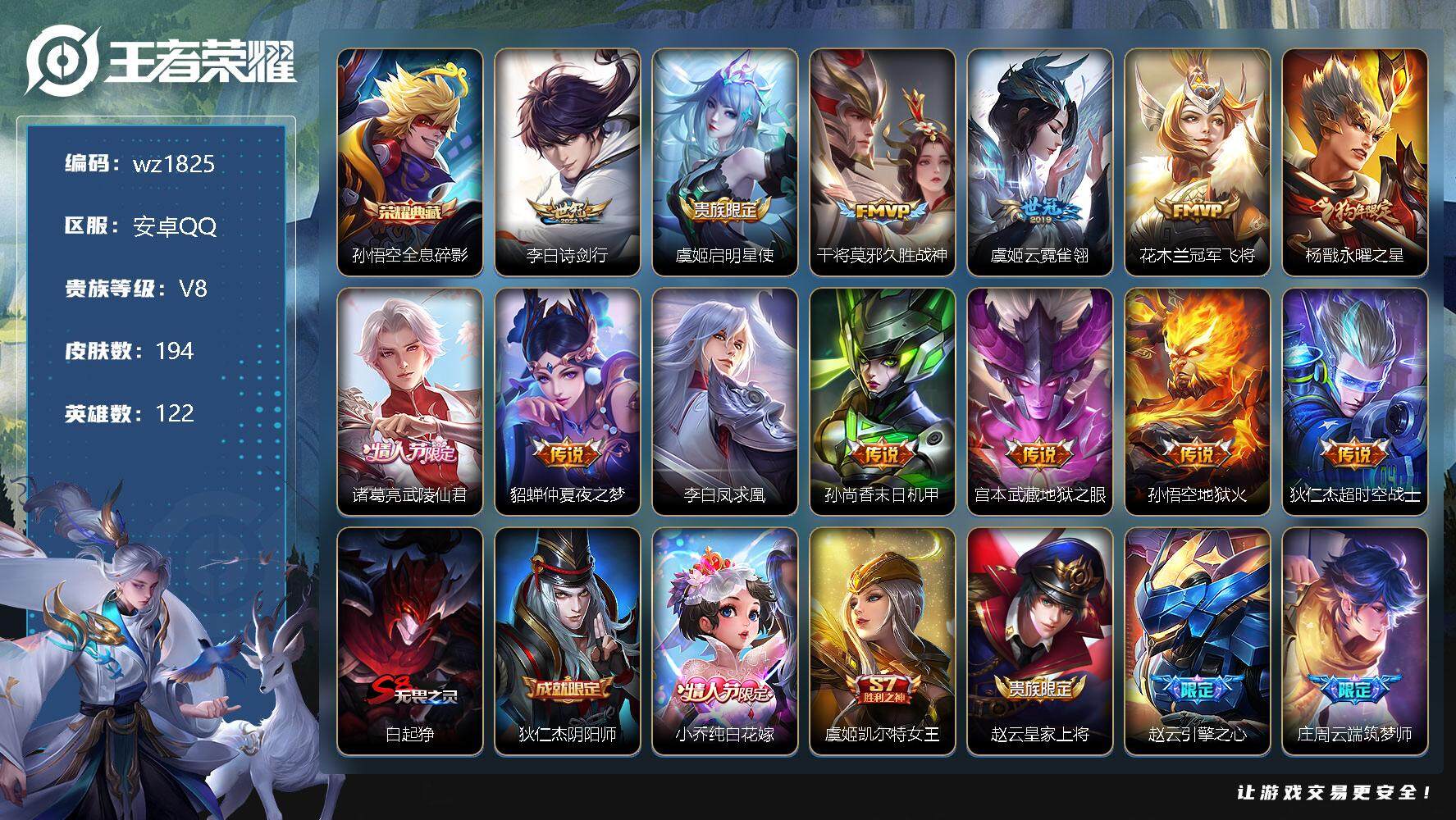 【账号佳】 【可二次实名】【wz1825】【商品标题】:安卓Q-V8-至尊星耀V段位-122英雄-194皮肤-1典藏-0珍品无双-0无双-0珍品传说-13传说-55史诗 【荣耀典藏】:孙悟空全息碎影 【传说皮肤】:李白诗剑行,虞姬启明星使,干将莫邪久胜战神,虞姬云霓雀翎,花木兰冠军飞将,杨戬永曜之星,诸葛亮武陵仙君,貂蝉仲夏夜之梦,李白凤求凰,孙尚香末日机甲,宫本武藏地狱之眼,孙悟空地狱火,狄仁杰超时空战士 【限定皮肤】:白起狰,狄仁杰阴阳师,小乔纯白花嫁,虞姬凯尔特女王,赵云皇家上将,赵云引擎之心,庄周云端筑梦师,孙膑妖精王,扁鹊炼金王,芈月重明,夏侯惇朔风刀,甄姬游园惊梦,曹操烛龙,典韦穷奇,马可波罗逐梦之星,狄仁杰魔术师,狄仁杰万华元夜,达摩沙漠行僧,项羽海滩派对,项羽霸王别姬,老夫子醍醐杖,貂蝉逐梦之音,程咬金演武夺筹,韩信逐梦之影,王昭君凤凰于飞,花木兰青春决赛季,孙悟空至尊宝,孙悟空大圣娶亲,牛魔御旌,后羿辉光之辰,虞姬霸王别姬,虞姬启明星使,杨戬永曜之星,哪吒逐梦之翼,蔡文姬繁星吟游,太乙真人饕餮,鬼谷子原初探秘者,诸葛亮武陵仙君,苏烈千军破阵,弈星混沌棋,公孙离蜜橘之夏,狂铁御狮,米莱狄御霄,盾山御銮,上官婉儿梁祝,裴擒虎梅西 【年限皮肤】:王昭君凤凰于飞,李白凤求凰,杨戬永曜之星,后羿辉光之辰 【赛季限定】:孙膑妖精王,扁鹊炼金王,白起狰,芈月重明,夏侯惇朔风刀,曹操烛龙,典韦穷奇,狄仁杰万华元夜,达摩沙漠行僧,老夫子醍醐杖,程咬金演武夺筹,牛魔御旌,虞姬凯尔特女王,太乙真人饕餮,鬼谷子原初探秘者,苏烈千军破阵,弈星混沌棋,狂铁御狮,米莱狄御霄,盾山御銮 【史诗皮肤】:鲁班七号电玩小子,项羽苍穹之光,露娜紫霞仙子,赵云嘻哈天王,赵云皇家上将,赵云未来纪元,貂蝉圣诞恋歌,狄仁杰魔术师,廉颇地狱岩魂,孙尚香水果甜心,嬴政暗夜贵公子,妲己魅力维加斯,妲己女仆咖啡,墨子金属风暴,吕布圣诞狂欢,小乔纯白花嫁,曹操幽灵船长,李白千年之狐,韩信白龙吟,项羽霸王别姬,虞姬霸王别姬,貂蝉逐梦之音,王昭君凤凰于飞,孙悟空至尊宝,赵云引擎之心,花木兰水晶猎龙者,刘邦德古拉伯爵,韩信逐梦之影,夏侯惇乘风破浪,小乔缤纷独角兽,兰陵王暗隐猎兽者,诸葛亮黄金分割率,甄姬游园惊梦,马可波罗逐梦之星,亚瑟心灵战警,安琪拉心灵骇客,后羿辉光之辰,庄周云端筑梦师,花木兰青春决赛季,百里守约特工魅影,铠曙光守护者,蔡文姬舞动绿茵,裴擒虎梅西,哪吒逐梦之翼,刘禅天才门将,公孙离蜜橘之夏,李元芳逐浪之夏,孙悟空大圣娶亲,狄仁杰鹰眼统帅,上官婉儿梁祝,蔡文姬繁星吟游,娜可露露晚萤,云缨赞萌露比,黄忠百相守梦,公孙离涂山容容 【其他皮肤】:项羽海滩派对,韩信教廷特使,韩信街头霸王,露娜哥特玫瑰,赵云白执事,赵云忍炎影,芈月红桃皇后,程咬金星际陆战队,程咬金爱与正义,牛魔西部大镖客,宫本武藏未来纪元,安琪拉玩偶对对碰,孙膑天使之翼,姜子牙时尚教父,典韦黄金武士,亚瑟死亡骑士,达摩拳王,花木兰兔女郎,张飞五福同心,甄姬花好人间,刘备万事如意,宫本武藏万象初新,后羿阿尔法小队,狄仁杰阴阳师,刘备纽约教父,孙膑妖精王,扁鹊炼金王,关羽龙腾万里,虞姬凯尔特女王,白起狰,钟无艳海滩丽影,太乙真人饕餮,宫本武藏霸王丸,曹操烛龙,王昭君幻想奇妙夜,芈月重明,狂铁命运角斗场,老夫子功夫老勺,牛魔制霸全明星,孙尚香沉稳之力,典韦穷奇,诸葛亮掌控之力,李白敏锐之力,狂铁御狮,安琪拉如懿,大乔守护之力,米莱狄御霄,明世隐虹云星官,牛魔御旌,盾山御銮,姜子牙炽热元素使,夏侯惇朔风刀,弈星混沌棋,老夫子醍醐杖,鬼谷子原初探秘者,狄仁杰万华元夜,程咬金演武夺筹,苏烈千军破阵,马可波罗潮玩牛仔,达摩沙漠行僧,海月幻泉雾影,钟馗虚灵犬护,甄姬逆浪荇歌,高渐离落日弦歌,莱西奥踏浪烽翎,鬼谷子克喵,鲁班七号福禄兄弟,鲁班七号木偶奇遇记,高渐离金属狂潮,花木兰剑舞者,老夫子潮流仙人,程咬金华尔街大亨,曹操超能战警,张良一千零一夜,张良天堂福音,小乔万圣前夜,孙膑未来旅行,孙悟空西部大镖客,孙尚香火炮千金,妲己仙境爱丽丝,后羿精灵王,刘禅英喵野望,兰陵王隐刃,李白范海辛,钟馗地府判官,李元芳特种部队,虞姬加勒比小姐,蔡文姬蔷薇王座,夏侯惇战争骑士,马可波罗激情绿茵,苍维京掠夺者,杨戬埃及法老,诸葛亮星航指挥官,黄忠芝加哥教父,大乔伊势巫女,东皇太一东海龙王,干将莫邪第七人偶,铠龙域领主,百里守约绝影神枪,百里玄策威尼斯狂欢,苏烈爱与和平,梦奇美梦成真,女娲尼罗河女神,明世隐占星师,公孙离花间舞,杨玉环霓裳曲,裴擒虎街头旋风,弈星踏雪寻梅,米莱狄精准探案法,伽罗花见巫女,沈梦溪棒球奇才,李信灼热之刃,上官婉儿修竹墨客,嫦娥露花倒影,猪八戒年年有余,云中君荷鲁斯之眼,马超幸存者,西施归虚梦演,鲁班大师归虚梦演,蒙犽归虚梦演