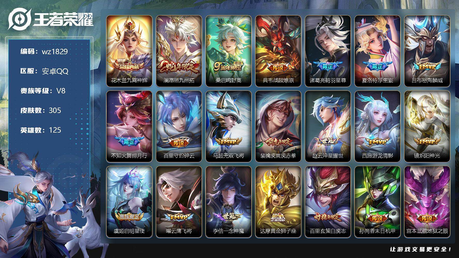 【账号佳】 【可二次实名】【wz1829】【商品标题】:安卓Q-V8-最强王者段位-125英雄-305皮肤-1典藏-0珍品无双-0无双-0珍品传说-21传说-77史诗 【英雄全皮】:刘禅全皮,蒙恬全皮,戈娅全皮,空空儿全皮 【荣耀典藏】:花木兰九霄神辉 【传说皮肤】:澜愿照九州拓,桑启鸣野蒿,典韦战鼓燎原,诸葛亮鹤羽星尊,夏洛特浮生妄,吕布怒海麟威,不知火舞绯月行,百里守约碎云,马超无双飞将,裴擒虎寅虎赤拳,赵云淬星耀世,西施游龙清影,镜炽阳神光,虞姬启明星使,曜云鹰飞将,李信一念神魔,达摩黄金狮子座,百里玄策白虎志,孙尚香末日机甲,宫本武藏地狱之眼,狄仁杰超时空战士 【限定皮肤】:姜子牙天穹之誓,狄仁杰阴阳师,赵云皇家上将,墨子神迹守卫,庄周高山流水,高渐离死亡摇滚,高渐离玩趣恶龙,钟无艳王者之锤,钟无艳超时空战士,扁鹊奇幻香踪,元歌云间偶戏,元歌无心,夏侯惇朔风刀,甄姬落雪兰心,马可波罗暗影游猎,狄仁杰魔术师,狄仁杰万华元夜,达摩星际陆战队,达摩沙漠行僧,项羽海滩派对,老夫子醍醐杖,老夫子航海奇遇记,程咬金演武夺筹,韩信逐梦之影,王昭君午后时光,兰陵王金庭之子,不知火舞绯月行,亚瑟潮玩骑士王,孙悟空至尊宝,孙悟空大圣娶亲,后羿圣弓游侠,李元芳银河之约,李元芳云中旅人,虞姬启明星使,钟馗驱傩正仪,杨戬潮玩骑兵,干将莫邪真爱魔法,雅典娜黎明之约,鬼谷子原初探秘者,鬼谷子五谷丰年,诸葛亮鹤羽星尊,苏烈千军破阵,百里玄策白虎志,百里玄策原初追逐者,弈星混沌棋,梦奇顽趣,沈梦溪星空之诺,沈梦溪大漠名商,明世隐疑决卦,裴擒虎李小龙,裴擒虎寅虎赤拳,裴擒虎擒涛扼浪,狂铁电玩高手,米莱狄胡桃异想国,盾山御銮,猪八戒西部大镖客,上官婉儿梁祝,嫦娥拒霜思,西施玲珑珍味,鲁班大师探海日志,桑启海盐诗旅,夏洛特浮生妄,戈娅驭风魔法,艾琳女武神,张良古海寻踪,蒙恬荣光圣徽,鬼谷子天穹祈灯,沈梦溪龙舞盛年,刘邦剑破天穹,程咬金群星魔术团,周瑜熔金海岸 【年限皮肤】:百里玄策白虎志,裴擒虎寅虎赤拳 【赛季限定】:夏侯惇朔风刀,狄仁杰万华元夜,达摩沙漠行僧,老夫子醍醐杖,程咬金演武夺筹,兰陵王金庭之子,张良古海寻踪,李元芳云中旅人,钟馗驱傩正仪,雅典娜黎明之约,鬼谷子原初探秘者,苏烈千军破阵,百里玄策原初追逐者,弈星混沌棋,梦奇顽趣,沈梦溪大漠名商,明世隐疑决卦,裴擒虎擒涛扼浪,盾山御銮,鲁班大师探海日志,桑启海盐诗旅,鬼谷子天穹祈灯,蒙恬荣光圣徽,刘邦剑破天穹,姜子牙天穹之誓 【战令限定】:墨子神迹守卫,钟无艳超时空战士,扁鹊奇幻香踪,元歌云间偶戏,甄姬落雪兰心,马可波罗暗影游猎,达摩星际陆战队,老夫子航海奇遇记,王昭君午后时光,亚瑟潮玩骑士王,后羿圣弓游侠,李元芳银河之约,杨戬潮玩骑兵,干将莫邪真爱魔法,沈梦溪星空之诺,狂铁电玩高手,米莱狄胡桃异想国,猪八戒西部大镖客,西施玲珑珍味,戈娅驭风魔法 【史诗皮肤】:鲁班七号电玩小子,项羽苍穹之光,露娜紫霞仙子,钟无艳王者之锤,赵云皇家上将,赵云未来纪元,王昭君偶像歌手,狄仁杰魔术师,廉颇地狱岩魂,宫本武藏鬼剑武藏,孙尚香水果甜心,嬴政摇滚巨星,妲己魅力维加斯,妲己女仆咖啡,墨子金属风暴,吕布圣诞狂欢,刘禅绅士熊喵,曹操幽灵船长,李白千年之狐,吕布末日机甲,张飞乱世虎臣,孙悟空至尊宝,花木兰水晶猎龙者,刘邦德古拉伯爵,韩信逐梦之影,夏侯惇乘风破浪,兰陵王暗隐猎兽者,亚瑟心灵战警,安琪拉心灵骇客,百里守约特工魅影,铠曙光守护者,刘禅天才门将,李元芳逐浪之夏,程咬金功夫厨神,白起星夜王子,阿轲节奏热浪,孙策猫狗日记,大乔猫狗日记,孙悟空大圣娶亲,狄仁杰鹰眼统帅,公孙离无限星赏官,上官婉儿梁祝,李元芳银河之约,娜可露露晚萤,小乔青蛇,橘右京修罗,马可波罗暗影游猎,百里玄策原初追逐者,裴擒虎李小龙,元歌云间偶戏,米莱狄胡桃异想国,老夫子航海奇遇记,干将莫邪真爱魔法,钟馗乐园奇幻夜,庄周高山流水,司马懿暗渊魔法,嫦娥拒霜思,雅典娜黎明之约,澜赏金猎手,貂蝉唤灵魅影,狂铁电玩高手,钟无艳超时空战士,鬼谷子五谷丰年,元歌无心,梦奇顽趣,扁鹊奇幻香踪,刘禅电玩爆裂旋风,戈娅驭风魔法,蒙恬荣光圣徽,马可波罗星界特工,牛魔星界战将,白起苍鳞隐世,刘禅鸭鸭历险记,狂铁龙之律动,老夫子藏狐褐绒,黄忠百相守梦,公孙离涂山容容 【其他皮肤】:项羽海滩派对,韩信教廷特使,韩信街头霸王,露娜哥特玫瑰,阿轲爱心护理,达摩大发明家,赵云白执事,赵云忍炎影,芈月红桃皇后,艾琳女武神,程咬金星际陆战队,白起白色死神,牛魔西部大镖客,武则天东方不败,扁鹊化身博士,扁鹊救世之瞳,宫本武藏未来纪元,安琪拉玩偶对对碰,孙膑天使之翼,姜子牙时尚教父,妲己少女阿狸,典韦黄金武士,亚瑟死亡骑士,达摩拳王,花木兰兔女郎,张飞五福同心,甄姬花好人间,刘备万事如意,宫本武藏万象初新,后羿