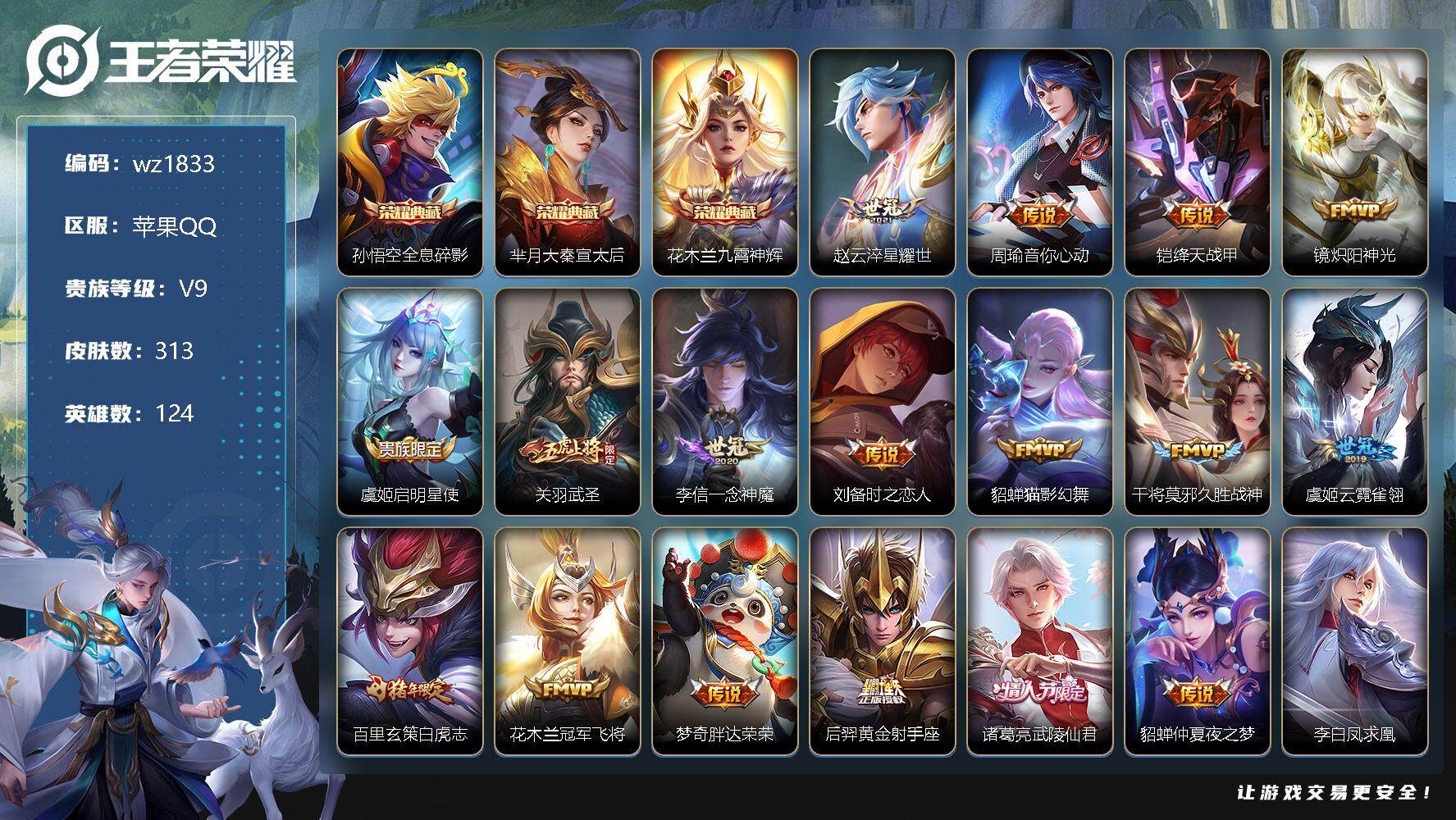 【账号佳】 【可二次实名】【wz1833】【商品标题】:苹果Q-V9-永恒钻石III段位-124英雄-313皮肤-3典藏-0珍品无双-0无双-0珍品传说-22传说-91史诗 【英雄全皮】:鬼谷子全皮 【荣耀典藏】:孙悟空全息碎影,芈月大秦宣太后,花木兰九霄神辉 【传说皮肤】:赵云淬星耀世,周瑜音你心动,铠绛天战甲,镜炽阳神光,虞姬启明星使,关羽武圣,李信一念神魔,刘备时之恋人,貂蝉猫影幻舞,干将莫邪久胜战神,虞姬云霓雀翎,百里玄策白虎志,花木兰冠军飞将,梦奇胖达荣荣,后羿黄金射手座,诸葛亮武陵仙君,貂蝉仲夏夜之梦,李白凤求凰,孙尚香末日机甲,宫本武藏地狱之眼,孙悟空地狱火,吕布天魔缭乱 【限定皮肤】:白起狰,狄仁杰阴阳师,小乔纯白花嫁,虞姬凯尔特女王,赵云皇家上将,赵云引擎之心,妲己时之彼端,嬴政优雅恋人,嬴政白昼王子,鲁班七号狮舞东方,庄周蜃楼王,庄周云端筑梦师,高渐离玩趣恶龙,阿轲迷踪丽影,钟无艳王者之锤,钟无艳超时空战士,孙膑妖精王,扁鹊炼金王,芈月重明,吕布天魔缭乱,吕布猎兽之王,周瑜赤莲之焰,夏侯惇朔风刀,甄姬游园惊梦,甄姬落雪兰心,曹操烛龙,典韦穷奇,马可波罗逐梦之星,马可波罗暗影游猎,狄仁杰魔术师,狄仁杰万华元夜,达摩沙漠行僧,项羽海滩派对,老夫子醍醐杖,关羽冰锋战神,关羽武圣,程咬金演武夺筹,露娜一生所爱,刘邦夺宝奇兵,韩信逐梦之影,韩信飞衡,兰陵王驯魔猎人,花木兰青春决赛季,花木兰瑞麟志,孙悟空至尊宝,孙悟空大圣娶亲,牛魔御旌,后羿辉光之辰,李元芳银河之约,李元芳云中旅人,虞姬霸王别姬,虞姬启明星使,钟馗神迹守卫,钟馗驱傩正仪,杨玉环遇见飞天,女娲朔望之晖,干将莫邪冰霜恋舞曲,雅典娜单词大作战,雅典娜黎明之约,蔡文姬繁星吟游,太乙真人饕餮,太乙真人华丽摇滚,鬼谷子原初探秘者,鬼谷子五谷丰年,诸葛亮武陵仙君,苏烈玄武志,苏烈千军破阵,百里玄策白虎志,百里玄策原初追逐者,弈星混沌棋,沈梦溪星空之诺,沈梦溪大漠名商,明世隐疑决卦,裴擒虎李小龙,裴擒虎擒涛扼浪,狂铁御狮,米莱狄御霄,云中君纤云弄巧,盾山御銮,猪八戒西部大镖客,上官婉儿梁祝,蒙犽狂想玩偶喵,鲁班大师探海日志,桑启海盐诗旅,张良古海寻踪,裴擒虎梅西,鬼谷子天穹祈灯,刘邦剑破天穹 【年限皮肤】:百里玄策白虎志,花木兰瑞麟志,苏烈玄武志,李白凤求凰,后羿辉光之辰,韩信飞衡,关羽武圣 【赛季限定】:庄周蜃楼王,孙膑妖精王,扁鹊炼金王,白起狰,芈月重明,夏侯惇朔风刀,曹操烛龙,典韦穷奇,狄仁杰万华元夜,达摩沙漠行僧,老夫子醍醐杖,程咬金演武夺筹,张良古海寻踪,牛魔御旌,李元芳云中旅人,虞姬凯尔特女王,钟馗驱傩正仪,雅典娜黎明之约,太乙真人饕餮,鬼谷子原初探秘者,苏烈千军破阵,百里玄策原初追逐者,弈星混沌棋,沈梦溪大漠名商,明世隐疑决卦,裴擒虎擒涛扼浪,狂铁御狮,米莱狄御霄,盾山御銮,鲁班大师探海日志,桑启海盐诗旅,鬼谷子天穹祈灯,刘邦剑破天穹 【战令限定】:嬴政白昼王子,鲁班七号狮舞东方,阿轲迷踪丽影,钟无艳超时空战士,吕布猎兽之王,周瑜赤莲之焰,甄姬落雪兰心,马可波罗暗影游猎,刘邦夺宝奇兵,兰陵王驯魔猎人,李元芳银河之约,钟馗神迹守卫,女娲朔望之晖,雅典娜单词大作战,沈梦溪星空之诺,猪八戒西部大镖客,蒙犽狂想玩偶喵 【史诗皮肤】:鲁班七号电玩小子,项羽苍穹之光,露娜紫霞仙子,阿轲暗夜猫娘,钟无艳王者之锤,赵云皇家上将,赵云未来纪元,貂蝉圣诞恋歌,甄姬冰雪圆舞曲,王昭君偶像歌手,狄仁杰魔术师,廉颇地狱岩魂,宫本武藏鬼剑武藏,孙尚香水果甜心,嬴政优雅恋人,嬴政暗夜贵公子,嬴政摇滚巨星,妲己魅力维加斯,妲己女仆咖啡,墨子金属风暴,吕布圣诞狂欢,刘禅绅士熊喵,小乔纯白花嫁,曹操幽灵船长,李白千年之狐,吕布末日机甲,张飞乱世虎臣,韩信白龙吟,虞姬霸王别姬,关羽冰锋战神,孙悟空至尊宝,赵云引擎之心,花木兰水晶猎龙者,刘邦德古拉伯爵,韩信逐梦之影,夏侯惇乘风破浪,小乔缤纷独角兽,兰陵王暗隐猎兽者,诸葛亮黄金分割率,甄姬游园惊梦,马可波罗逐梦之星,亚瑟心灵战警,雅典娜冰冠公主,安琪拉心灵骇客,后羿辉光之辰,庄周云端筑梦师,花木兰青春决赛季,百里守约特工魅影,铠曙光守护者,蔡文姬舞动绿茵,裴擒虎梅西,刘禅天才门将,李元芳逐浪之夏,程咬金功夫厨神,白起星夜王子,阿轲节奏热浪,杨玉环遇见飞天,嬴政白昼王子,孙策猫狗日记,大乔猫狗日记,干将莫邪冰霜恋舞曲,露娜一生所爱,孙悟空大圣娶亲,苏烈玄武志,花木兰瑞麟志,伽罗箭羽风息,鲁班七号狮舞东方,狄仁杰鹰眼统帅,公孙离无限星赏官,兰陵王驯魔猎人,上官婉儿梁祝,蔡文姬繁星吟游,李元芳银河之约,娜可露露晚萤,韩信飞衡,妲己时之彼端,大乔白蛇,小乔青蛇,不知火舞魅语,阿轲迷踪丽影,橘右京修罗,孙尚香时之恋人,马可波罗暗影游猎,蒙犽狂想玩偶喵,百里玄策原初追逐者,裴擒