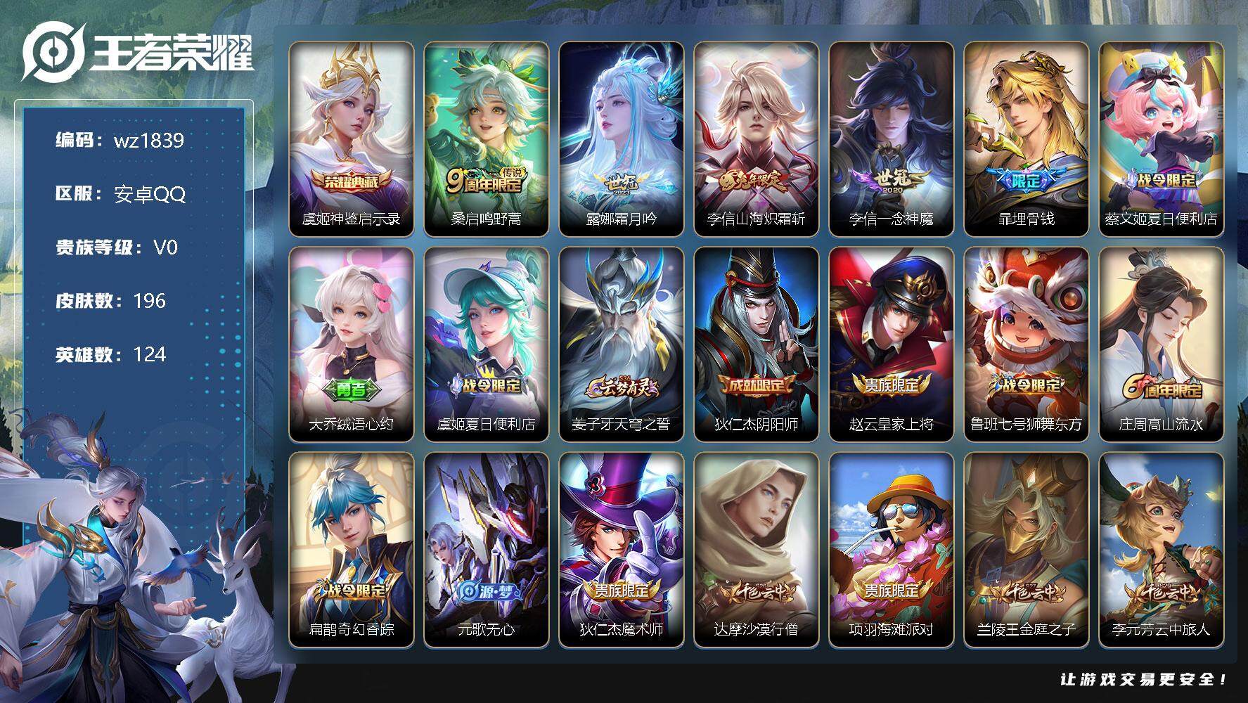 【账号佳】 【可二次实名】【wz1839】【商品标题】:安卓Q-V0-尊贵铂金II段位-124英雄-196皮肤-1典藏-0珍品无双-0无双-0珍品传说-4传说-52史诗 【英雄全皮】:李信全皮 【荣耀典藏】:虞姬神鉴启示录 【传说皮肤】:桑启鸣野蒿,露娜霜月吟,李信山海炽霜斩,李信一念神魔 【限定皮肤】:暃埋骨钱,蔡文姬夏日便利店,大乔绒语心约,虞姬夏日便利店,姜子牙天穹之誓,狄仁杰阴阳师,赵云皇家上将,鲁班七号狮舞东方,庄周高山流水,扁鹊奇幻香踪,元歌无心,狄仁杰魔术师,达摩沙漠行僧,项羽海滩派对,兰陵王金庭之子,李元芳云中旅人,钟馗驱傩正仪,杨戬潮玩骑兵,干将莫邪胡桃夹子,太乙真人华丽摇滚,鬼谷子五谷丰年,苏烈千军破阵,沈梦溪大漠名商,裴擒虎李小龙,裴擒虎擒涛扼浪,云中君纤云弄巧,李信山海炽霜斩,上官婉儿梁祝,嫦娥拒霜思,西施玲珑珍味,鲁班大师探海日志,桑启海盐诗旅,戈娅驭风魔法,艾琳流音漫舞,司空震地狱燃心,阿古朵江河有灵,张良古海寻踪,蒙犽百解令,鬼谷子天穹祈灯,姬小满妄想食味,安琪拉乘龙聚宝船,沈梦溪龙舞盛年,刘邦剑破天穹,程咬金群星魔术团,镜青焰无极,项羽苍威无极,刘备异域游侠,周瑜熔金海岸 【年限皮肤】:李信山海炽霜斩,安琪拉乘龙聚宝船 【赛季限定】:达摩沙漠行僧,兰陵王金庭之子,张良古海寻踪,李元芳云中旅人,钟馗驱傩正仪,苏烈千军破阵,沈梦溪大漠名商,裴擒虎擒涛扼浪,鲁班大师探海日志,桑启海盐诗旅,鬼谷子天穹祈灯,刘邦剑破天穹,姜子牙天穹之誓 【战令限定】:蔡文姬夏日便利店,虞姬夏日便利店,鲁班七号狮舞东方,扁鹊奇幻香踪,艾琳流音漫舞,杨戬潮玩骑兵,西施玲珑珍味,司空震地狱燃心,戈娅驭风魔法,镜青焰无极,项羽苍威无极 【史诗皮肤】:赵云皇家上将,赵云未来纪元,貂蝉圣诞恋歌,甄姬冰雪圆舞曲,王昭君偶像歌手,狄仁杰魔术师,廉颇地狱岩魂,宫本武藏鬼剑武藏,孙尚香水果甜心,嬴政暗夜贵公子,嬴政摇滚巨星,妲己魅力维加斯,妲己女仆咖啡,墨子金属风暴,吕布圣诞狂欢,刘禅绅士熊喵,曹操幽灵船长,吕布末日机甲,花木兰水晶猎龙者,小乔缤纷独角兽,兰陵王暗隐猎兽者,诸葛亮黄金分割率,雅典娜冰冠公主,百里守约特工魅影,白起星夜王子,阿轲节奏热浪,鲁班七号狮舞东方,狄仁杰鹰眼统帅,上官婉儿梁祝,裴擒虎李小龙,云中君纤云弄巧,庄周高山流水,嫦娥拒霜思,澜赏金猎手,弈星滕王阁序,鬼谷子五谷丰年,元歌无心,扁鹊奇幻香踪,戈娅驭风魔法,司空震地狱燃心,阿古朵江河有灵,蒙犽百解令,姬小满妄想食味,安琪拉乘龙聚宝船,镜青焰无极,蔡文姬夏日便利店,暃埋骨钱,大司命东方月初,姬小满战舞者,亚连破空之剑,弈星炽弈燎原,百里守约百相守梦 【其他皮肤】:项羽海滩派对,韩信教廷特使,韩信街头霸王,露娜哥特玫瑰,阿轲爱心护理,赵云白执事,赵云忍炎影,牛魔西部大镖客,扁鹊化身博士,宫本武藏未来纪元,安琪拉玩偶对对碰,姜子牙时尚教父,妲己少女阿狸,亚瑟死亡骑士,花木兰兔女郎,甄姬花好人间,后羿阿尔法小队,狄仁杰阴阳师,刘备纽约教父,刘备汉昭烈帝,李元芳黑猫爱糖果,关羽龙腾万里,钟无艳海滩丽影,王昭君幻想奇妙夜,老夫子功夫老勺,孙尚香沉稳之力,李白敏锐之力,太乙真人华丽摇滚,大乔守护之力,明世隐虹云星官,吕布野性能量,孙膑归虚梦演,沈梦溪鲨炮海盗猫,姜子牙炽热元素使,哪吒次元突破,盾山圆桌骑士,狂铁特工战影,刘禅秘密基地,露娜瓷语鉴心,张良缤纷绘卷,钟馗驱傩正仪,鲁班大师乓乓大师,苏烈千军破阵,干将莫邪胡桃夹子,达摩沙漠行僧,兰陵王金庭之子,刘禅唤灵魔甲,米莱狄契约魔法,沈梦溪大漠名商,蒙恬蔚蓝守将,李元芳云中旅人,刘备潮玩造梦师,桑启海盐诗旅,猪八戒潮玩探月行,白起乐园追猎者,赵怀真太极少年,裴擒虎擒涛扼浪,杨戬潮玩骑兵,太乙真人劲辣红锅,莱西奥西部游侠,鲁班大师探海日志,西施玲珑珍味,李元芳妄想特派,哪吒热血海滩,艾琳流音漫舞,张良古海寻踪,钟无艳聚星闪耀,海月王牌新星,亚连破局者,兰陵王幻夜行动,曹操决胜大满贯,后羿完美运算,鬼谷子天穹祈灯,海诺时空谍影,嫦娥漠中幻影,朵莉亚金色潮汐,廉颇功夫炙烤,沈梦溪龙舞盛年,钟无艳春野之旅,扁鹊无尽旅途,刘邦剑破天穹,盘古经纬探寻者,程咬金群星魔术团,项羽苍威无极,大司命暗都幽影,刘备异域游侠,姜子牙天穹之誓,周瑜熔金海岸,虞姬夏日便利店,大乔绒语心约,孙悟空神迹守卫,盘古敬我三分,东皇太一噬灭天穹,老夫子百相守梦,吕布逐霄战戟,西施雪境奇遇,钟馗虚灵犬护,露娜命运加冕,姬小满小满鸭,白起死霸装,鲁班七号福禄兄弟,鲁班七号木偶奇遇记,高渐离金属狂潮,露娜绯红之刃,钟无艳生化警戒,王昭君精灵公主,曹操超能战警,小乔万圣前夜,孙膑未来旅行,孙悟空西部大镖客,周瑜海军大将,后羿精灵王,刘禅英喵野望,李元芳特种部队,雅典娜战争女神,杨戬埃及法老,太乙真