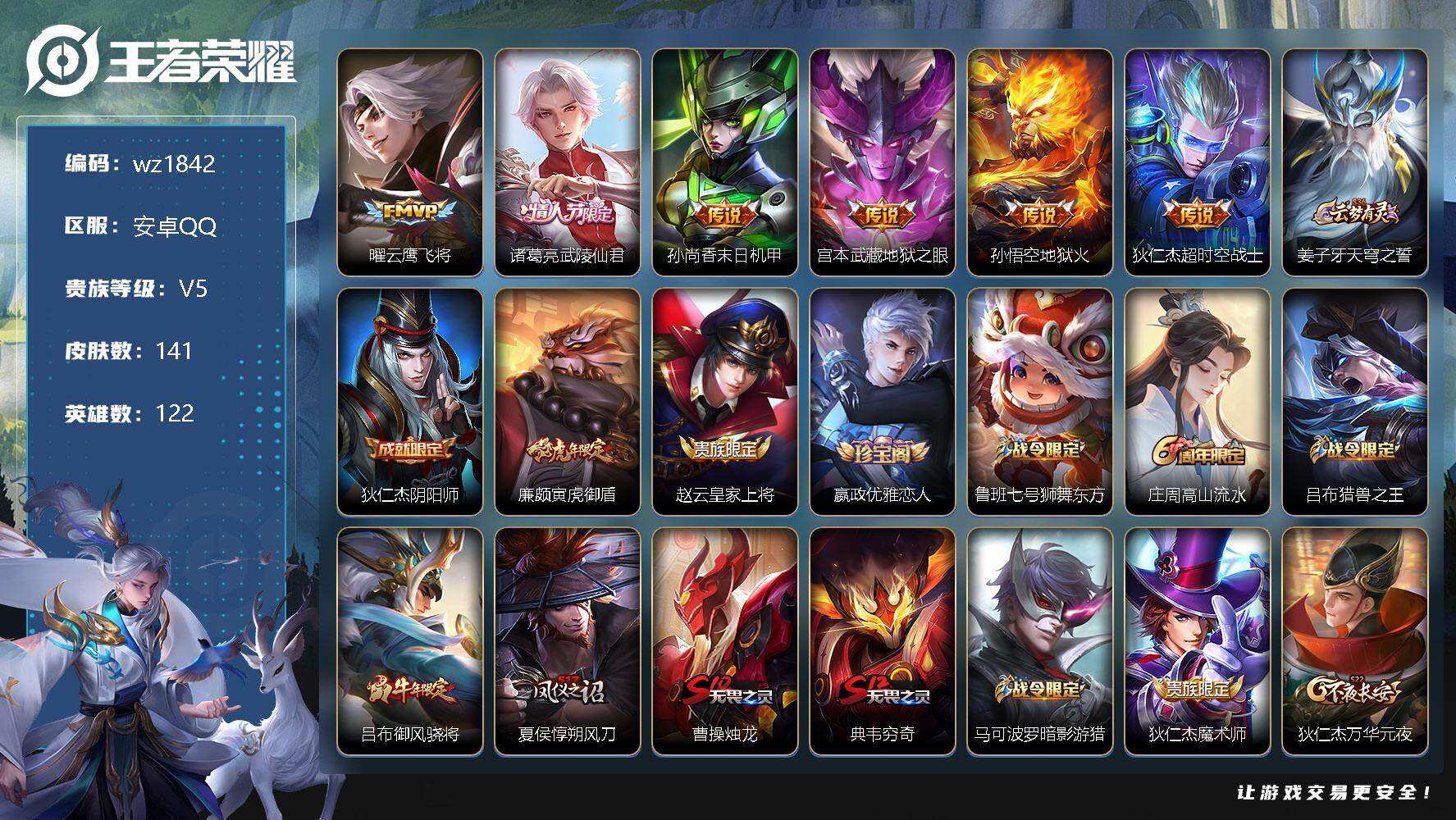 【账号佳】 【可二次实名】【wz1842】安卓Q-V5-至尊星耀IV段位-122英雄-141皮肤-0典藏-0珍品无双-0无双-0珍品传说-6传说-41史诗 【传说皮肤】:曜云鹰飞将,诸葛亮武陵仙君,孙尚香末日机甲,宫本武藏地狱之眼,孙悟空地狱火,狄仁杰超时空战士 【限定皮肤】:姜子牙天穹之誓,狄仁杰阴阳师,廉颇寅虎御盾,赵云皇家上将,嬴政优雅恋人,鲁班七号狮舞东方,庄周高山流水,吕布猎兽之王,吕布御风骁将,夏侯惇朔风刀,曹操烛龙,典韦穷奇,马可波罗暗影游猎,狄仁杰魔术师,狄仁杰万华元夜,达摩沙漠行僧,项羽海滩派对,老夫子醍醐杖,程咬金演武夺筹,韩信飞衡,兰陵王金庭之子,牛魔御旌,李元芳云中旅人,钟馗神迹守卫,钟馗驱傩正仪,杨玉环寅虎心曲,干将莫邪冰霜恋舞曲,太乙真人饕餮,鬼谷子原初探秘者,诸葛亮武陵仙君,苏烈千军破阵,弈星混沌棋,明世隐疑决卦,裴擒虎天狼狩猎者,裴擒虎李小龙,狂铁御狮,米莱狄御霄,云中君纤云弄巧,盾山御銮,猪八戒西部大镖客,上官婉儿梁祝,桑启海盐诗旅,鬼谷子天穹祈灯,刘邦剑破天穹,周瑜熔金海岸 【年限皮肤】:杨玉环寅虎心曲,廉颇寅虎御盾,吕布御风骁将,韩信飞衡 【赛季限定】:夏侯惇朔风刀,曹操烛龙,典韦穷奇,狄仁杰万华元夜,达摩沙漠行僧,老夫子醍醐杖,程咬金演武夺筹,兰陵王金庭之子,牛魔御旌,李元芳云中旅人,钟馗驱傩正仪,太乙真人饕餮,鬼谷子原初探秘者,苏烈千军破阵,弈星混沌棋,明世隐疑决卦,狂铁御狮,米莱狄御霄,盾山御銮,桑启海盐诗旅,鬼谷子天穹祈灯,刘邦剑破天穹,姜子牙天穹之誓 【战令限定】:鲁班七号狮舞东方,吕布猎兽之王,马可波罗暗影游猎,钟馗神迹守卫,猪八戒西部大镖客 【史诗皮肤】:露娜紫霞仙子,阿轲暗夜猫娘,赵云皇家上将,貂蝉圣诞恋歌,甄姬冰雪圆舞曲,王昭君偶像歌手,狄仁杰魔术师,孙尚香水果甜心,嬴政优雅恋人,嬴政暗夜贵公子,妲己女仆咖啡,墨子金属风暴,吕布圣诞狂欢,曹操幽灵船长,李白千年之狐,吕布末日机甲,张飞乱世虎臣,花木兰水晶猎龙者,刘邦德古拉伯爵,兰陵王暗隐猎兽者,诸葛亮黄金分割率,安琪拉心灵骇客,百里守约特工魅影,铠曙光守护者,阿轲节奏热浪,干将莫邪冰霜恋舞曲,伽罗箭羽风息,裴擒虎天狼狩猎者,鲁班七号狮舞东方,狄仁杰鹰眼统帅,上官婉儿梁祝,韩信飞衡,橘右京修罗,马可波罗暗影游猎,裴擒虎李小龙,云中君纤云弄巧,吕布御风骁将,庄周高山流水,杨玉环寅虎心曲,廉颇寅虎御盾,夏洛特永昼 【其他皮肤】:项羽海滩派对,韩信教廷特使,韩信街头霸王,露娜哥特玫瑰,阿轲爱心护理,达摩大发明家,程咬金星际陆战队,白起白色死神,扁鹊化身博士,扁鹊救世之瞳,姜子牙时尚教父,刘备万事如意,狄仁杰阴阳师,刘备汉昭烈帝,关羽龙腾万里,钟无艳海滩丽影,太乙真人饕餮,宫本武藏霸王丸,曹操烛龙,狂铁命运角斗场,典韦穷奇,狂铁御狮,米莱狄御霄,吕布猎兽之王,明世隐虹云星官,牛魔御旌,吕布野性能量,钟馗神迹守卫,盾山御銮,孙膑归虚梦演,沈梦溪鲨炮海盗猫,姜子牙炽热元素使,夏侯惇朔风刀,弈星混沌棋,哪吒次元突破,鲁班七号黑桃队长,明世隐疑决卦,盾山圆桌骑士,老夫子醍醐杖,猪八戒西部大镖客,狂铁特工战影,鬼谷子原初探秘者,狄仁杰万华元夜,杨戬次元傲视,程咬金演武夺筹,张良缤纷绘卷,钟馗驱傩正仪,鲁班大师乓乓大师,苏烈千军破阵,达摩沙漠行僧,程咬金无双福将,兰陵王金庭之子,蒙恬蔚蓝守将,李元芳云中旅人,桑启海盐诗旅,后羿完美运算,鬼谷子天穹祈灯,朵莉亚金色潮汐,刘邦剑破天穹,姜子牙天穹之誓,周瑜熔金海岸,太乙真人谧流熔炉,明世隐景韶洛都,鲁班七号福禄兄弟,高渐离金属狂潮,花木兰剑舞者,狄仁杰锦衣卫,张良一千零一夜,孙悟空西部大镖客,后羿精灵王,兰陵王隐刃,李元芳特种部队,虞姬加勒比小姐,关羽天启骑士,雅典娜战争女神,杨戬埃及法老,哪吒三太子,黄忠芝加哥教父,铠龙域领主,梦奇美梦成真,公孙离花间舞,元歌午夜歌剧院,孙策海之征途,司马懿魇语军师,李信灼热之刃,嫦娥露花倒影,曜归虚梦演,蒙犽归虚梦演,蒙恬秩序猎龙将,澜孤猎,司空震启蛰,云缨赤焰之缨,暃碧珀绯影,桑启画中游 【内测皮肤】:嬴政优雅恋人,狂铁特工战影 【营地ID】:488466418