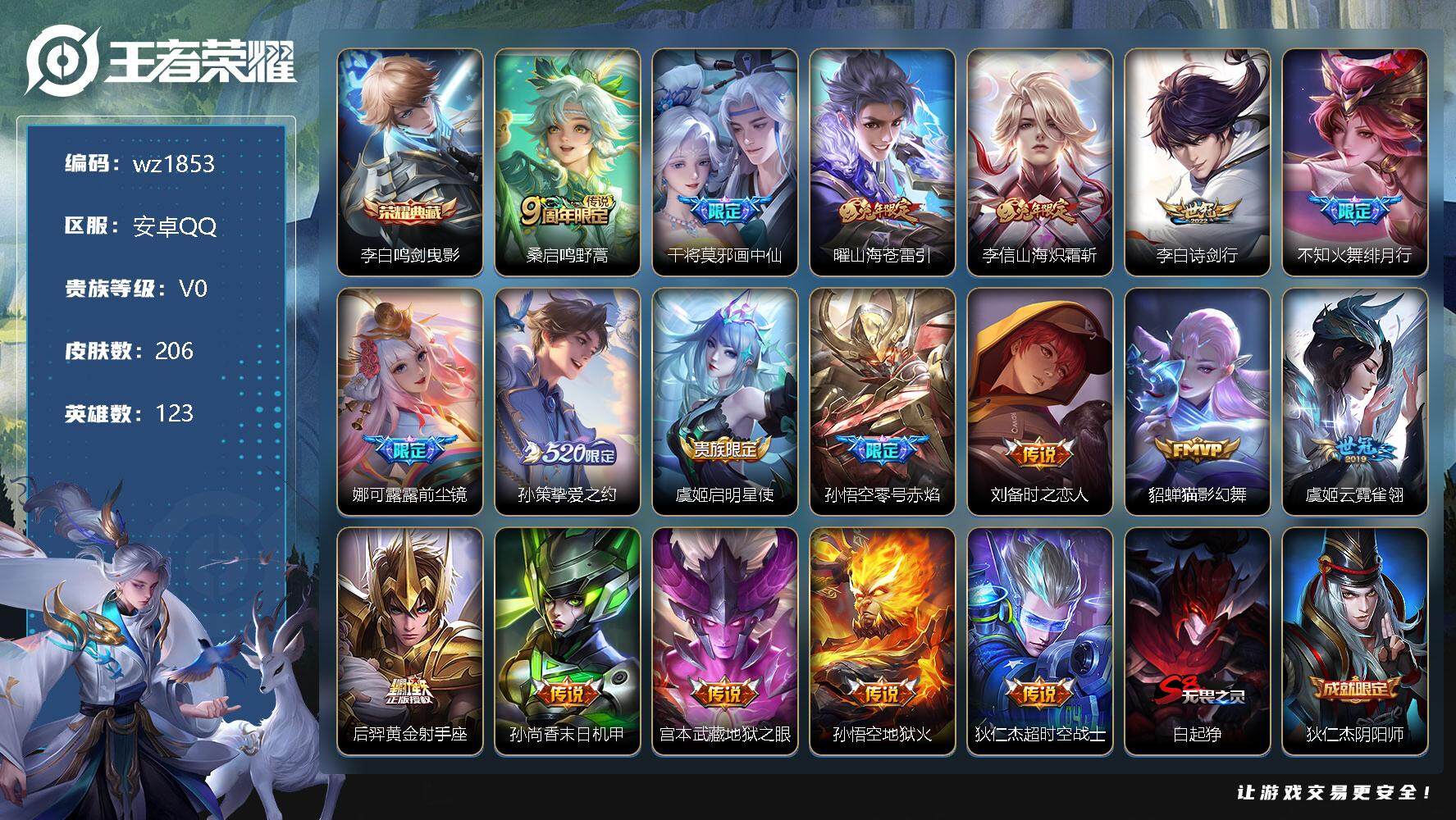 【账号佳】 【可二次实名】【wz1853】安卓Q-V0-永恒钻石IV段位-123英雄-206皮肤-1典藏-0珍品无双-0无双-0珍品传说-18传说-48史诗 【荣耀典藏】:李白鸣剑曳影 【传说皮肤】:桑启鸣野蒿,干将莫邪画中仙,曜山海苍雷引,李信山海炽霜斩,李白诗剑行,不知火舞绯月行,娜可露露前尘镜,孙策挚爱之约,虞姬启明星使,孙悟空零号赤焰,刘备时之恋人,貂蝉猫影幻舞,虞姬云霓雀翎,后羿黄金射手座,孙尚香末日机甲,宫本武藏地狱之眼,孙悟空地狱火,狄仁杰超时空战士 【限定皮肤】:白起狰,狄仁杰阴阳师,赵云皇家上将,墨子神迹守卫,高渐离玩趣恶龙,钟无艳超时空战士,元歌云间偶戏,元歌无心,夏侯惇朔风刀,甄姬落雪兰心,曹操烛龙,马可波罗山海玄木吟,狄仁杰魔术师,狄仁杰万华元夜,项羽海滩派对,老夫子醍醐杖,老夫子航海奇遇记,程咬金演武夺筹,王昭君午后时光,兰陵王金庭之子,花木兰默契交锋,不知火舞绯月行,娜可露露前尘镜,亚瑟潮玩骑士王,孙悟空零号赤焰,牛魔御旌,李元芳云中旅人,虞姬启明星使,钟馗神迹守卫,钟馗驱傩正仪,干将莫邪冰霜恋舞曲,干将莫邪真爱魔法,干将莫邪画中仙,雅典娜单词大作战,雅典娜黎明之约,太乙真人饕餮,鬼谷子原初探秘者,鬼谷子五谷丰年,百里守约朱雀志,梦奇顽趣,沈梦溪大漠名商,明世隐疑决卦,裴擒虎李小龙,裴擒虎擒涛扼浪,狂铁御狮,狂铁电玩高手,米莱狄御霄,云中君纤云弄巧,李信山海炽霜斩,伽罗天狼溯光者,孙策挚爱之约,嫦娥暖冬兔眠,曜山海苍雷引,蒙犽狂想玩偶喵,鲁班大师探海日志,桑启海盐诗旅,暃星界游侠,张良古海寻踪,蒙恬荣光圣徽,鬼谷子天穹祈灯 【年限皮肤】:百里守约朱雀志,马可波罗山海玄木吟,李信山海炽霜斩,曜山海苍雷引 【赛季限定】:白起狰,夏侯惇朔风刀,曹操烛龙,狄仁杰万华元夜,老夫子醍醐杖,程咬金演武夺筹,兰陵王金庭之子,张良古海寻踪,牛魔御旌,李元芳云中旅人,钟馗驱傩正仪,雅典娜黎明之约,太乙真人饕餮,鬼谷子原初探秘者,梦奇顽趣,沈梦溪大漠名商,明世隐疑决卦,裴擒虎擒涛扼浪,狂铁御狮,米莱狄御霄,鲁班大师探海日志,桑启海盐诗旅,鬼谷子天穹祈灯,蒙恬荣光圣徽 【战令限定】:墨子神迹守卫,钟无艳超时空战士,元歌云间偶戏,甄姬落雪兰心,老夫子航海奇遇记,王昭君午后时光,亚瑟潮玩骑士王,钟馗神迹守卫,干将莫邪真爱魔法,雅典娜单词大作战,狂铁电玩高手,嫦娥暖冬兔眠,蒙犽狂想玩偶喵,暃星界游侠 【史诗皮肤】:露娜紫霞仙子,赵云皇家上将,赵云未来纪元,貂蝉圣诞恋歌,王昭君偶像歌手,狄仁杰魔术师,宫本武藏鬼剑武藏,孙尚香水果甜心,嬴政摇滚巨星,妲己魅力维加斯,墨子金属风暴,曹操幽灵船长,吕布末日机甲,刘邦德古拉伯爵,夏侯惇乘风破浪,兰陵王暗隐猎兽者,诸葛亮黄金分割率,亚瑟心灵战警,雅典娜冰冠公主,安琪拉心灵骇客,铠曙光守护者,李元芳逐浪之夏,程咬金功夫厨神,白起星夜王子,阿轲节奏热浪,百里守约朱雀志,干将莫邪冰霜恋舞曲,狄仁杰鹰眼统帅,不知火舞魅语,橘右京修罗,孙尚香时之恋人,蒙犽狂想玩偶喵,裴擒虎李小龙,云中君纤云弄巧,元歌云间偶戏,花木兰默契交锋,老夫子航海奇遇记,伽罗天狼溯光者,干将莫邪真爱魔法,雅典娜黎明之约,狂铁电玩高手,钟无艳超时空战士,鬼谷子五谷丰年,元歌无心,梦奇顽趣,暃星界游侠,马可波罗山海玄木吟,蒙恬荣光圣徽 【其他皮肤】:项羽海滩派对,韩信教廷特使,韩信街头霸王,露娜哥特玫瑰,阿轲爱心护理,白起白色死神,牛魔西部大镖客,武则天东方不败,扁鹊化身博士,安琪拉玩偶对对碰,孙膑天使之翼,妲己少女阿狸,亚瑟死亡骑士,达摩拳王,张飞五福同心,甄姬花好人间,刘备万事如意,宫本武藏万象初新,后羿阿尔法小队,狄仁杰阴阳师,刘备纽约教父,刘备汉昭烈帝,关羽龙腾万里,墨子进击墨子号,白起狰,太乙真人饕餮,宫本武藏霸王丸,曹操烛龙,老夫子功夫老勺,李白敏锐之力,鬼谷子幻乐之宴,狂铁御狮,苏烈坚韧之力,大乔守护之力,项羽科学大爆炸,米莱狄御霄,庄周奇妙博物学,牛魔御旌,小乔丁香结,吕布野性能量,钟馗神迹守卫,孙膑归虚梦演,高渐离玩趣恶龙,姜子牙炽热元素使,夏侯惇朔风刀,哪吒次元突破,明世隐疑决卦,盾山圆桌骑士,老夫子醍醐杖,狂铁特工战影,鬼谷子原初探秘者,雅典娜单词大作战,狄仁杰万华元夜,亚瑟潮玩骑士王,刘禅秘密基地,露娜瓷语鉴心,程咬金演武夺筹,张良缤纷绘卷,钟馗驱傩正仪,墨子神迹守卫,鲁班大师乓乓大师,程咬金无双福将,兰陵王金庭之子,王昭君午后时光,沈梦溪大漠名商,甄姬落雪兰心,李元芳云中旅人,刘备潮玩造梦师,桑启海盐诗旅,嫦娥暖冬兔眠,海月幻泉雾影,猪八戒潮玩探月行,牛魔牛运亨通,白起乐园追猎者,裴擒虎擒涛扼浪,莱西奥西部游侠,鲁班大师探海日志,张良古海寻踪,鬼谷子天穹祈灯,东皇太一噬灭天穹,雅典娜神奇女侠,鲁班七号福禄兄弟,鲁班七号木偶奇遇记