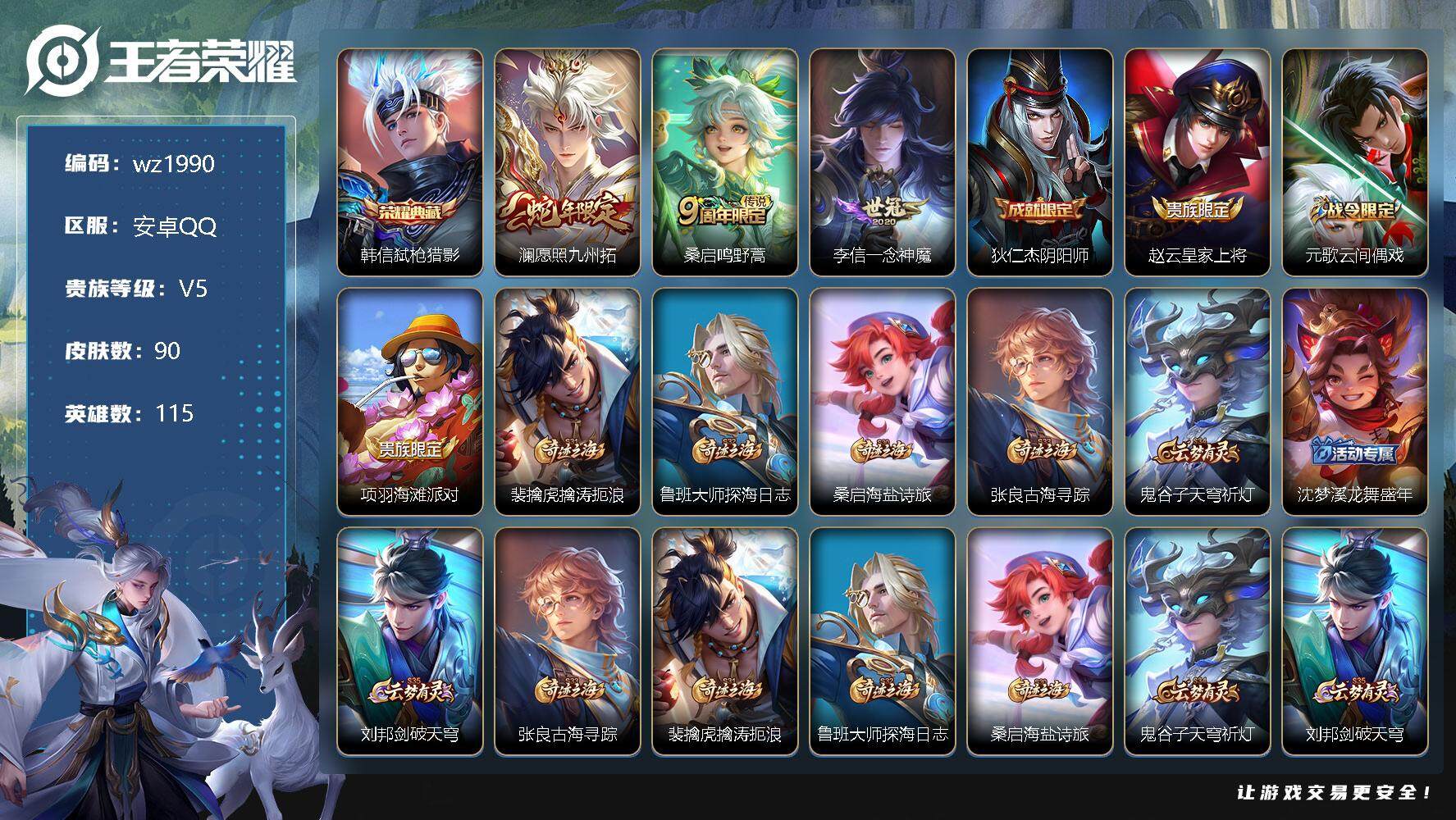【账号佳】 【可二次实名】【wz1990】安卓Q-V5-永恒钻石IV段位-115英雄-90皮肤-1典藏-0珍品无双-0无双-0珍品传说-3传说-22史诗 【荣耀典藏】:韩信弑枪猎影 【传说皮肤】:澜愿照九州拓,桑启鸣野蒿,李信一念神魔 【限定皮肤】:狄仁杰阴阳师,赵云皇家上将,元歌云间偶戏,项羽海滩派对,裴擒虎擒涛扼浪,鲁班大师探海日志,桑启海盐诗旅,张良古海寻踪,鬼谷子天穹祈灯,沈梦溪龙舞盛年,刘邦剑破天穹 【赛季限定】:张良古海寻踪,裴擒虎擒涛扼浪,鲁班大师探海日志,桑启海盐诗旅,鬼谷子天穹祈灯,刘邦剑破天穹 【战令限定】:元歌云间偶戏 【史诗皮肤】:赵云皇家上将,甄姬冰雪圆舞曲,宫本武藏鬼剑武藏,孙尚香水果甜心,妲己魅力维加斯,墨子龙骑士,吕布圣诞狂欢,张飞乱世虎臣,夏侯惇乘风破浪,小乔缤纷独角兽,雅典娜冰冠公主,铠曙光守护者,刘禅天才门将,白起星夜王子,狄仁杰鹰眼统帅,元歌云间偶戏,刘禅电玩爆裂旋风,阿轲化蝶舞,狂铁龙之律动,后羿石田雨龙,周瑜百相守梦,公孙离涂山容容 【其他皮肤】:项羽海滩派对,韩信教廷特使,韩信街头霸王,达摩大发明家,赵云忍炎影,白起白色死神,妲己少女阿狸,典韦黄金武士,亚瑟死亡骑士,达摩拳王,花木兰兔女郎,宫本武藏万象初新,狄仁杰阴阳师,刘备纽约教父,刘备汉昭烈帝,关羽龙腾万里,钟无艳海滩丽影,李白敏锐之力,大乔守护之力,小乔丁香结,狂铁特工战影,桑启海盐诗旅,裴擒虎擒涛扼浪,太乙真人劲辣红锅,鲁班大师探海日志,姬小满零食大作战,李元芳妄想特派,张良古海寻踪,后羿完美运算,鬼谷子天穹祈灯,海诺时空谍影,沈梦溪龙舞盛年,钟无艳春野之旅,刘邦剑破天穹,太乙真人谧流熔炉,戈娅玫蓝誓约,刘备浪漫序章,钟馗虚灵犬护,苏烈春野闲踪,小乔秘证寻踪,张良灵野札记,阿古朵布丁狗之约,露娜命运加冕,白起死霸装,甄姬逆浪荇歌,孙策百相守梦,哪吒罗小黑战记,亚瑟荣光之誓,项羽帝国元帅,曹操超能战警,孙悟空西部大镖客,虞姬加勒比小姐,关羽天启骑士,夏侯惇战争骑士,马可波罗激情绿茵,铠龙域领主,百里守约绝影神枪,苏烈爱与和平,明世隐占星师,马超幸存者,镜冰刃幻境,澜孤猎,司空震启蛰,云缨赤焰之缨 【内测皮肤】:狂铁特工战影 【营地ID】:1703126798