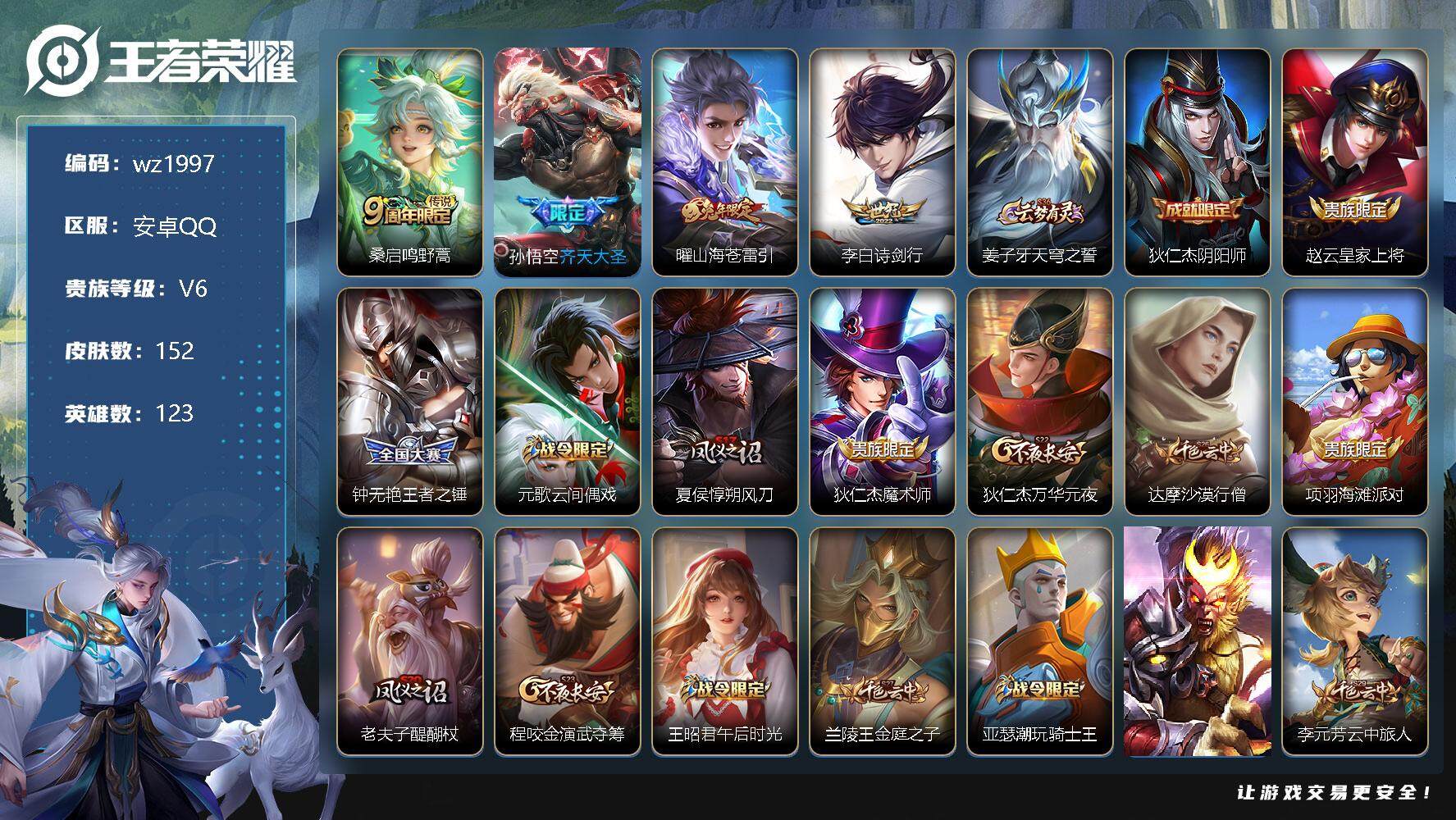 【账号佳】 【可二次实名】【wz1997】安卓Q-V6-永恒钻石III段位-123英雄-152皮肤-0典藏-0珍品无双-0无双-0珍品传说-4传说-38史诗 【英雄全皮】:影全皮 【传说皮肤】:桑启鸣野蒿,孙悟空齐天大圣,曜山海苍雷引,李白诗剑行 【限定皮肤】:姜子牙天穹之誓,狄仁杰阴阳师,赵云皇家上将,钟无艳王者之锤,元歌云间偶戏,夏侯惇朔风刀,狄仁杰魔术师,狄仁杰万华元夜,达摩沙漠行僧,项羽海滩派对,老夫子醍醐杖,程咬金演武夺筹,王昭君午后时光,兰陵王金庭之子,亚瑟潮玩骑士王,孙悟空齐天大圣,李元芳云中旅人,钟馗驱傩正仪,干将莫邪胡桃夹子,鬼谷子原初探秘者,鬼谷子五谷丰年,苏烈千军破阵,百里玄策原初追逐者,弈星混沌棋,梦奇顽趣,沈梦溪大漠名商,明世隐疑决卦,裴擒虎李小龙,裴擒虎擒涛扼浪,狂铁电玩高手,云中君纤云弄巧,上官婉儿梁祝,嫦娥暖冬兔眠,曜山海苍雷引,鲁班大师探海日志,桑启海盐诗旅,暃星界游侠,张良古海寻踪,鬼谷子天穹祈灯,姬小满妄想食味,刘邦剑破天穹,周瑜熔金海岸 【年限皮肤】:曜山海苍雷引 【赛季限定】:夏侯惇朔风刀,狄仁杰万华元夜,达摩沙漠行僧,老夫子醍醐杖,程咬金演武夺筹,兰陵王金庭之子,张良古海寻踪,李元芳云中旅人,钟馗驱傩正仪,鬼谷子原初探秘者,苏烈千军破阵,百里玄策原初追逐者,弈星混沌棋,梦奇顽趣,沈梦溪大漠名商,明世隐疑决卦,裴擒虎擒涛扼浪,鲁班大师探海日志,桑启海盐诗旅,鬼谷子天穹祈灯,刘邦剑破天穹,姜子牙天穹之誓 【战令限定】:元歌云间偶戏,王昭君午后时光,亚瑟潮玩骑士王,狂铁电玩高手,嫦娥暖冬兔眠,暃星界游侠 【史诗皮肤】:露娜紫霞仙子,钟无艳王者之锤,赵云皇家上将,赵云未来纪元,貂蝉圣诞恋歌,王昭君偶像歌手,狄仁杰魔术师,廉颇地狱岩魂,宫本武藏鬼剑武藏,孙尚香水果甜心,嬴政摇滚巨星,妲己魅力维加斯,妲己女仆咖啡,吕布圣诞狂欢,李白千年之狐,吕布末日机甲,韩信白龙吟,花木兰水晶猎龙者,刘邦德古拉伯爵,兰陵王暗隐猎兽者,亚瑟心灵战警,百里守约特工魅影,铠曙光守护者,李元芳逐浪之夏,上官婉儿梁祝,不知火舞魅语,百里玄策原初追逐者,裴擒虎李小龙,云中君纤云弄巧,元歌云间偶戏,澜赏金猎手,狂铁电玩高手,鬼谷子五谷丰年,梦奇顽趣,暃星界游侠,姬小满妄想食味,牛魔星界战将,后羿石田雨龙 【其他皮肤】:项羽海滩派对,韩信教廷特使,韩信街头霸王,露娜哥特玫瑰,达摩大发明家,赵云忍炎影,白起白色死神,牛魔西部大镖客,武则天东方不败,扁鹊化身博士,宫本武藏未来纪元,孙膑天使之翼,妲己少女阿狸,典韦黄金武士,亚瑟死亡骑士,达摩拳王,花木兰兔女郎,宫本武藏万象初新,后羿阿尔法小队,狄仁杰阴阳师,刘备纽约教父,刘备汉昭烈帝,关羽龙腾万里,钟无艳海滩丽影,王昭君幻想奇妙夜,老夫子功夫老勺,诸葛亮掌控之力,李白敏锐之力,鬼谷子幻乐之宴,苏烈坚韧之力,明世隐虹云星官,小乔丁香结,沈梦溪鲨炮海盗猫,夏侯惇朔风刀,弈星混沌棋,哪吒次元突破,鲁班七号黑桃队长,明世隐疑决卦,老夫子醍醐杖,鬼谷子原初探秘者,狄仁杰万华元夜,亚瑟潮玩骑士王,刘禅秘密基地,程咬金演武夺筹,钟馗驱傩正仪,鲁班大师乓乓大师,苏烈千军破阵,干将莫邪胡桃夹子,达摩沙漠行僧,程咬金无双福将,兰陵王金庭之子,刘禅唤灵魔甲,王昭君午后时光,沈梦溪大漠名商,蒙恬蔚蓝守将,李元芳云中旅人,桑启海盐诗旅,嫦娥暖冬兔眠,海月幻泉雾影,猪八戒潮玩探月行,裴擒虎擒涛扼浪,太乙真人劲辣红锅,鲁班大师探海日志,张良古海寻踪,亚连破局者,鬼谷子天穹祈灯,廉颇功夫炙烤,刘邦剑破天穹,姜子牙天穹之誓,周瑜熔金海岸,盘古敬我三分,干将莫邪雾都夜雨,苍苍林狼骑,太乙真人谧流熔炉,典韦铁骨偃魂,影魅影绮裳,西施雪境奇遇,姜子牙星梦巡礼,东皇太一金福满堂,戈娅玫蓝誓约,鲁班七号福禄兄弟,项羽帝国元帅,露娜绯红之刃,钟无艳生化警戒,王昭君精灵公主,狄仁杰锦衣卫,孙悟空西部大镖客,马可波罗激情绿茵,苍维京掠夺者,诸葛亮星航指挥官,黄忠芝加哥教父,干将莫邪第七人偶,鬼谷子阿摩司公爵,百里守约绝影神枪,公孙离花间舞,裴擒虎街头旋风,元歌午夜歌剧院,司马懿魇语军师,伽罗花见巫女,上官婉儿修竹墨客,盘古创世神祝,云中君荷鲁斯之眼,曜归虚梦演,镜冰刃幻境,阿古朵熊喵少女,澜孤猎,司空震启蛰,云缨赤焰之缨,金蝉前尘,桑启画中游 【内测皮肤】:干将莫邪胡桃夹子 【营地ID】:1806737671