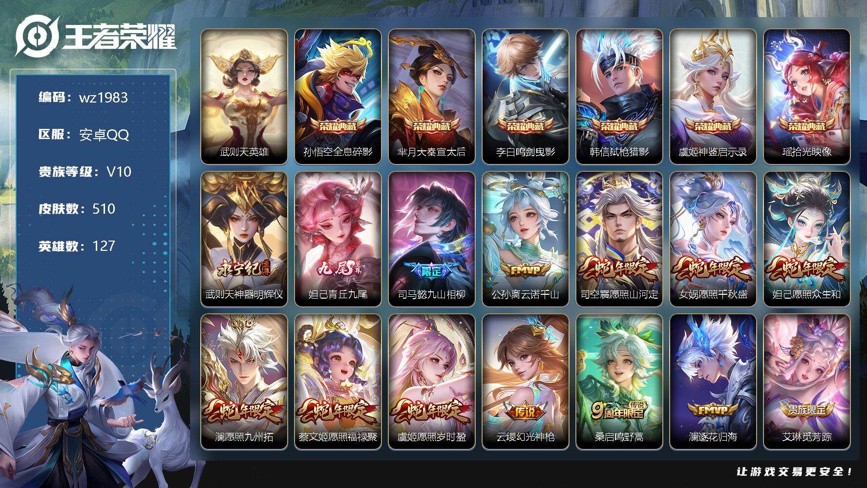 【账号佳】 【可二次实名】【wz1983】安卓Q-V10-永恒钻石I段位-127英雄-510皮肤-6典藏-0珍品无双-2无双-0珍品传说-64传说-165史诗 【英雄全皮】:妲己全皮,阿轲全皮,钟无艳全皮,芈月全皮,司马懿全皮,露娜全皮,钟馗全皮,女娲全皮,东皇太一全皮,鬼谷子全皮,苏烈全皮,狂铁全皮,李信全皮,猪八戒全皮,蒙恬全皮,司空震全皮,戈娅全皮,空空儿全皮,影全皮,少司缘全皮 【荣耀典藏】:武则天英雄,孙悟空全息碎影,芈月大秦宣太后,李白鸣剑曳影,韩信弑枪猎影,虞姬神鉴启示录,瑶拾光映像 【无双皮肤】:武则天神器明辉仪,妲己青丘九尾 【传说皮肤】:司马懿九山相柳,公孙离云诺千山,司空震愿照山河定,女娲愿照千秋盛,妲己愿照众生和,澜愿照九州拓,蔡文姬愿照福禄聚,虞姬愿照岁时盈,云缨幻光神枪,桑启鸣野蒿,澜逐花归海,艾琳觅芳踪,露娜霜月吟,马可波罗妄想实况,东皇太一灼幽烈阳,诸葛亮鹤羽星尊,澜电玩雷克斯,公孙离记忆之芯,夏洛特浮生妄,花木兰燃星之曲,孙悟空齐天大圣,小乔山海琳琅生,曜山海苍雷引,李信山海炽霜斩,吕布怒海麟威,李白诗剑行,狄仁杰神器狴犴令,不知火舞绯月行,王昭君星穹之声,百里守约碎云,马超无双飞将,大乔挚爱花嫁,孙策挚爱之约,露娜启示之音,女娲补天,裴擒虎寅虎赤拳,鲁班七号寅虎瑞焰,孙尚香异界灵契,王昭君乞巧织情,西施游龙清影,曜李逍遥 ,公孙离祈雪灵祝,诸葛亮时雨天司,镜炽阳神光,虞姬启明星使,曜云鹰飞将,李信一念神魔,伽罗太华,貂蝉猫影幻舞,张良黄金白羊座,干将莫邪久胜战神,虞姬云霓雀翎,百里玄策白虎志,花木兰冠军飞将,梦奇胖达荣荣,后羿黄金射手座,杨戬永曜之星,诸葛亮武陵仙君,貂蝉仲夏夜之梦,李白凤求凰,孙尚香末日机甲,宫本武藏地狱之眼,孙悟空地狱火,武则天海洋之心 【限定皮肤】:白起狰,暃埋骨钱,蒙犽顽岩魄,蔡文姬夏日便利店,虞姬夏日便利店,姜子牙天穹之誓,杨戬破阵退雄兵,李白谪仙醉月,狄仁杰阴阳师,虞姬凯尔特女王,廉颇寅虎御盾,小乔山海琳琅生,赵云皇家上将,赵云引擎之心,墨子神迹守卫,墨子降魔,妲己热情桑巴,妲己时之彼端,妲己时之奇旅,嬴政白昼王子,孙尚香异界灵契,鲁班七号狮舞东方,鲁班七号寅虎瑞焰,庄周玄嵩,庄周高山流水,高渐离玩趣恶龙,阿轲迷踪丽影,钟无艳王者之锤,钟无艳超时空战士,孙膑寅虎展翼,扁鹊奇幻香踪,白起夜都怪侠,芈月重明,芈月白晶晶,芈月幻夜卜梦,吕布猎兽之王,周瑜赤莲之焰,元歌云间偶戏,元歌无心,夏侯惇朔风刀,甄姬幽恒,甄姬游园惊梦,甄姬落雪兰心,曹操烛龙,曹操天狼征服者,典韦穷奇,典韦蓝屏警告,典韦岱宗,马可波罗逐梦之星,马可波罗暗影游猎,马可波罗山海玄木吟,马可波罗妄想实况,狄仁杰魔术师,狄仁杰万华元夜,狄仁杰神器狴犴令,达摩沙漠行僧,项羽海滩派对,老夫子醍醐杖,老夫子航海奇遇记,关羽冰锋战神,程咬金演武夺筹,露娜一生所爱,露娜启示之音,韩信飞衡,韩信傲雪梅枪,王昭君凤凰于飞,王昭君午后时光,王昭君星穹之声,兰陵王驯魔猎人,兰陵王金庭之子,花木兰青春决赛季,花木兰瑞麟志,花木兰默契交锋,花木兰燃星之曲,不知火舞绯月行,亚瑟潮玩骑士王,孙悟空美猴王,孙悟空至尊宝,孙悟空大圣娶亲,孙悟空孙行者,孙悟空齐天大圣,牛魔御旌,后羿辉光之辰,后羿如梦令,后羿圣弓游侠,李元芳银河之约,李元芳云中旅人,虞姬启明星使,钟馗神迹守卫,钟馗驱傩正仪,杨玉环遇见飞天,杨玉环寅虎心曲,杨戬永曜之星,杨戬潮玩骑兵,女娲朔望之晖,女娲补天,干将莫邪冰霜恋舞曲,干将莫邪真爱魔法,雅典娜黎明之约,蔡文姬繁星吟游,太乙真人饕餮,东皇太一逐梦之光,鬼谷子原初探秘者,鬼谷子五谷丰年,诸葛亮武陵仙君,诸葛亮时雨天司,诸葛亮鹤羽星尊,大乔挚爱花嫁,黄忠火炮绅士,铠青龙志,苏烈玄武志,苏烈千军破阵,百里玄策白虎志,百里玄策原初追逐者,百里守约朱雀志,弈星混沌棋,梦奇顽趣,公孙离蜜橘之夏,公孙离祈雪灵祝,沈梦溪星空之诺,沈梦溪大漠名商,明世隐疑决卦,明世隐吟游魔法,裴擒虎天狼狩猎者,裴擒虎李小龙,裴擒虎寅虎赤拳,裴擒虎擒涛扼浪,狂铁御狮,狂铁电玩高手,米莱狄御霄,瑶山海碧波行,云中君纤云弄巧,李信山海炽霜斩,伽罗太华,盾山御銮,孙策挚爱之约,猪八戒西部大镖客,猪八戒猪悟能,上官婉儿梁祝,上官婉儿神器万象笔,嫦娥如梦令,嫦娥拒霜思,嫦娥暖冬兔眠,曜李逍遥 ,曜山海苍雷引,西施玲珑珍味,鲁班大师探海日志,桑启海盐诗旅,夏洛特浮生妄,暃星界游侠,戈娅驭风魔法,艾琳流音漫舞,司空震地狱燃心,阿古朵江河有灵,张良古海寻踪,蒙犽百解令,艾琳觅芳踪,蒙恬荣光圣徽,高渐离燃音魔法,妲己灵卜魔法,鬼谷子天穹祈灯,伽罗琥珀纪元,姬小满妄想食味,沈梦溪龙舞盛年,鲁班七号蔬乡物语,李元芳蔬乡物语,刘邦剑破天穹,上官婉儿群星魔术团,程咬金群星魔术团,镜青焰无极,项羽苍威