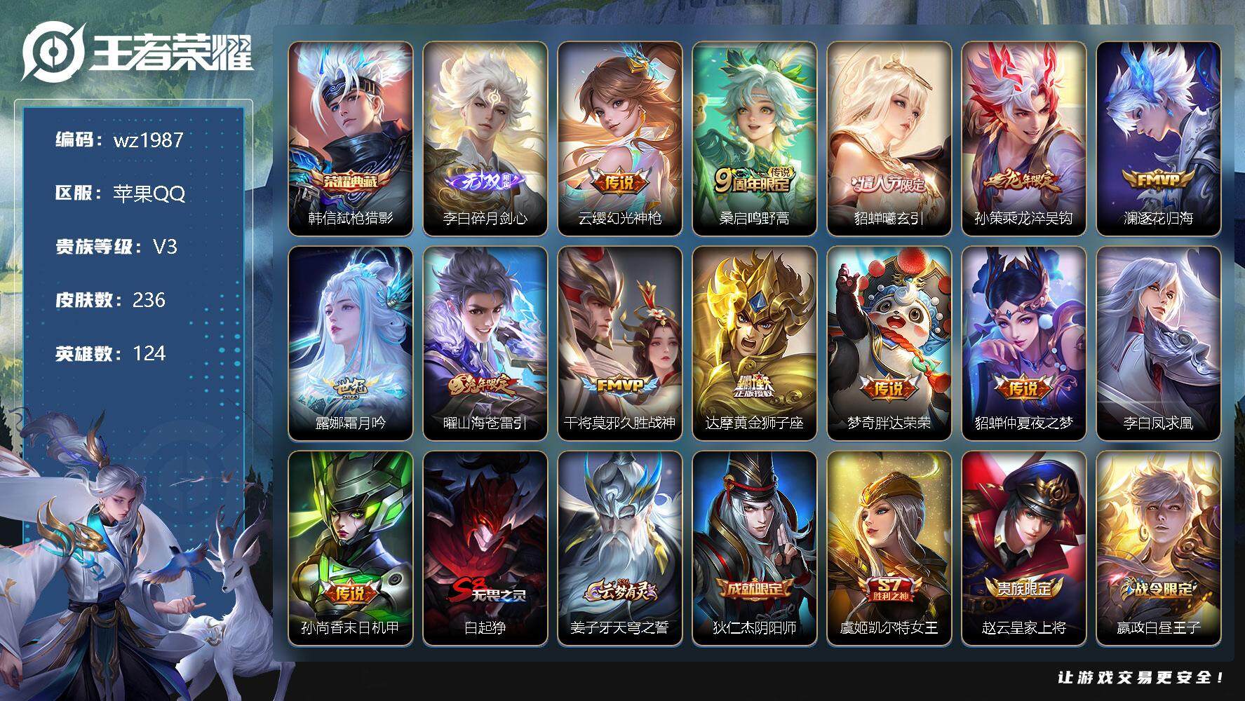 【账号佳】 【可二次实名】【wz1987】苹果Q-V3-至尊星耀V段位-124英雄-236皮肤-1典藏-0珍品无双-1无双-0珍品传说-13传说-57史诗 【英雄全皮】:蒙恬全皮 【荣耀典藏】:韩信弑枪猎影 【无双皮肤】:李白碎月剑心 【传说皮肤】:云缨幻光神枪,桑启鸣野蒿,貂蝉曦玄引,孙策乘龙淬吴钩,澜逐花归海,露娜霜月吟,曜山海苍雷引,干将莫邪久胜战神,达摩黄金狮子座,梦奇胖达荣荣,貂蝉仲夏夜之梦,李白凤求凰,孙尚香末日机甲 【限定皮肤】:白起狰,姜子牙天穹之誓,狄仁杰阴阳师,虞姬凯尔特女王,赵云皇家上将,嬴政白昼王子,高渐离死亡摇滚,高渐离玩趣恶龙,孙膑妖精王,扁鹊炼金王,芈月重明,芈月白晶晶,吕布猎兽之王,元歌云间偶戏,夏侯惇朔风刀,甄姬游园惊梦,曹操烛龙,典韦穷奇,狄仁杰魔术师,狄仁杰万华元夜,项羽海滩派对,老夫子醍醐杖,关羽冰锋战神,程咬金演武夺筹,露娜一生所爱,韩信飞衡,花木兰青春决赛季,亚瑟潮玩骑士王,孙悟空大圣娶亲,牛魔御旌,后羿辉光之辰,李元芳云中旅人,钟馗驱傩正仪,杨玉环遇见飞天,雅典娜黎明之约,太乙真人饕餮,太乙真人华丽摇滚,鬼谷子原初探秘者,鬼谷子五谷丰年,百里玄策原初追逐者,弈星混沌棋,梦奇顽趣,明世隐疑决卦,裴擒虎李小龙,裴擒虎擒涛扼浪,狂铁御狮,米莱狄御霄,云中君纤云弄巧,盾山御銮,上官婉儿天狼绘梦者,曜山海苍雷引,鲁班大师探海日志,桑启海盐诗旅,艾琳女武神,艾琳流音漫舞,司空震地狱燃心,张良古海寻踪,蒙犽百解令,蒙恬荣光圣徽,鬼谷子天穹祈灯,李白碎月剑心,伽罗琥珀纪元,孙策乘龙淬吴钩,貂蝉曦玄引,刘邦剑破天穹,周瑜熔金海岸 【年限皮肤】:李白凤求凰,后羿辉光之辰,韩信飞衡,曜山海苍雷引,孙策乘龙淬吴钩 【赛季限定】:孙膑妖精王,扁鹊炼金王,白起狰,芈月重明,夏侯惇朔风刀,曹操烛龙,典韦穷奇,狄仁杰万华元夜,老夫子醍醐杖,程咬金演武夺筹,张良古海寻踪,牛魔御旌,李元芳云中旅人,虞姬凯尔特女王,钟馗驱傩正仪,雅典娜黎明之约,太乙真人饕餮,鬼谷子原初探秘者,百里玄策原初追逐者,弈星混沌棋,梦奇顽趣,明世隐疑决卦,裴擒虎擒涛扼浪,狂铁御狮,米莱狄御霄,盾山御銮,鲁班大师探海日志,桑启海盐诗旅,鬼谷子天穹祈灯,蒙恬荣光圣徽,刘邦剑破天穹,姜子牙天穹之誓 【战令限定】:嬴政白昼王子,吕布猎兽之王,元歌云间偶戏,艾琳流音漫舞,亚瑟潮玩骑士王,司空震地狱燃心 【史诗皮肤】:赵云皇家上将,赵云未来纪元,甄姬冰雪圆舞曲,狄仁杰魔术师,廉颇地狱岩魂,宫本武藏鬼剑武藏,孙尚香水果甜心,嬴政暗夜贵公子,嬴政摇滚巨星,妲己女仆咖啡,吕布圣诞狂欢,曹操幽灵船长,李白千年之狐,张飞乱世虎臣,关羽冰锋战神,花木兰水晶猎龙者,刘邦德古拉伯爵,夏侯惇乘风破浪,小乔缤纷独角兽,兰陵王暗隐猎兽者,甄姬游园惊梦,安琪拉心灵骇客,后羿辉光之辰,花木兰青春决赛季,百里守约特工魅影,铠曙光守护者,刘禅天才门将,程咬金功夫厨神,白起星夜王子,杨玉环遇见飞天,嬴政白昼王子,孙策猫狗日记,露娜一生所爱,孙悟空大圣娶亲,狄仁杰鹰眼统帅,娜可露露晚萤,韩信飞衡,不知火舞魅语,橘右京修罗,上官婉儿天狼绘梦者,百里玄策原初追逐者,裴擒虎李小龙,云中君纤云弄巧,元歌云间偶戏,芈月白晶晶,雅典娜黎明之约,鬼谷子五谷丰年,梦奇顽趣,司空震地狱燃心,蒙犽百解令,蒙恬荣光圣徽,伽罗琥珀纪元,牛魔星界战将,阿轲化蝶舞,后羿石田雨龙,黄忠百相守梦,公孙离涂山容容 【其他皮肤】:项羽海滩派对,韩信教廷特使,韩信街头霸王,露娜哥特玫瑰,阿轲致命风华,阿轲爱心护理,达摩大发明家,赵云忍炎影,艾琳女武神,程咬金星际陆战队,白起白色死神,牛魔西部大镖客,扁鹊化身博士,孙膑天使之翼,姜子牙时尚教父,妲己少女阿狸,典韦黄金武士,亚瑟死亡骑士,达摩拳王,花木兰兔女郎,张飞五福同心,甄姬花好人间,刘备万事如意,宫本武藏万象初新,狄仁杰阴阳师,刘备纽约教父,高渐离死亡摇滚,孙膑妖精王,刘备汉昭烈帝,扁鹊炼金王,关羽龙腾万里,虞姬凯尔特女王,墨子进击墨子号,白起狰,钟无艳海滩丽影,太乙真人饕餮,宫本武藏霸王丸,曹操烛龙,芈月重明,狂铁命运角斗场,老夫子功夫老勺,孙尚香沉稳之力,典韦穷奇,诸葛亮掌控之力,鬼谷子幻乐之宴,狂铁御狮,太乙真人华丽摇滚,苏烈坚韧之力,大乔守护之力,项羽科学大爆炸,米莱狄御霄,吕布猎兽之王,明世隐虹云星官,庄周奇妙博物学,牛魔御旌,小乔丁香结,吕布野性能量,盾山御銮,孙膑归虚梦演,高渐离玩趣恶龙,沈梦溪鲨炮海盗猫,夏侯惇朔风刀,弈星混沌棋,哪吒次元突破,明世隐疑决卦,盾山圆桌骑士,老夫子醍醐杖,狂铁特工战影,鬼谷子原初探秘者,狄仁杰万华元夜,亚瑟潮玩骑士王,刘禅秘密基地,杨戬次元傲视,露娜瓷语鉴心,程咬金演武夺筹,张良缤纷绘卷,盘古重装意志,钟馗驱傩正仪,鲁班大师乓乓大师,程咬金无双福将,