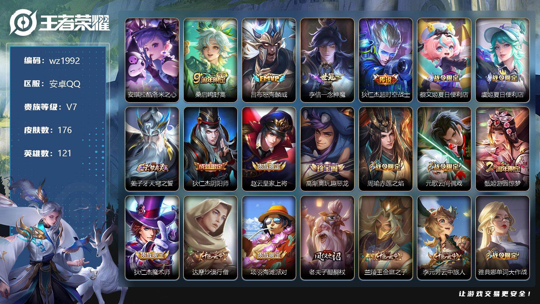 【账号佳】 【可二次实名】【wz1992】安卓Q-V7-至尊星耀V段位-121英雄-176皮肤-0典藏-0珍品无双-0无双-1珍品传说-4传说-49史诗 【英雄全皮】:影全皮 【珍品传说】:安琪拉酷洛米之心 【传说皮肤】:桑启鸣野蒿,吕布怒海麟威,李信一念神魔,狄仁杰超时空战士 【限定皮肤】:蔡文姬夏日便利店,虞姬夏日便利店,姜子牙天穹之誓,狄仁杰阴阳师,赵云皇家上将,高渐离玩趣恶龙,周瑜赤莲之焰,元歌云间偶戏,甄姬游园惊梦,狄仁杰魔术师,达摩沙漠行僧,项羽海滩派对,老夫子醍醐杖,兰陵王金庭之子,李元芳云中旅人,雅典娜单词大作战,鬼谷子原初探秘者,百里玄策原初追逐者,沈梦溪大漠名商,裴擒虎李小龙,鲁班大师探海日志,桑启海盐诗旅,艾琳流音漫舞,司空震地狱燃心,阿古朵江河有灵,张良古海寻踪,高渐离燃音魔法,妲己灵卜魔法,鬼谷子天穹祈灯,安琪拉乘龙聚宝船,沈梦溪龙舞盛年,刘邦剑破天穹,程咬金群星魔术团,周瑜熔金海岸 【年限皮肤】:安琪拉乘龙聚宝船 【赛季限定】:达摩沙漠行僧,老夫子醍醐杖,兰陵王金庭之子,张良古海寻踪,李元芳云中旅人,鬼谷子原初探秘者,百里玄策原初追逐者,沈梦溪大漠名商,鲁班大师探海日志,桑启海盐诗旅,鬼谷子天穹祈灯,刘邦剑破天穹,姜子牙天穹之誓 【战令限定】:蔡文姬夏日便利店,虞姬夏日便利店,周瑜赤莲之焰,元歌云间偶戏,艾琳流音漫舞,雅典娜单词大作战,司空震地狱燃心,高渐离燃音魔法,妲己灵卜魔法 【史诗皮肤】:项羽苍穹之光,赵云皇家上将,赵云未来纪元,貂蝉圣诞恋歌,甄姬冰雪圆舞曲,狄仁杰魔术师,宫本武藏鬼剑武藏,孙尚香水果甜心,妲己魅力维加斯,妲己女仆咖啡,墨子金属风暴,吕布圣诞狂欢,刘禅绅士熊喵,曹操幽灵船长,李白千年之狐,韩信白龙吟,花木兰水晶猎龙者,夏侯惇乘风破浪,小乔缤纷独角兽,兰陵王暗隐猎兽者,甄姬游园惊梦,亚瑟心灵战警,雅典娜冰冠公主,安琪拉心灵骇客,百里守约特工魅影,铠曙光守护者,蔡文姬舞动绿茵,刘禅天才门将,李元芳逐浪之夏,阿轲节奏热浪,孙策猫狗日记,狄仁杰鹰眼统帅,百里玄策原初追逐者,裴擒虎李小龙,元歌云间偶戏,钟馗乐园奇幻夜,司空震地狱燃心,阿古朵江河有灵,妲己灵卜魔法,高渐离燃音魔法,安琪拉乘龙聚宝船,蔡文姬夏日便利店,姬小满战舞者,亚连破空之剑,马可波罗星界特工,牛魔星界战将,刘禅鸭鸭历险记,周瑜百相守梦,黄忠百相守梦,公孙离涂山容容 【其他皮肤】:项羽海滩派对,韩信教廷特使,韩信街头霸王,阿轲爱心护理,达摩大发明家,赵云白执事,赵云忍炎影,芈月红桃皇后,白起白色死神,扁鹊化身博士,宫本武藏未来纪元,姜子牙时尚教父,妲己少女阿狸,典韦黄金武士,亚瑟死亡骑士,花木兰兔女郎,张飞五福同心,刘备万事如意,狄仁杰阴阳师,刘备纽约教父,孙尚香沉稳之力,诸葛亮掌控之力,李白敏锐之力,大乔守护之力,项羽科学大爆炸,明世隐虹云星官,小乔丁香结,孙膑归虚梦演,高渐离玩趣恶龙,沈梦溪鲨炮海盗猫,周瑜赤莲之焰,盾山圆桌骑士,老夫子醍醐杖,鬼谷子原初探秘者,雅典娜单词大作战,刘禅秘密基地,露娜瓷语鉴心,马可波罗潮玩牛仔,达摩沙漠行僧,程咬金无双福将,兰陵王金庭之子,刘禅唤灵魔甲,沈梦溪大漠名商,李元芳云中旅人,刘备潮玩造梦师,桑启海盐诗旅,猪八戒潮玩探月行,白起乐园追猎者,鲁班大师探海日志,李元芳妄想特派,艾琳流音漫舞,张良古海寻踪,钟无艳聚星闪耀,后羿完美运算,鬼谷子天穹祈灯,妲己灵卜魔法,嫦娥漠中幻影,朵莉亚金色潮汐,廉颇功夫炙烤,沈梦溪龙舞盛年,钟无艳春野之旅,刘邦剑破天穹,程咬金群星魔术团,大司命暗都幽影,貂蝉长夏之忆,姜子牙天穹之誓,周瑜熔金海岸,虞姬夏日便利店,孙悟空神迹守卫,盘古敬我三分,东皇太一噬灭天穹,干将莫邪雾都夜雨,吕布逐霄战戟,苍苍林狼骑,太乙真人谧流熔炉,典韦铁骨偃魂,影魅影绮裳,西施雪境奇遇,东皇太一金福满堂,达摩爆裂喵拳,少司缘灵卦秘语,明世隐景韶洛都,戈娅玫蓝誓约,刘备浪漫序章,钟馗虚灵犬护,沈梦溪鸭鸭历险记,苏烈春野闲踪,张良灵野札记,阿古朵布丁狗之约,露娜命运加冕,雅典娜潮玩士官长,姬小满小满鸭,白起死霸装,甄姬逆浪荇歌,孙策百相守梦,庄周锦麟游梦,莱西奥踏浪烽翎,哪吒罗小黑战记,鲁班七号福禄兄弟,鲁班七号木偶奇遇记,老夫子潮流仙人,王昭君精灵公主,小乔万圣前夜,孙悟空西部大镖客,虞姬加勒比小姐,关羽天启骑士,蔡文姬蔷薇王座,夏侯惇战争骑士,马可波罗激情绿茵,黄忠芝加哥教父,百里守约绝影神枪,裴擒虎街头旋风,伽罗花见巫女,沈梦溪棒球奇才,李信灼热之刃,曜归虚梦演,马超幸存者,西施归虚梦演,阿古朵熊喵少女,澜孤猎,云缨赤焰之缨,金蝉前尘 【内测皮肤】:高渐离玩趣恶龙 【营地ID】:1754195128