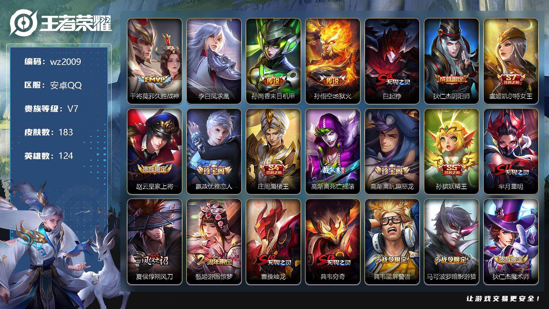 【账号佳】 【可二次实名】【wz2009】安卓Q-V7-永恒钻石I段位-124英雄-183皮肤-0典藏-0珍品无双-0无双-0珍品传说-4传说-38史诗 【传说皮肤】:干将莫邪久胜战神,李白凤求凰,孙尚香末日机甲,孙悟空地狱火 【限定皮肤】:白起狰,狄仁杰阴阳师,虞姬凯尔特女王,赵云皇家上将,嬴政优雅恋人,庄周蜃楼王,高渐离死亡摇滚,高渐离玩趣恶龙,孙膑妖精王,芈月重明,夏侯惇朔风刀,甄姬游园惊梦,曹操烛龙,典韦穷奇,典韦蓝屏警告,马可波罗暗影游猎,狄仁杰魔术师,狄仁杰万华元夜,达摩沙漠行僧,项羽海滩派对,老夫子醍醐杖,貂蝉逐梦之音,程咬金演武夺筹,韩信飞衡,兰陵王金庭之子,亚瑟狮心王,孙悟空美猴王,牛魔御旌,后羿如梦令,李元芳云中旅人,钟馗驱傩正仪,杨玉环遇见飞天,女娲朔望之晖,雅典娜黎明之约,蔡文姬繁星吟游,太乙真人饕餮,鬼谷子原初探秘者,苏烈千军破阵,百里玄策原初追逐者,弈星混沌棋,梦奇顽趣,沈梦溪大漠名商,明世隐疑决卦,裴擒虎李小龙,裴擒虎擒涛扼浪,狂铁御狮,米莱狄御霄,盾山御銮,猪八戒西部大镖客,上官婉儿梁祝,嫦娥拒霜思,鲁班大师探海日志,桑启海盐诗旅,鬼谷子天穹祈灯 【年限皮肤】:孙悟空美猴王,李白凤求凰,韩信飞衡 【赛季限定】:庄周蜃楼王,孙膑妖精王,白起狰,芈月重明,夏侯惇朔风刀,曹操烛龙,典韦穷奇,狄仁杰万华元夜,达摩沙漠行僧,老夫子醍醐杖,程咬金演武夺筹,兰陵王金庭之子,亚瑟狮心王,牛魔御旌,李元芳云中旅人,虞姬凯尔特女王,钟馗驱傩正仪,雅典娜黎明之约,太乙真人饕餮,鬼谷子原初探秘者,苏烈千军破阵,百里玄策原初追逐者,弈星混沌棋,梦奇顽趣,沈梦溪大漠名商,明世隐疑决卦,裴擒虎擒涛扼浪,狂铁御狮,米莱狄御霄,盾山御銮,鲁班大师探海日志,桑启海盐诗旅,鬼谷子天穹祈灯 【战令限定】:典韦蓝屏警告,马可波罗暗影游猎,女娲朔望之晖,猪八戒西部大镖客 【史诗皮肤】:露娜紫霞仙子,赵云皇家上将,甄姬冰雪圆舞曲,狄仁杰魔术师,宫本武藏鬼剑武藏,孙尚香水果甜心,嬴政优雅恋人,嬴政摇滚巨星,妲己魅力维加斯,墨子金属风暴,曹操幽灵船长,李白千年之狐,张飞乱世虎臣,貂蝉逐梦之音,花木兰水晶猎龙者,兰陵王暗隐猎兽者,甄姬游园惊梦,雅典娜冰冠公主,百里守约特工魅影,铠曙光守护者,李元芳逐浪之夏,杨玉环遇见飞天,孙策猫狗日记,典韦蓝屏警告,狄仁杰鹰眼统帅,公孙离无限星赏官,上官婉儿梁祝,蔡文姬繁星吟游,韩信飞衡,后羿如梦令,橘右京修罗,马可波罗暗影游猎,百里玄策原初追逐者,裴擒虎李小龙,嫦娥拒霜思,雅典娜黎明之约,梦奇顽趣,阿轲化蝶舞 【其他皮肤】:项羽海滩派对,韩信教廷特使,韩信街头霸王,露娜哥特玫瑰,阿轲致命风华,阿轲爱心护理,达摩大发明家,赵云白执事,赵云忍炎影,芈月红桃皇后,白起白色死神,扁鹊化身博士,妲己少女阿狸,亚瑟死亡骑士,孙悟空美猴王,花木兰兔女郎,张飞五福同心,刘备万事如意,宫本武藏万象初新,亚瑟狮心王,后羿阿尔法小队,狄仁杰阴阳师,庄周蜃楼王,刘备纽约教父,高渐离死亡摇滚,孙膑妖精王,刘备汉昭烈帝,关羽龙腾万里,虞姬凯尔特女王,墨子进击墨子号,白起狰,钟无艳海滩丽影,太乙真人饕餮,宫本武藏霸王丸,曹操烛龙,王昭君幻想奇妙夜,芈月重明,老夫子功夫老勺,典韦穷奇,诸葛亮掌控之力,李白敏锐之力,鬼谷子幻乐之宴,狂铁御狮,安琪拉如懿,苏烈坚韧之力,大乔守护之力,项羽科学大爆炸,米莱狄御霄,明世隐虹云星官,张良幽兰居士,牛魔御旌,女娲朔望之晖,小乔丁香结,吕布野性能量,盾山御銮,孙膑归虚梦演,高渐离玩趣恶龙,沈梦溪鲨炮海盗猫,姜子牙炽热元素使,夏侯惇朔风刀,弈星混沌棋,哪吒次元突破,鲁班七号黑桃队长,明世隐疑决卦,盾山圆桌骑士,老夫子醍醐杖,猪八戒西部大镖客,狂铁特工战影,鬼谷子原初探秘者,狄仁杰万华元夜,刘禅秘密基地,程咬金演武夺筹,张良缤纷绘卷,钟馗驱傩正仪,鲁班大师乓乓大师,苏烈千军破阵,达摩沙漠行僧,程咬金无双福将,兰陵王金庭之子,沈梦溪大漠名商,李元芳云中旅人,桑启海盐诗旅,猪八戒潮玩探月行,裴擒虎擒涛扼浪,鲁班大师探海日志,鬼谷子天穹祈灯,廉颇功夫炙烤,戈娅玫蓝誓约,莱西奥踏浪烽翎,鲁班七号福禄兄弟,鲁班七号木偶奇遇记,高渐离金属狂潮,项羽帝国元帅,露娜绯红之刃,貂蝉异域舞娘,花木兰剑舞者,老夫子潮流仙人,曹操超能战警,小乔万圣前夜,孙膑未来旅行,孙悟空西部大镖客,周瑜海军大将,后羿精灵王,李白范海辛,钟馗地府判官,李元芳特种部队,虞姬加勒比小姐,关羽天启骑士,蔡文姬蔷薇王座,马可波罗激情绿茵,苍维京掠夺者,杨戬埃及法老,哪吒三太子,黄忠芝加哥教父,大乔伊势巫女,东皇太一东海龙王,鬼谷子阿摩司公爵,铠龙域领主,百里守约绝影神枪,苏烈爱与和平,公孙离花间舞,裴擒虎街头旋风,元歌午夜歌剧院,孙策海之征途,司马懿魇语军师,伽罗花见巫女,沈梦溪