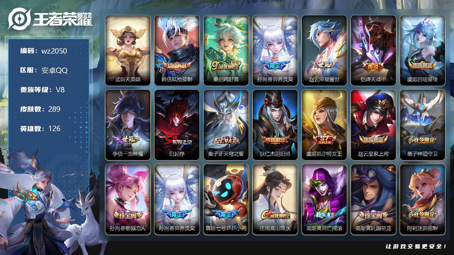 【账号佳】 【可二次实名】【wz2050】安卓Q-V8-至尊星耀IV段位-126英雄-289皮肤-1典藏-0珍品无双-0无双-0珍品传说-6传说-80史诗 【英雄全皮】:猪八戒全皮 【荣耀典藏】:武则天英雄,韩信弑枪猎影 【传说皮肤】:桑启鸣野蒿,孙尚香异界灵契,赵云淬星耀世,铠绛天战甲,虞姬启明星使,李信一念神魔 【限定皮肤】:白起狰,姜子牙天穹之誓,狄仁杰阴阳师,虞姬凯尔特女王,赵云皇家上将,墨子神迹守卫,孙尚香蔷薇恋人,孙尚香异界灵契,鲁班七号乒乒小将,庄周高山流水,高渐离死亡摇滚,高渐离玩趣恶龙,阿轲迷踪丽影,扁鹊炼金王,芈月重明,吕布猎兽之王,吕布御风骁将,周瑜赤莲之焰,元歌云间偶戏,夏侯惇朔风刀,曹操烛龙,马可波罗暗影游猎,狄仁杰魔术师,狄仁杰万华元夜,达摩星际陆战队,达摩沙漠行僧,项羽海滩派对,项羽霸王别姬,老夫子醍醐杖,老夫子航海奇遇记,程咬金演武夺筹,刘邦夺宝奇兵,韩信飞衡,兰陵王驯魔猎人,兰陵王金庭之子,花木兰默契交锋,亚瑟潮玩骑士王,孙悟空孙行者,后羿辉光之辰,后羿如梦令,后羿圣弓游侠,李元芳银河之约,李元芳云中旅人,虞姬启明星使,钟馗神迹守卫,钟馗驱傩正仪,干将莫邪真爱魔法,雅典娜单词大作战,蔡文姬繁星吟游,鬼谷子原初探秘者,鬼谷子五谷丰年,黄忠烈魂,铠青龙志,苏烈千军破阵,弈星混沌棋,沈梦溪星空之诺,沈梦溪大漠名商,明世隐疑决卦,裴擒虎李小龙,裴擒虎擒涛扼浪,米莱狄御霄,米莱狄胡桃异想国,云中君纤云弄巧,伽罗天狼溯光者,盾山御銮,猪八戒西部大镖客,猪八戒猪悟能,上官婉儿梁祝,上官婉儿天狼绘梦者,嫦娥如梦令,嫦娥拒霜思,蒙犽狂想玩偶喵,鲁班大师探海日志,艾琳女武神,阿古朵江河有灵,张良古海寻踪,鬼谷子天穹祈灯,刘邦剑破天穹 【年限皮肤】:铠青龙志,后羿辉光之辰,吕布御风骁将,韩信飞衡,马超神威,黄忠烈魂 【赛季限定】:扁鹊炼金王,白起狰,芈月重明,夏侯惇朔风刀,曹操烛龙,狄仁杰万华元夜,达摩沙漠行僧,老夫子醍醐杖,程咬金演武夺筹,兰陵王金庭之子,张良古海寻踪,李元芳云中旅人,虞姬凯尔特女王,钟馗驱傩正仪,鬼谷子原初探秘者,苏烈千军破阵,弈星混沌棋,沈梦溪大漠名商,明世隐疑决卦,裴擒虎擒涛扼浪,米莱狄御霄,盾山御銮,鲁班大师探海日志,鬼谷子天穹祈灯,刘邦剑破天穹,姜子牙天穹之誓 【战令限定】:墨子神迹守卫,阿轲迷踪丽影,吕布猎兽之王,周瑜赤莲之焰,元歌云间偶戏,马可波罗暗影游猎,达摩星际陆战队,老夫子航海奇遇记,刘邦夺宝奇兵,兰陵王驯魔猎人,亚瑟潮玩骑士王,后羿圣弓游侠,李元芳银河之约,钟馗神迹守卫,干将莫邪真爱魔法,雅典娜单词大作战,沈梦溪星空之诺,米莱狄胡桃异想国,猪八戒西部大镖客,蒙犽狂想玩偶喵 【史诗皮肤】:项羽职棒王牌,项羽苍穹之光,阿轲暗夜猫娘,赵云皇家上将,赵云未来纪元,貂蝉圣诞恋歌,甄姬冰雪圆舞曲,狄仁杰魔术师,廉颇地狱岩魂,宫本武藏鬼剑武藏,孙尚香蔷薇恋人,孙尚香水果甜心,嬴政暗夜贵公子,妲己魅力维加斯,妲己女仆咖啡,墨子龙骑士,墨子金属风暴,吕布圣诞狂欢,刘禅绅士熊喵,曹操幽灵船长,李白千年之狐,吕布末日机甲,张飞乱世虎臣,项羽霸王别姬,花木兰水晶猎龙者,刘邦德古拉伯爵,夏侯惇乘风破浪,兰陵王暗隐猎兽者,诸葛亮黄金分割率,亚瑟心灵战警,雅典娜冰冠公主,安琪拉心灵骇客,后羿辉光之辰,百里守约特工魅影,铠曙光守护者,蔡文姬舞动绿茵,刘禅天才门将,李元芳逐浪之夏,程咬金功夫厨神,白起星夜王子,大乔猫狗日记,铠青龙志,伽罗箭羽风息,狄仁杰鹰眼统帅,兰陵王驯魔猎人,上官婉儿梁祝,蔡文姬繁星吟游,李元芳银河之约,韩信飞衡,嫦娥如梦令,后羿如梦令,阿轲迷踪丽影,橘右京修罗,马超神威,黄忠烈魂,上官婉儿天狼绘梦者,马可波罗暗影游猎,蒙犽狂想玩偶喵,裴擒虎李小龙,云中君纤云弄巧,元歌云间偶戏,吕布御风骁将,花木兰默契交锋,米莱狄胡桃异想国,老夫子航海奇遇记,伽罗天狼溯光者,鲁班七号乒乒小将,杨戬天秀启明,干将莫邪真爱魔法,安琪拉时之奇旅,孙悟空孙行者,猪八戒猪悟能,庄周高山流水,嫦娥拒霜思,鬼谷子五谷丰年,阿古朵江河有灵,狂铁龙之律动,后羿石田雨龙,黄忠百相守梦,公孙离涂山容容 【其他皮肤】:项羽海滩派对,韩信教廷特使,韩信街头霸王,露娜哥特玫瑰,阿轲致命风华,达摩大发明家,赵云忍炎影,芈月红桃皇后,艾琳女武神,程咬金星际陆战队,白起白色死神,牛魔西部大镖客,武则天东方不败,扁鹊化身博士,扁鹊救世之瞳,宫本武藏未来纪元,安琪拉玩偶对对碰,孙膑天使之翼,姜子牙时尚教父,妲己少女阿狸,典韦黄金武士,亚瑟死亡骑士,达摩拳王,花木兰兔女郎,张飞五福同心,甄姬花好人间,刘备万事如意,宫本武藏万象初新,狄仁杰阴阳师,刘备纽约教父,高渐离死亡摇滚,刘备汉昭烈帝,扁鹊炼金王,关羽龙腾万里,虞姬凯尔特女王,墨子进击墨子号,白起狰,钟无艳海滩丽