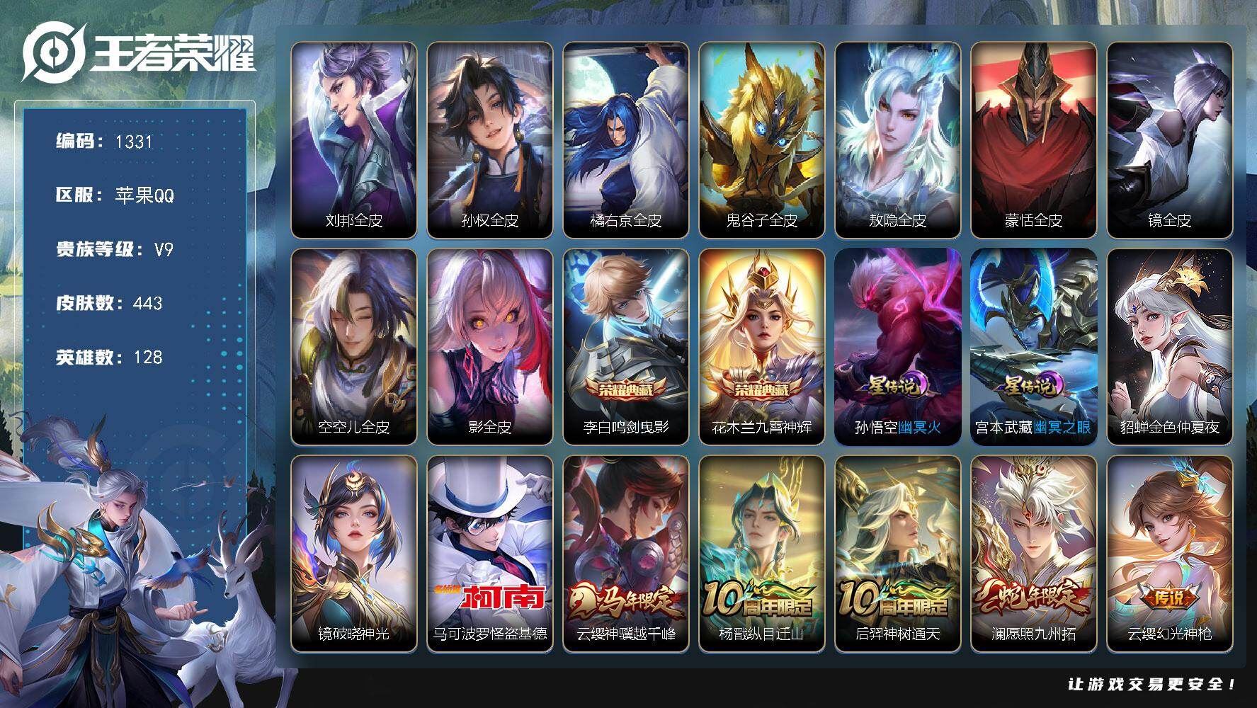 【账号佳】 【可二次实名】可二次苹果Q【营地:487376149】-V9-最强王者段位-128英雄-443皮肤-2典藏皮肤-1珍品传说-23传说-144史诗【英雄全皮】:刘邦全皮,孙权全皮,橘右京全皮,鬼谷子全皮,敖隐全皮,蒙恬全皮,镜全皮,空空儿全皮,影全皮【荣耀典藏】:李白鸣剑曳影,花木兰九霄神辉【珍品传说】:马可波罗怪盗基德【传说皮肤】:云缨神骥越千峰,杨戬纵目迁山,后羿神树通天,澜愿照九州拓,云缨幻光神枪,桑启鸣野蒿,马超琥珀纪元,澜逐花归海,孙悟空齐天大圣,曜山海苍雷引,橘右京枫霜尽,马超无双飞将,裴擒虎寅虎赤拳,孙尚香异界灵契,镜炽阳神光,虞姬启明星使,张良黄金白羊座,干将莫邪久胜战神,达摩黄金狮子座,百里玄策白虎志,貂蝉仲夏夜之梦,宫本武藏地狱之眼,孙悟空地狱火【限定皮肤】:蒙犽顽岩魄,蔡文姬夏日便利店,大乔绒语心约,虞姬夏日便利店,姜子牙天穹之誓,杨戬破阵退雄兵,狄仁杰阴阳师,赵云皇家上将,赵云引擎之心,赵云百木心枪,墨子神迹守卫,孙尚香异界灵契,庄周高山流水,高渐离玩趣恶龙,阿轲迷踪丽影,钟无艳王者之锤,钟无艳超时空战士,扁鹊奇幻香踪,白起夜都怪侠,芈月重明,芈月白晶晶,芈月幻夜卜梦,元歌云间偶戏,元歌无心,夏侯惇朔风刀,甄姬游园惊梦,甄姬落雪兰心,曹操烛龙,典韦穷奇,典韦蓝屏警告,典韦岱宗,马可波罗暗影游猎,狄仁杰魔术师,狄仁杰万华元夜,达摩星际陆战队,达摩沙漠行僧,项羽海滩派对,老夫子醍醐杖,老夫子航海奇遇记,关羽冰锋战神,程咬金演武夺筹,露娜一生所爱,刘邦夺宝奇兵,韩信逐梦之影,韩信飞衡,韩信傲雪梅枪,王昭君凤凰于飞,兰陵王金庭之子,花木兰青春决赛季,橘右京枫霜尽,孙悟空美猴王,孙悟空至尊宝,孙悟空大圣娶亲,孙悟空孙行者,孙悟空齐天大圣,后羿如梦令,后羿圣弓游侠,李元芳云中旅人,虞姬启明星使,钟馗驱傩正仪,杨玉环遇见飞天,杨戬潮玩骑兵,干将莫邪真爱魔法,雅典娜单词大作战,雅典娜黎明之约,蔡文姬繁星吟游,太乙真人华丽摇滚,鬼谷子原初探秘者,鬼谷子五谷丰年,黄忠火炮绅士,苏烈千军破阵,百里玄策白虎志,百里玄策原初追逐者,百里守约朱雀志,弈星混沌棋,梦奇顽趣,公孙离玉兔公主,沈梦溪大漠名商,明世隐疑决卦,明世隐吟游魔法,裴擒虎李小龙,裴擒虎寅虎赤拳,裴擒虎擒涛扼浪,狂铁御狮,米莱狄御霄,米莱狄胡桃异想国,云中君纤云弄巧,盾山御銮,猪八戒西部大镖客,上官婉儿梁祝,上官婉儿神器万象笔,嫦娥拒霜思,嫦娥暖冬兔眠,曜山海苍雷引,蒙犽狂想玩偶喵,鲁班大师探海日志,镜匿光追影者,桑启海盐诗旅,暃星界游侠,艾琳女武神,艾琳流音漫舞,司空震地狱燃心,阿古朵江河有灵,张良古海寻踪,蒙犽百解令,蒙恬荣光圣徽,高渐离燃音魔法,妲己灵卜魔法,鬼谷子天穹祈灯,伽罗琥珀纪元,马超琥珀纪元,姬小满妄想食味,沈梦溪龙舞盛年,鲁班七号蔬乡物语,李元芳蔬乡物语,刘邦剑破天穹,上官婉儿群星魔术团,程咬金群星魔术团,镜青焰无极,项羽苍威无极,刘备异域游侠,周瑜熔金海岸【年限皮肤】:孙悟空美猴王,王昭君凤凰于飞,百里玄策白虎志,百里守约朱雀志,典韦岱宗,韩信飞衡,裴擒虎寅虎赤拳,曜山海苍雷引,澜愿照九州拓,各种道具详情看截图、低价出售找回包 赔、截图展示段位不代 表实际段位,如赛季更新等不可抗拒因素发生变化、时限道具不保证所剩时间、标题未写送点劵默认不送【卖号买号首选亿梦】