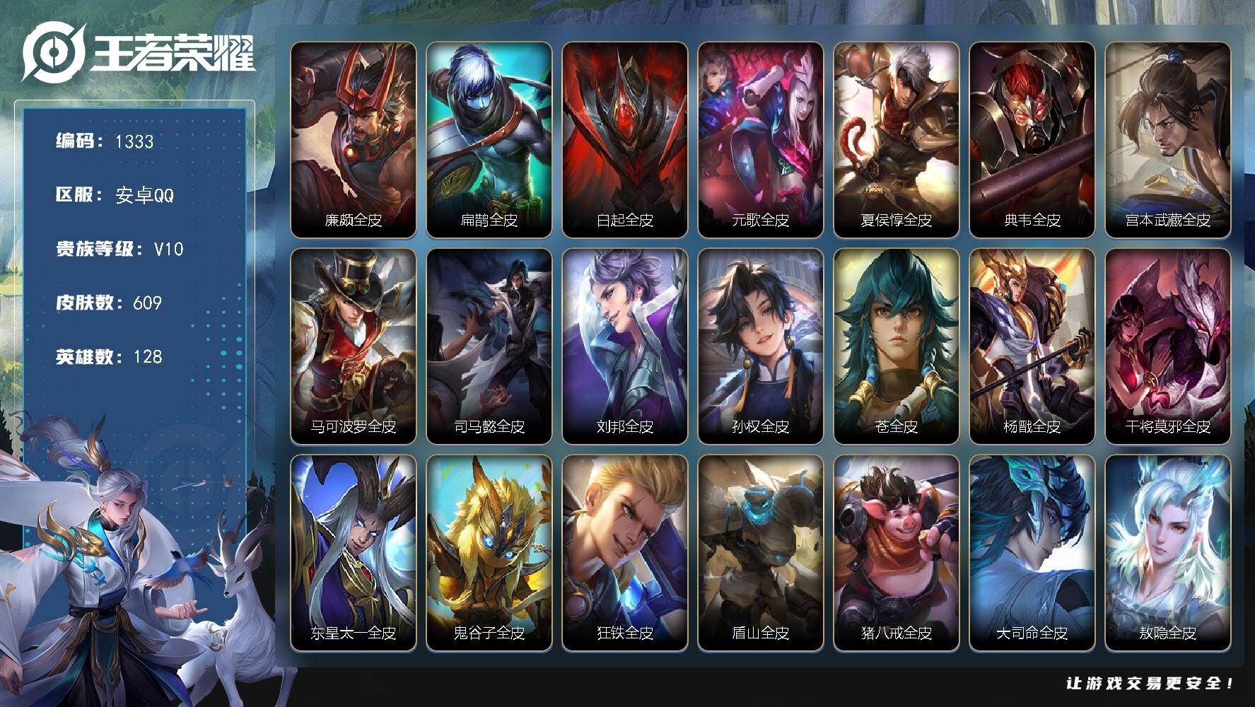 【账号佳】 【可二次实名】可二次安卓Q【营地:322070445】-V10-最强王者段位-128英雄-609皮肤-8典藏皮肤-10无双-7珍品传说-85传说-198史诗【英雄全皮】:廉颇全皮,扁鹊全皮,白起全皮,元歌全皮,夏侯惇全皮,典韦全皮,宫本武藏全皮,马可波罗全皮,司马懿全皮,刘邦全皮,孙权全皮,苍全皮,杨戬全皮,干将莫邪全皮,东皇太一全皮,鬼谷子全皮,狂铁全皮,盾山全皮,猪八戒全皮,大司命全皮,敖隐全皮,蒙犽全皮,鲁班大师全皮,蒙恬全皮,阿古朵全皮,桑启全皮,司空震全皮,暃全皮,戈娅全皮,空空儿全皮,影全皮,海诺全皮,姬小满全皮,少司缘全皮【荣耀典藏】:孙悟空全息碎影,夏侯惇无限飓风号,孙尚香杀手不太冷,诸葛亮星域神启,花木兰九霄神辉,关羽赤影疾锋,铠银白咏叹调,韩信弑枪猎影【无双皮肤】:孙悟空无相,铠神罪,诸葛亮天机白泽,曜器灵螭龙剑,甄姬雪境奇遇,不知火舞花合斗,韩信群星魔术团,李白碎月剑心,瑶真我赫兹,妲己青丘九尾【珍品传说】:宫本武藏黑崎一护,暃朽木白哉,瑶大耳狗之梦,嫦娥器灵落星盏,孙策时之奇旅,鲁班七号江户川柯南,马可波罗怪盗基德【传说皮肤】:王昭君长夜焕生,杨戬纵目迁山,后羿神树通天,曹操万灵伏威,干将莫邪千山共赴,元歌诡秘之主,大司命死亡执政官,司马懿九山相柳,公孙离云诺千山,西施续相思,司空震愿照山河定,女娲愿照千秋盛,妲己愿照众生和,澜愿照九州拓,蔡文姬愿照福禄聚,虞姬愿照岁时盈,云缨幻光神枪,裴擒虎祥瑞亨通,桑启鸣野蒿,夏侯惇霜北刀,朵莉亚心动手记,云中君群星魔术团,墨子黄金天蝎座,海月金乌负日,亚连落雪白狼,吕布曦玄引,貂蝉曦玄引,典韦战鼓燎原,孙尚香乘龙问璇玑,孙策乘龙淬吴钩,赵云乘龙铭钟鼎,马超琥珀纪元,铠琥珀纪元,澜逐花归海,艾琳觅芳踪,露娜霜月吟,狄仁杰夜礼服假面,王昭君永恒水手月亮,鲁班七号时之奇旅,宫本武藏惊梅引,上官婉儿妄想奇谈,马可波罗妄想实况,东皇太一灼幽烈阳,干将莫邪画中仙,花木兰燃星之曲,伽罗炽翼辉光,小乔山海琳琅生,李信山海炽霜斩,吕布怒海麟威,百里守约碎云,马可波罗深海之息,马超无双飞将,蔡文姬花朝如约,孙策末日机甲,裴擒虎寅虎赤拳,鲁班七号寅虎瑞焰,赵云淬星耀世,王昭君乞巧织情,西施游龙清影,曜李逍遥 ,周瑜音你心动,小乔音你心动,李元芳飞鸢探春,公孙离祈雪灵祝,镜炽阳神光,虞姬启明星使,关羽武圣,曜云鹰飞将,李信一念神魔,刘备时之恋人,貂蝉猫影幻舞,张良黄金白羊座,干将莫邪久胜战神,虞姬云霓雀翎,达摩黄金狮子座,花木兰冠军飞将,梦奇胖达荣荣,后羿黄金射手座,杨戬永曜之星,貂蝉仲夏夜之梦,孙尚香末日机甲,宫本武藏地狱之眼,孙悟空地狱火,吕布天魔缭乱,武则天海洋之心【限定皮肤】:夏侯惇霜北刀,廉颇寅虎御盾,小乔山海琳琅生,鲁班七号寅虎瑞焰,鲁班七号时之奇旅,庄周高山流水,孙膑寅虎展翼,吕布天魔缭乱,甄姬游园惊梦,典韦岱宗,马可波罗深海之息,马可波罗山海玄木吟,马可波罗妄想实况,关羽冰锋战神,关羽武圣,韩信飞衡,韩信傲雪梅枪,王昭君午后时光,花木兰默契交锋,花木兰燃星之曲,孙悟空孙行者,后羿辉光之辰,虞姬启明星使,杨玉环遇见飞天,杨玉环寅虎心曲,杨戬永曜之星,干将莫邪画中仙,鬼谷子五谷丰年,公孙离祈雪灵祝,裴擒虎李小龙,裴擒虎寅虎赤拳,裴擒虎擒涛扼浪,李信山海炽霜斩,伽罗天狼溯光者,伽罗炽翼辉光,猪八戒猪悟能,上官婉儿梁祝,上官婉儿妄想奇谈,曜李逍遥 ,阿古朵江河有灵,狄仁杰夜礼服假面,艾琳觅芳踪,李白碎月剑心,伽罗琥珀纪元,铠琥珀纪元,马超琥珀纪元,大乔乘龙忆丹青,安琪拉乘龙聚宝船,孙尚香乘龙问璇玑,孙策乘龙淬吴钩,赵云乘龙铭钟鼎,吕布曦玄引,貂蝉曦玄引,上官婉儿群星魔术团,程咬金群星魔术团,韩信群星魔术团,云中君群星魔术团,朵莉亚心动手记,海诺心动手记,周瑜熔金海岸,不知火舞花合斗【年限皮肤】:杨戬永曜之星,后羿辉光之辰,典韦岱宗,韩信飞衡,公孙离祈雪灵祝,裴擒虎寅虎赤拳,鲁班七号寅虎瑞焰,孙膑寅虎展翼,廉颇寅虎御盾,杨玉环寅虎心曲,小乔山海琳琅生,李信山海炽霜斩,马可波罗山海玄木吟,孙尚香乘龙问璇玑,孙策乘龙淬吴钩,赵云乘龙铭钟鼎,大乔乘龙忆丹青,安琪拉乘龙聚宝船,司空震愿照山河定,女娲愿照千秋盛,妲己愿照众生和,澜愿照九州拓,蔡文姬愿照福禄聚,虞姬愿照岁时盈,各种道具详情看截图、低价出售找回包 赔、截图展示段位不代 表实际段位,如赛季更新等不可抗拒因素发生变化、时限道具不保证所剩时间、标题未写送点劵默认不送【卖号买号首选亿梦】