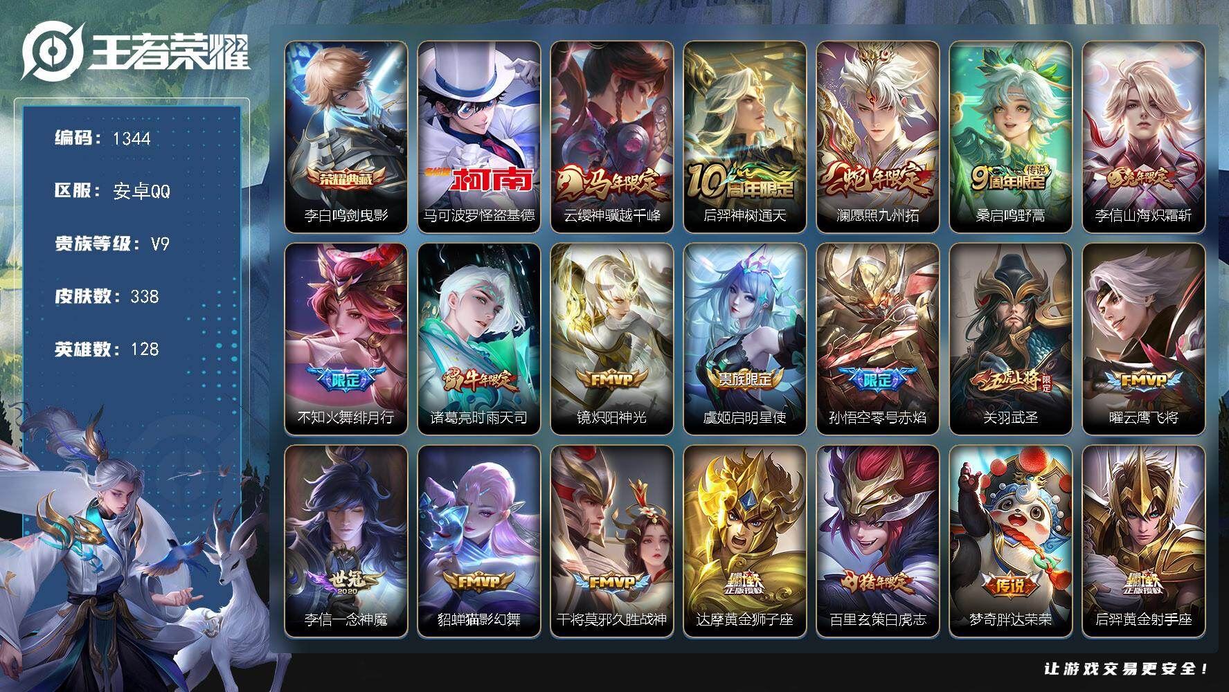 【账号佳】 【可二次实名】可二次QQ 王者安卓Q-V9-至尊星耀IV段位-128英雄-338皮肤-1典藏皮肤-1珍品传说-25传说-104史诗【荣耀典藏】:李白鸣剑曳影【珍品传说】:马可波罗怪盗基德【传说皮肤】:云缨神骥越千峰,后羿神树通天,澜愿照九州拓,桑启鸣野蒿,李信山海炽霜斩,不知火舞绯月行,诸葛亮时雨天司,镜炽阳神光,虞姬启明星使,孙悟空零号赤焰,关羽武圣,曜云鹰飞将,李信一念神魔,貂蝉猫影幻舞,干将莫邪久胜战神,达摩黄金狮子座,百里玄策白虎志,梦奇胖达荣荣,后羿黄金射手座,诸葛亮武陵仙君,貂蝉仲夏夜之梦,孙尚香末日机甲,宫本武藏地狱之眼,孙悟空地狱火,狄仁杰超时空战士【限定皮肤】:蔡文姬夏日便利店,大乔绒语心约,虞姬夏日便利店,姜子牙天穹之誓,狄仁杰阴阳师,赵云皇家上将,赵云龙胆,墨子神迹守卫,嬴政优雅恋人,庄周高山流水,高渐离玩趣恶龙,阿轲迷踪丽影,孙膑天狼运算者,白起夜都怪侠,芈月幻夜卜梦,吕布御风骁将,元歌云间偶戏,元歌无心,夏侯惇朔风刀,马可波罗逐梦之星,马可波罗暗影游猎,狄仁杰魔术师,狄仁杰万华元夜,达摩星际陆战队,达摩沙漠行僧,项羽海滩派对,老夫子醍醐杖,老夫子航海奇遇记,关羽冰锋战神,关羽武圣,程咬金演武夺筹,刘邦夺宝奇兵,韩信逐梦之影,韩信傲雪梅枪,王昭君午后时光,兰陵王金庭之子,不知火舞绯月行,亚瑟潮玩骑士王,孙悟空至尊宝,孙悟空大圣娶亲,孙悟空零号赤焰,后羿圣弓游侠,李元芳银河之约,李元芳云中旅人,虞姬启明星使,钟馗驱傩正仪,干将莫邪冰霜恋舞曲,干将莫邪真爱魔法,雅典娜单词大作战,雅典娜黎明之约,鬼谷子原初探秘者,鬼谷子五谷丰年,诸葛亮武陵仙君,诸葛亮时雨天司,黄忠火炮绅士,铠青龙志,苏烈千军破阵,百里玄策白虎志,百里玄策原初追逐者,百里守约朱雀志,弈星混沌棋,梦奇顽趣,沈梦溪星空之诺,沈梦溪大漠名商,明世隐疑决卦,明世隐吟游魔法,裴擒虎李小龙,裴擒虎擒涛扼浪,狂铁电玩高手,米莱狄胡桃异想国,云中君纤云弄巧,李信山海炽霜斩,伽罗天狼溯光者,猪八戒西部大镖客,上官婉儿梁祝,上官婉儿天狼绘梦者,嫦娥拒霜思,嫦娥暖冬兔眠,蒙犽狂想玩偶喵,鲁班大师探海日志,桑启海盐诗旅,暃星界游侠,阿古朵江河有灵,张良古海寻踪,蒙恬荣光圣徽,鬼谷子天穹祈灯,姬小满妄想食味,沈梦溪龙舞盛年,刘邦剑破天穹,程咬金群星魔术团,镜青焰无极,项羽苍威无极,刘备异域游侠,周瑜熔金海岸【年限皮肤】:百里玄策白虎志,百里守约朱雀志,铠青龙志,诸葛亮时雨天司,吕布御风骁将,李信山海炽霜斩,澜愿照九州拓【营地ID】:1857524239 各种道具详情看截图、低价出售找回包 赔、截图展示段位不代 表实际段位,如赛季更新等不可抗拒因素发生变化、时限道具不保证所剩时间、标题未写送点劵默认不送【卖号买号首选亿梦】