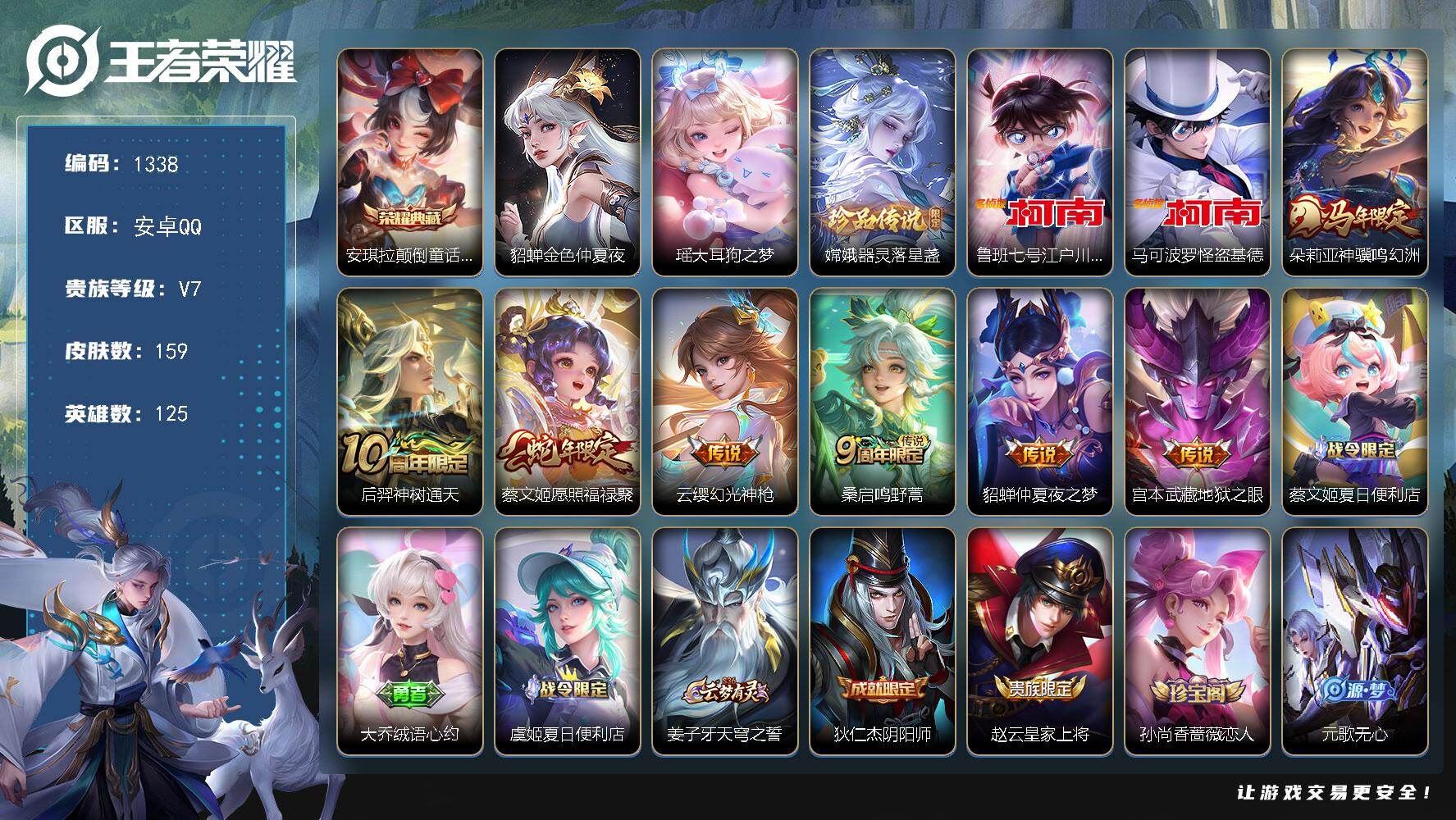 【账号佳】 【可二次实名】可二次安卓Q-V7-尊贵铂金III段位-125英雄-159皮肤-1典藏皮肤-4珍品传说-7传说-43史诗【英雄全皮】:孙权全皮,影全皮【荣耀典藏】:安琪拉颠倒童话魔镜【珍品传说】:瑶大耳狗之梦,嫦娥器灵落星盏,鲁班七号江户川柯南,马可波罗怪盗基德【营地ID】:1801468430【星元皮肤】:貂蝉金色仲夏夜【传说皮肤】:朵莉亚神骥鸣幻洲,后羿神树通天,蔡文姬愿照福禄聚,云缨幻光神枪,桑启鸣野蒿,貂蝉仲夏夜之梦,宫本武藏地狱之眼【限定皮肤】:蔡文姬夏日便利店,大乔绒语心约,虞姬夏日便利店,姜子牙天穹之誓,狄仁杰阴阳师,赵云皇家上将,孙尚香蔷薇恋人,元歌无心,狄仁杰魔术师,狄仁杰万华元夜,项羽海滩派对,程咬金演武夺筹,李元芳云中旅人,鬼谷子五谷丰年,嫦娥暖冬兔眠,鲁班大师探海日志,桑启海盐诗旅,妲己灵卜魔法,刘邦剑破天穹,海诺心动手记,周瑜熔金海岸【年限皮肤】:蔡文姬愿照福禄聚【赛季限定】:狄仁杰万华元夜,程咬金演武夺筹,李元芳云中旅人,桑启海盐诗旅,鲁班大师探海日志,刘邦剑破天穹,姜子牙天穹之誓,东皇太一噬灭天穹,太乙真人谧流熔炉,钟馗虚灵犬护【战令限定】:嫦娥暖冬兔眠,妲己灵卜魔法,蔡文姬夏日便利店,虞姬夏日便利店,亚连破空之剑,孙悟空神迹守卫,百里守约百相守梦,老夫子百相守梦,孙膑茶境仙,马超访茗客,刘禅鸭鸭历险记,沈梦溪鸭鸭历险记,周瑜线条小狗,小乔线条小狗,各种道具详情看截图、低价出售找回包 赔、截图展示段位不代 表实际段位,如赛季更新等不可抗拒因素发生变化、时限道具不保证所剩时间、标题未写送点劵默认不送【卖号买号首选亿梦】