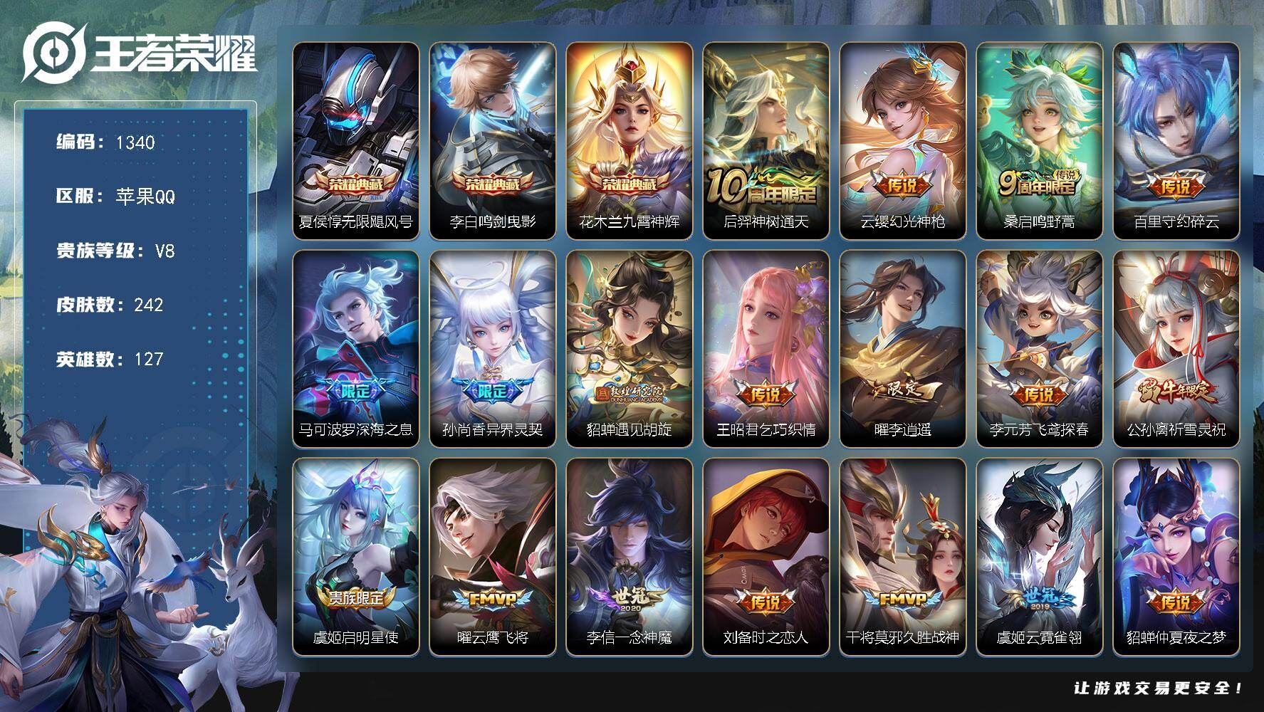 【账号佳】 【可二次实名】可二次QQ【背包一颗水晶】 王者苹果Q-V8-至尊星耀IV段位-127英雄-242皮肤-3典藏皮肤-20传说-85史诗【英雄全皮】:猪八戒全皮【荣耀典藏】:夏侯惇无限飓风号,李白鸣剑曳影,花木兰九霄神辉【传说皮肤】:后羿神树通天,云缨幻光神枪,桑启鸣野蒿,百里守约碎云,马可波罗深海之息,孙尚香异界灵契,貂蝉遇见胡旋,王昭君乞巧织情,曜李逍遥 ,李元芳飞鸢探春,公孙离祈雪灵祝,虞姬启明星使,曜云鹰飞将,李信一念神魔,刘备时之恋人,干将莫邪久胜战神,虞姬云霓雀翎,貂蝉仲夏夜之梦,宫本武藏地狱之眼,孙悟空地狱火【限定皮肤】:狄仁杰阴阳师,赵云皇家上将,赵云百木心枪,墨子神迹守卫,妲己时之彼端,嬴政优雅恋人,孙尚香异界灵契,鲁班七号乒乒小将,庄周高山流水,阿轲迷踪丽影,芈月幻夜卜梦,元歌无心,甄姬女儿国国王,甄姬游园惊梦,典韦蓝屏警告,马可波罗暗影游猎,马可波罗深海之息,狄仁杰魔术师,狄仁杰万华元夜,达摩星际陆战队,达摩沙漠行僧,项羽海滩派对,老夫子醍醐杖,老夫子航海奇遇记,貂蝉遇见胡旋,程咬金演武夺筹,露娜一生所爱,刘邦夺宝奇兵,韩信傲雪梅枪,兰陵王金庭之子,孙悟空孙行者,后羿圣弓游侠,李元芳云中旅人,虞姬启明星使,钟馗驱傩正仪,干将莫邪真爱魔法,蔡文姬繁星吟游,鬼谷子原初探秘者,鬼谷子五谷丰年,黄忠火炮绅士,苏烈千军破阵,弈星混沌棋,公孙离祈雪灵祝,沈梦溪大漠名商,明世隐疑决卦,裴擒虎李小龙,裴擒虎擒涛扼浪,米莱狄胡桃异想国,云中君纤云弄巧,伽罗天狼溯光者,盾山御銮,猪八戒西部大镖客,猪八戒猪悟能,上官婉儿天狼绘梦者,上官婉儿神器万象笔,嫦娥拒霜思,曜李逍遥 ,桑启海盐诗旅,艾琳女武神,阿古朵江河有灵,沈梦溪龙舞盛年,刘邦剑破天穹,程咬金群星魔术团【年限皮肤】:公孙离祈雪灵祝【赛季限定】:盾山御銮,弈星混沌棋,明世隐疑决卦,老夫子醍醐杖,鬼谷子原初探秘者,狄仁杰万华元夜,程咬金演武夺筹,钟馗驱傩正仪,苏烈千军破阵,达摩沙漠行僧,兰陵王金庭之子,沈梦溪大漠名商,李元芳云中旅人,桑启海盐诗旅,裴擒虎擒涛扼浪,刘邦剑破天穹,东皇太一噬灭天穹,太乙真人谧流熔炉【战令限定】:典韦蓝屏警告,阿轲迷踪丽影,刘邦夺宝奇兵,马可波罗暗影游猎,猪八戒西部大镖客,米莱狄胡桃异想国,达摩星际陆战队,老夫子航海奇遇记,墨子神迹守卫,干将莫邪真爱魔法,后羿圣弓游侠,黄忠火炮绅士,芈月幻夜卜梦,亚连破空之剑,孙悟空神迹守卫,莱西奥光弋星穹,明世隐往忆晖光,周瑜线条小狗,小乔线条小狗【史诗皮肤】:周瑜线条小狗,小乔线条小狗,女娲万灵启世,莱西奥光弋星穹,亚连破空之剑,阿古朵江河有灵,元歌无心,上官婉儿神器万象笔,鬼谷子五谷丰年,赵云百木心枪,韩信傲雪梅枪,甄姬女儿国国王,黄忠火炮绅士,嫦娥拒霜思,庄周高山流水,猪八戒猪悟能,孙悟空孙行者,安琪拉时之奇旅,钟馗乐园奇幻夜,干将莫邪真爱魔法,杨戬天秀启明,鲁班七号乒乒小将,伽罗天狼溯光者,老夫子航海奇遇记,米莱狄胡桃异想国,云中君纤云弄巧,裴擒虎李小龙,马可波罗暗影游猎,上官婉儿天狼绘梦者,孙尚香时之恋人,橘右京修罗,阿轲迷踪丽影,不知火舞魅语,小乔青蛇,大乔白蛇,妲己时之彼端,娜可露露晚萤,蔡文姬繁星吟游,公孙离无限星赏官,狄仁杰鹰眼统帅,伽罗箭羽风息,典韦蓝屏警告,露娜一生所爱,孙策猫狗日记,阿轲节奏热浪,白起星夜王子,程咬金功夫厨神,李元芳逐浪之夏,刘禅天才门将,蔡文姬舞动绿茵,铠曙光守护者,百里守约特工魅影,安琪拉心灵骇客,雅典娜冰冠公主,亚瑟心灵战警,甄姬游园惊梦,诸葛亮黄金分割率,兰陵王暗隐猎兽者,小乔缤纷独角兽,夏侯惇乘风破浪,刘邦德古拉伯爵,花木兰水晶猎龙者,张飞乱世虎臣,吕布末日机甲,李白千年之狐,曹操幽灵船长,刘禅绅士熊喵,吕布圣诞狂欢,墨子金属风暴,墨子龙骑士,妲己女仆咖啡,妲己魅力维加斯,嬴政摇滚巨星,嬴政暗夜贵公子,嬴政优雅恋人,孙尚香水果甜心,宫本武藏鬼剑武藏,廉颇地狱岩魂,狄仁杰魔术师,王昭君偶像歌手,甄姬冰雪圆舞曲,貂蝉圣诞恋歌,赵云未来纪元,赵云皇家上将,阿轲暗夜猫娘,露娜紫霞仙子【营地ID】:2136689448,各种道具详情看截图、低价出售找回包 赔、截图展示段位不代 表实际段位,如赛季更新等不可抗拒因素发生变化、时限道具不保证所剩时间、标题未写送点劵默认不送【卖号买号首选亿梦】