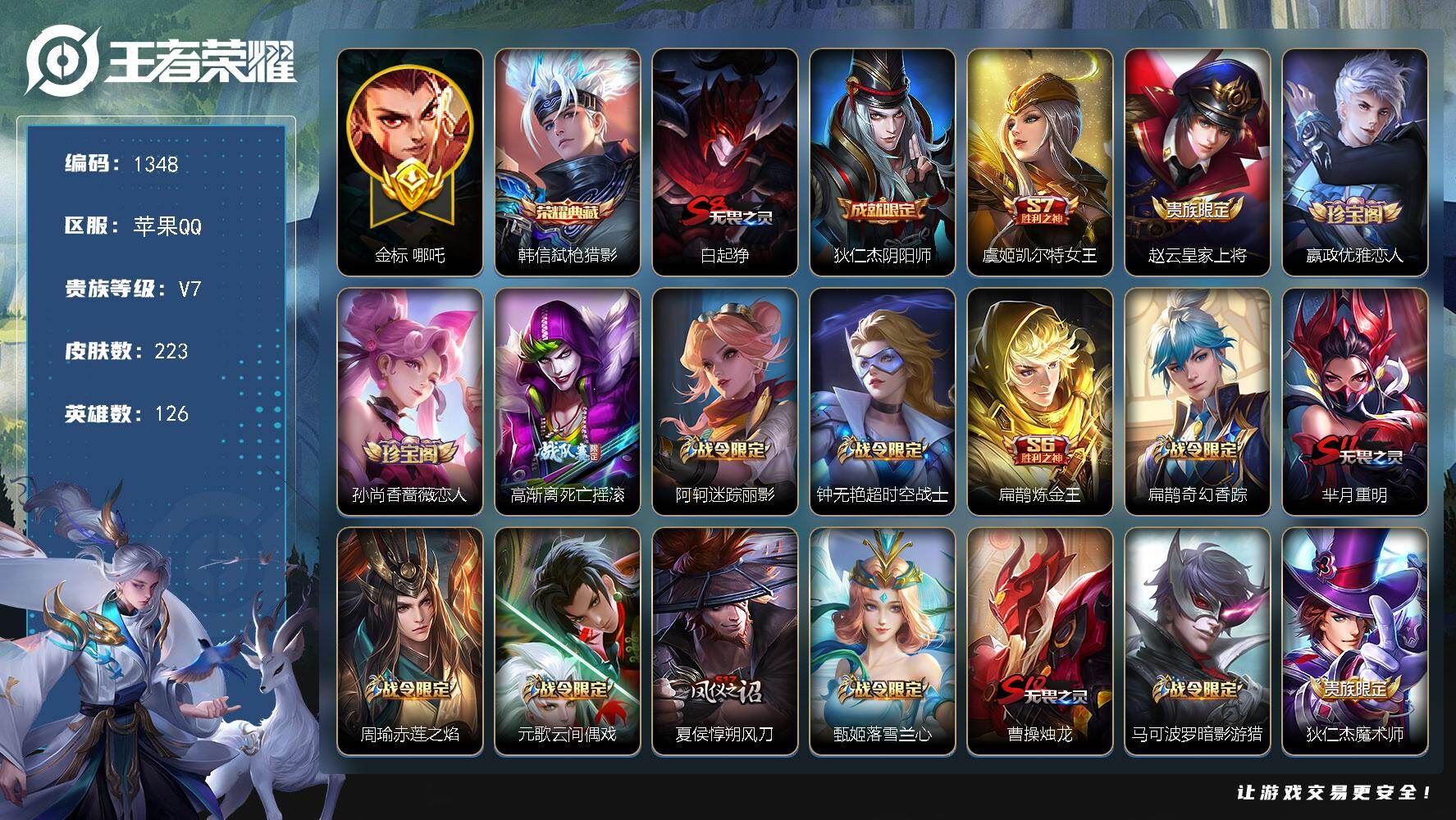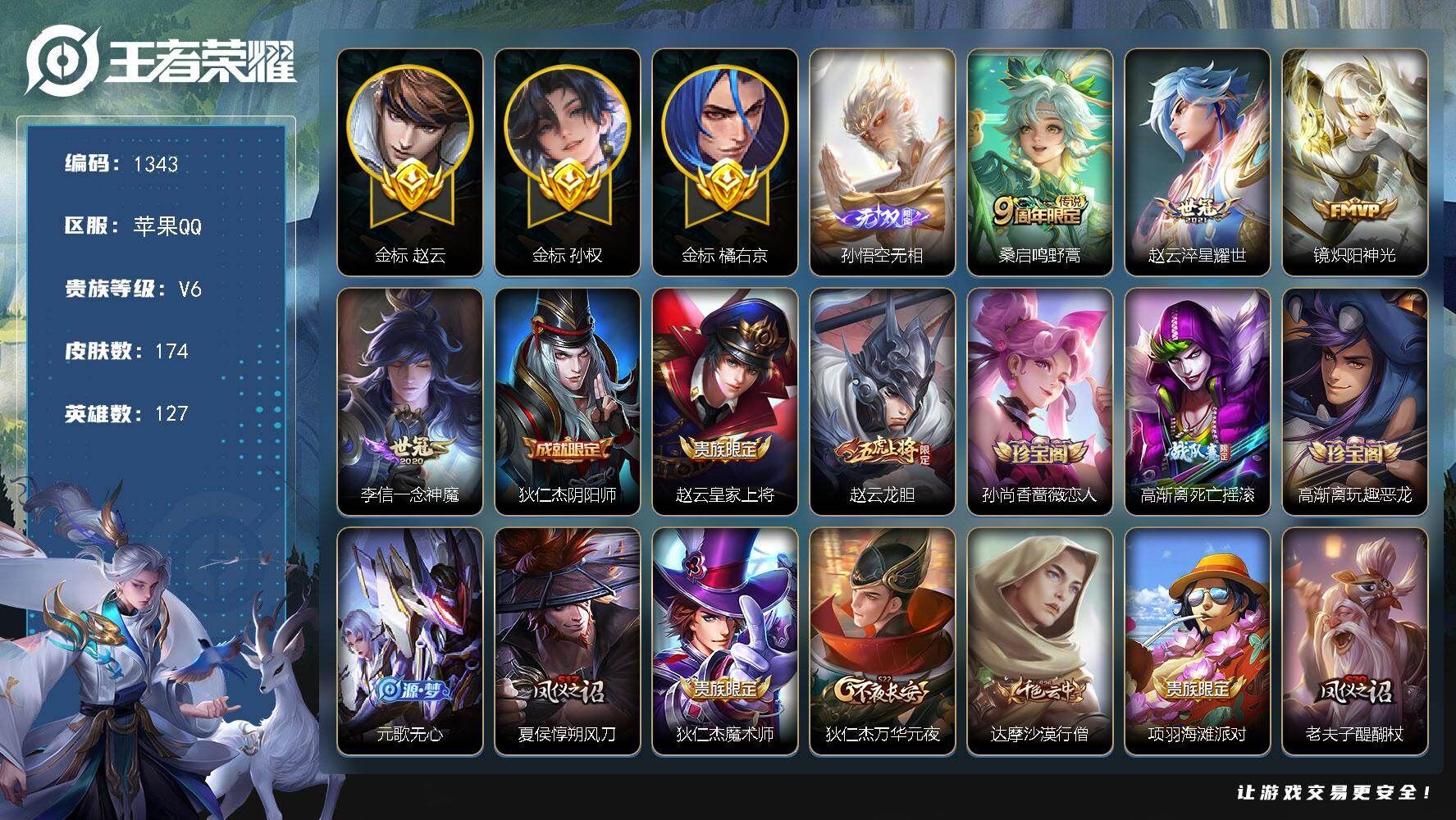 【账号佳】 【可二次实名】【英雄数量】126 【皮肤数量】174 【区服】苹果QQ143区 【有无防沉迷】无防沉迷 【场次】6613 【胜率】53.90% 【段位】荣耀王者 【贵族等级】7 【稀有英雄】9 _赵云 _艾琳 _娜可露露 _橘右京 _韩信 _夏洛特 _金蝉 _不知火舞 _武则天 【皮肤价值】107016 【内测皮肤】3 姬小满_妄想食味 干将莫邪_胡桃夹子 高渐离_玩趣恶龙 【荣耀皮肤】1 武则天 【珍品无双】0 【无双皮肤】0 【珍品传说】1 孙策_时之奇旅 【星元皮肤】2 幻海之心 幽冥之眼 【传说皮肤】8 女娲_愿照千秋盛 云缨_幻光神枪 桑启_鸣野蒿 孙策_挚爱之约 宫本武藏_地狱之眼 武则天_海洋之心 貂蝉_猫影幻舞 张良_黄金白羊座 【史诗皮肤】46 女娲_万灵启世 百里守约_百相守梦 狂铁_龙之律动 赵怀真_器灵浮梦炉 莱西奥_光弋星穹 少司缘_巫礼祀神 狄仁杰_魔术师 赵云_皇家上将 王昭君_凤凰于飞 伽罗_箭羽风息 花木兰_水晶猎龙者 鬼谷子_五谷丰年 庄周_高山流水 上官婉儿_梁祝 沈梦溪_月团寄思 孙策_猫狗日记 程咬金_功夫厨神 李元芳_逐浪之夏 刘禅_天才门将 百里守约_特工魅影 雅典娜_冰冠公主 兰陵王_暗隐猎兽者 小乔_缤纷独角兽 夏侯惇_乘风破浪 刘邦_德古拉伯爵 李白_千年之狐 曹操_幽灵船长 妲己_魅力维加斯 宫本武藏_鬼剑武藏 廉颇_地狱岩魂 露娜_紫霞仙子 吕布_圣诞狂欢 墨子_金属风暴 孙尚香_水果甜心 嬴政_摇滚巨星 赵云_未来纪元 甄姬_冰雪圆舞曲 元歌_无心 蒙恬_荣光圣徽 梦奇_顽趣 雅典娜_黎明之约 百里玄策_原初追逐者 张飞_乱世虎臣 钟无艳_王者之锤 狄仁杰_鹰眼统帅 【其他皮肤】117 虞姬_溯影追猎 蒙恬_苍云破阵 安琪拉_糖果风暴 蚩奼_极光幻客 曹操_逐霄之志 程咬金_无双福将 张良_罗小黑战记 甄姬_逆浪荇歌 艾琳_鹤鸣心笺 典韦_铁骨偃魂 姜子牙_星梦巡礼 哪吒_罗小黑战记 钟馗_虚灵犬护 干将莫邪_雾都夜雨 庄周_锦麟游梦 东皇太一_噬灭天穹 苍_维京掠夺者 苍_苍林狼骑 虞姬_夏日便利店 老夫子_百相守梦 亚瑟_荣光之誓 明世隐_往忆晖光 白起_死霸装 铠_龙域领主 西施_雪境奇遇 太乙真人_谧流熔炉 莱西奥_踏浪烽翎 大司命_暗都幽影 孙权_径山谋武 项羽_海滩派对 鬼谷子_天穹祈灯 张良_古海寻踪 鲁班大师_探海日志 裴擒虎_擒涛扼浪 桑启_海盐诗旅 沈梦溪_大漠名商 兰陵王_金庭之子 李元芳_云中旅人 达摩_沙漠行僧 苏烈_千军破阵 钟馗_驱傩正仪 程咬金_演武夺筹 沈梦溪_龙舞盛年 后羿_完美运算 太乙真人_劲辣红锅 蒙恬_蔚蓝守将 刘禅_唤灵魔甲 鲁班大师_乓乓大师 张良_缤纷绘卷 姜子牙_炽热元素使 孙膑_归虚梦演 刘备_纽约教父 扁鹊_化身博士 关羽_龙腾万里 宫本武藏_万象初新 刘备_万事如意 甄姬_花好人间 廉颇_功夫炙烤 赵怀真_太极少年 猪八戒_潮玩探月行 妲己_紫罗兰之誓 盘古_重装意志 刘禅_秘密基地 哪吒_次元突破 沈梦溪_鲨炮海盗猫 小乔_丁香结 明世隐_虹云星官 鬼谷子_幻乐之宴 老夫子_功夫老勺 狂铁_命运角斗场 王昭君_幻想奇妙夜 钟无艳_海滩丽影 后羿_阿尔法小队 花木兰_兔女郎 达摩_拳王 白起_白色死神 达摩_大发明家 韩信_街头霸王 韩信_教廷特使 孙膑_天使之翼 妲己_少女阿狸 露娜_哥特玫瑰 亚瑟_死亡骑士 大乔_守护之力 苏烈_坚韧之力 李白_敏锐之力 孙尚香_沉稳之力 狄仁杰_阴阳师 暃_碧珀绯影 金蝉_前尘 云缨_赤焰之缨 司空震_启蛰 澜_孤猎 阿古朵_熊喵少女 蒙恬_秩序猎龙将 鲁班大师_归虚梦演 马超_幸存者 曜_归虚梦演 盘古_创世神祝 嫦娥_露花倒影 李信_灼热之刃 司马懿_魇语军师 孙策_海之征途 元歌_午夜歌剧院 米莱狄_精准探案法 女娲_尼罗河女神 苏烈_爱与和平 百里守约_绝影神枪 诸葛亮_星航指挥官 哪吒_三太子 杨戬_埃及法老 马可波罗_激情绿茵 钟馗_地府判官 曹操_超能战警 鲁班七号_木偶奇遇记 孙悟空_西部大镖客 王昭君_精灵公主