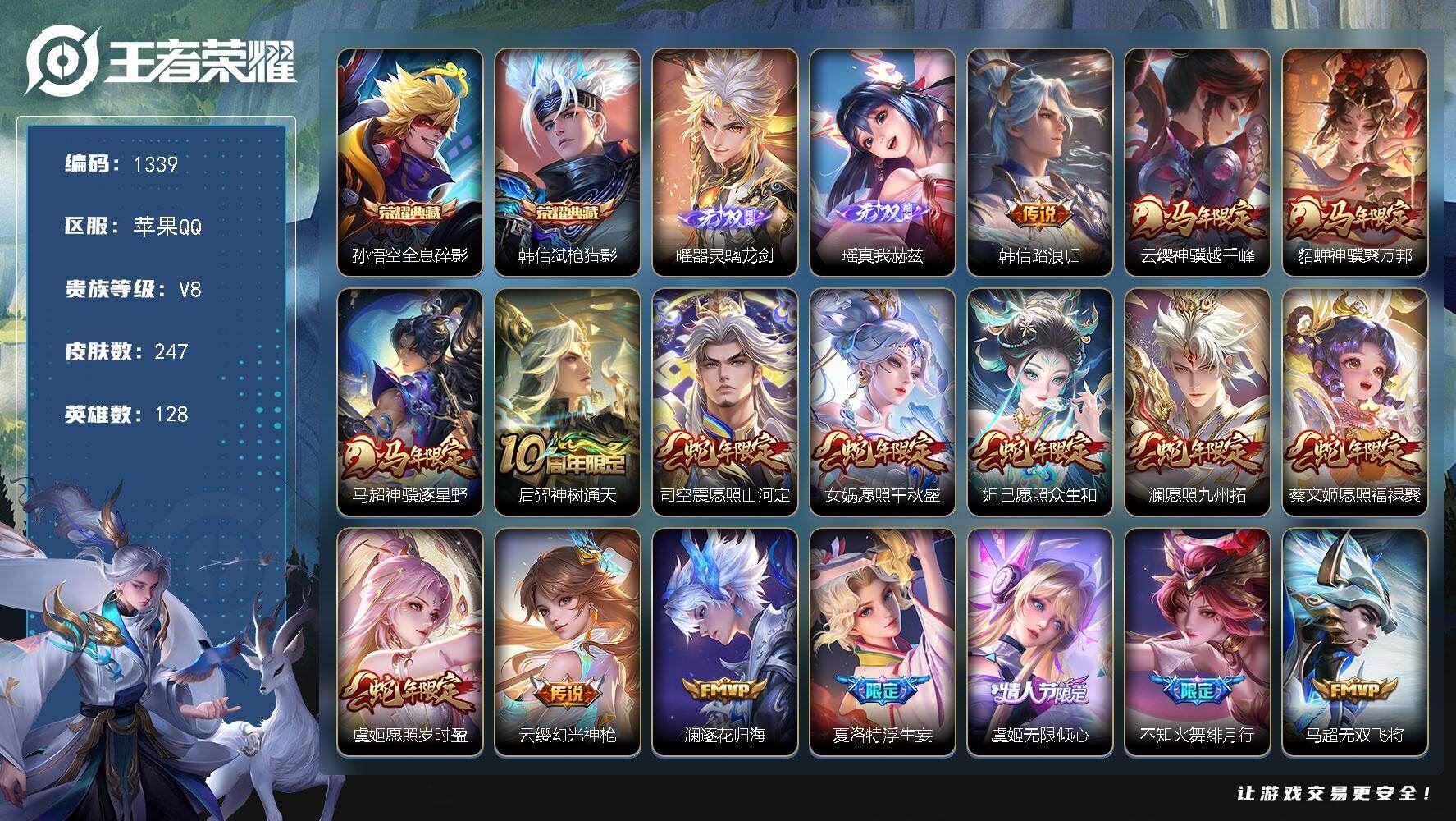 【账号佳】 【可二次实名】可二次QQ 王者苹果Q-V8-最强王者段位-128英雄-247皮肤-2典藏皮肤-2无双-28传说-53史诗【英雄全皮】:孙权全皮,敖隐全皮,影全皮【荣耀典藏】:孙悟空全息碎影,韩信弑枪猎影【无双皮肤】:曜器灵螭龙剑,瑶真我赫兹【传说皮肤】:韩信踏浪归,云缨神骥越千峰,貂蝉神骥聚万邦,马超神骥逐星野,后羿神树通天,司空震愿照山河定,女娲愿照千秋盛,妲己愿照众生和,澜愿照九州拓,蔡文姬愿照福禄聚,虞姬愿照岁时盈,云缨幻光神枪,澜逐花归海,夏洛特浮生妄,虞姬无限倾心,不知火舞绯月行,马超无双飞将,公孙离祈雪灵祝,虞姬启明星使,伽罗太华,貂蝉猫影幻舞,干将莫邪久胜战神,虞姬云霓雀翎,百里玄策白虎志,花木兰冠军飞将,孙尚香末日机甲,宫本武藏地狱之眼,孙悟空地狱火【限定皮肤】:白起狰,狄仁杰阴阳师,虞姬凯尔特女王,赵云皇家上将,赵云引擎之心,鲁班七号狮舞东方,高渐离玩趣恶龙,钟无艳王者之锤,夏侯惇朔风刀,曹操烛龙,典韦穷奇,马可波罗山海玄木吟,狄仁杰魔术师,狄仁杰万华元夜,达摩沙漠行僧,项羽海滩派对,老夫子醍醐杖,程咬金演武夺筹,韩信飞衡,兰陵王金庭之子,不知火舞绯月行,孙悟空大圣娶亲,牛魔御旌,后羿如梦令,李元芳银河之约,李元芳云中旅人,虞姬启明星使,虞姬无限倾心,钟馗神迹守卫,钟馗驱傩正仪,太乙真人饕餮,鬼谷子原初探秘者,鬼谷子五谷丰年,百里玄策白虎志,弈星混沌棋,公孙离祈雪灵祝,沈梦溪星空之诺,沈梦溪大漠名商,明世隐疑决卦,裴擒虎李小龙,裴擒虎擒涛扼浪,米莱狄御霄,瑶山海碧波行,云中君纤云弄巧,伽罗太华,盾山御銮,上官婉儿梁祝,嫦娥暖冬兔眠,桑启海盐诗旅,夏洛特浮生妄,妲己灵卜魔法,鬼谷子天穹祈灯,刘邦剑破天穹,程咬金群星魔术团【年限皮肤】:百里玄策白虎志,伽罗太华,韩信飞衡,公孙离祈雪灵祝,瑶山海碧波行,马可波罗山海玄木吟,司空震愿照山河定,女娲愿照千秋盛,妲己愿照众生和,澜愿照九州拓,蔡文姬愿照福禄聚,虞姬愿照岁时盈【赛季限定】:虞姬凯尔特女王,白起狰,太乙真人饕餮,曹操烛龙,典韦穷奇,米莱狄御霄,牛魔御旌,盾山御銮,夏侯惇朔风刀,弈星混沌棋,明世隐疑决卦,老夫子醍醐杖,鬼谷子原初探秘者,狄仁杰万华元夜,程咬金演武夺筹,钟馗驱傩正仪,达摩沙漠行僧,兰陵王金庭之子,沈梦溪大漠名商,李元芳云中旅人,桑启海盐诗旅,裴擒虎擒涛扼浪,鬼谷子天穹祈灯,刘邦剑破天穹,东皇太一噬灭天穹,太乙真人谧流熔炉,钟馗虚灵犬护,甄姬逆浪荇歌,亚瑟荣光之誓【战令限定】:鲁班七号狮舞东方,钟馗神迹守卫,李元芳银河之约,沈梦溪星空之诺,嫦娥暖冬兔眠,妲己灵卜魔法,莱西奥光弋星穹,明世隐往忆晖光,周瑜线条小狗,小乔线条小狗【史诗皮肤】:明世隐百晓客,周瑜线条小狗,小乔线条小狗,少司缘巫礼祀神,莱西奥光弋星穹,西施织梦人,百里守约雪豹霜爪,狂铁龙之律动,阿轲化蝶舞,弈星万物之道,妲己灵卜魔法,瑶山海碧波行,马可波罗山海玄木吟,鬼谷子五谷丰年,杨戬天秀启明,云中君纤云弄巧,裴擒虎李小龙,马超神威,后羿如梦令,韩信飞衡,娜可露露晚萤,李元芳银河之约,上官婉儿梁祝,狄仁杰鹰眼统帅,鲁班七号狮舞东方,伽罗箭羽风息,孙悟空大圣娶亲,刘禅天才门将,蔡文姬舞动绿茵,铠曙光守护者,百里守约特工魅影,安琪拉心灵骇客,兰陵王暗隐猎兽者,小乔缤纷独角兽,刘邦德古拉伯爵,赵云引擎之心,韩信白龙吟,张飞乱世虎臣,吕布末日机甲,李白千年之狐,曹操幽灵船长,刘禅绅士熊喵,吕布圣诞狂欢,墨子金属风暴,嬴政摇滚巨星,嬴政暗夜贵公子,孙尚香水果甜心,廉颇地狱岩魂,狄仁杰魔术师,王昭君偶像歌手,甄姬冰雪圆舞曲,貂蝉圣诞恋歌,赵云皇家上将,钟无艳王者之锤,露娜紫霞仙子,【营地ID】:498035630,各种道具详情看截图、低价出售找回包 赔、截图展示段位不代 表实际段位,如赛季更新等不可抗拒因素发生变化、时限道具不保证所剩时间、标题未写送点劵默认不送【卖号买号首选亿梦】
