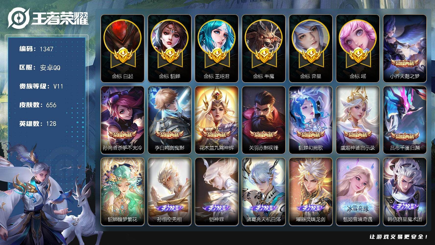【账号佳】 【可二次实名】可二次QQ 王者安卓Q-V7-至尊星耀V段位-128英雄-177皮肤-1典藏皮肤-1无双-7传说-50史诗【英雄全皮】:孙权全皮【荣耀典藏】:瑶拾光映像【无双皮肤】:诸葛亮天机白泽【传说皮肤】:王昭君长夜焕生,后羿神树通天,公孙离云诺千山,桑启鸣野蒿,孙尚香乘龙问璇玑,西施游龙清影,貂蝉仲夏夜之梦【限定皮肤】:狄仁杰阴阳师,赵云皇家上将,孙尚香蔷薇恋人,元歌无心,狄仁杰魔术师,项羽海滩派对,老夫子醍醐杖,李元芳云中旅人,鬼谷子原初探秘者,沈梦溪大漠名商,裴擒虎李小龙,裴擒虎擒涛扼浪,云中君纤云弄巧,上官婉儿梁祝,嫦娥如梦令,嫦娥拒霜思,嫦娥暖冬兔眠,鲁班大师探海日志,桑启海盐诗旅,暃星界游侠,艾琳流音漫舞,阿古朵江河有灵,张良古海寻踪,鬼谷子天穹祈灯,安琪拉乘龙聚宝船,孙尚香乘龙问璇玑,沈梦溪龙舞盛年,刘邦剑破天穹【年限皮肤】:孙尚香乘龙问璇玑,安琪拉乘龙聚宝船【赛季限定】:老夫子醍醐杖,鬼谷子原初探秘者,沈梦溪大漠名商,李元芳云中旅人,桑启海盐诗旅,裴擒虎擒涛扼浪,鲁班大师探海日志,张良古海寻踪,鬼谷子天穹祈灯,刘邦剑破天穹,钟馗虚灵犬护,甄姬逆浪荇歌,亚瑟荣光之誓【战令限定】:暃星界游侠,嫦娥暖冬兔眠,艾琳流音漫舞,周瑜百相守梦,孙策百相守梦,莱西奥光弋星穹,明世隐往忆晖光,周瑜线条小狗,小乔线条小狗【史诗皮肤】:周瑜线条小狗,小乔线条小狗,少司缘巫礼祀神,女娲万灵启世,莱西奥光弋星穹,公孙离涂山容容,西施织梦人,朵莉亚幻珠鲛人,黄忠百相守梦,周瑜百相守梦,狂铁龙之律动,弈星万物之道,安琪拉乘龙聚宝船,阿古朵江河有灵,暃星界游侠,元歌无心,貂蝉唤灵魅影,嫦娥拒霜思,西施诗语江南,云中君纤云弄巧,裴擒虎李小龙,瑶遇见神鹿,不知火舞魅语,小乔青蛇,嫦娥如梦令,娜可露露晚萤,上官婉儿梁祝,狄仁杰鹰眼统帅,伽罗箭羽风息,大乔猫狗日记,阿轲节奏热浪,李元芳逐浪之夏,蔡文姬舞动绿茵,百里守约特工魅影,安琪拉心灵骇客,雅典娜冰冠公主,兰陵王暗隐猎兽者,小乔缤纷独角兽,刘邦德古拉伯爵,花木兰水晶猎龙者,刘禅绅士熊喵,妲己女仆咖啡,妲己魅力维加斯,嬴政暗夜贵公子,孙尚香水果甜心,孙尚香蔷薇恋人,狄仁杰魔术师,甄姬冰雪圆舞曲,貂蝉圣诞恋歌,赵云皇家上将,露娜紫霞仙子,【营地ID】:1773095604,各种道具详情看截图、低价出售找回包 赔、截图展示段位不代 表实际段位,如赛季更新等不可抗拒因素发生变化、时限道具不保证所剩时间、标题未写送点劵默认不送【卖号买号首选亿梦】