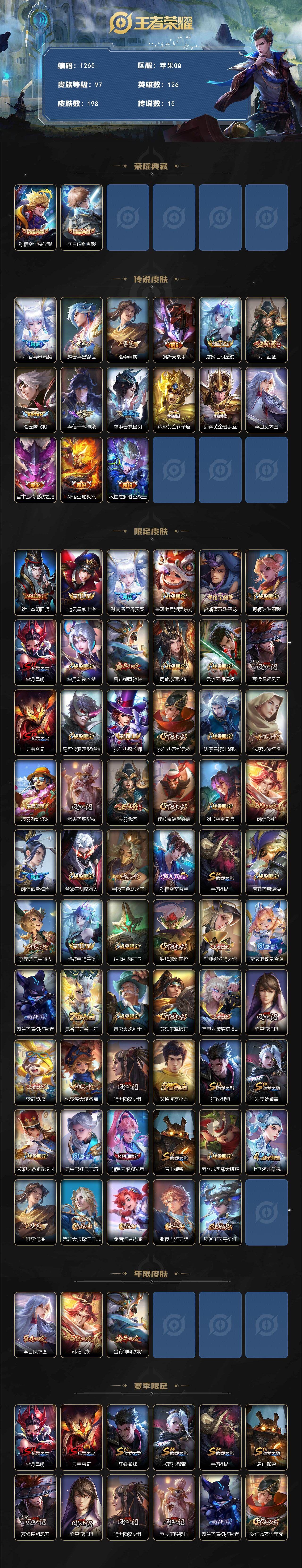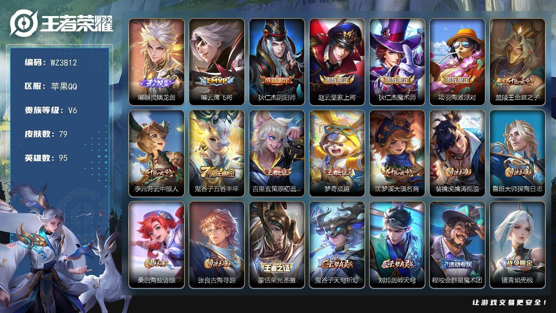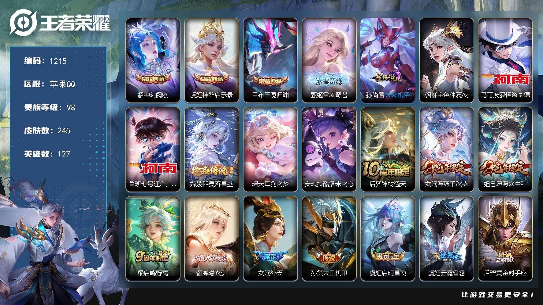 【账号佳】 【可二次实名】可二次苹果Q【营地:1785925933】-V8-至尊星耀III段位-127英雄-245皮肤-3典藏皮肤-1无双-5珍品传说-12传说-73史诗【英雄全皮】:孙权全皮,女娲全皮,空空儿全皮,影全皮【荣耀典藏】:貂蝉幻阙歌,虞姬神鉴启示录,吕布千魇归渊【无双皮肤】:甄姬雪境奇遇【珍品传说】:马可波罗怪盗基德,鲁班七号江户川柯南,嫦娥器灵落星盏,瑶大耳狗之梦,安琪拉酷洛米之心【传说皮肤】:后羿神树通天,女娲愿照千秋盛,妲己愿照众生和,桑启鸣野蒿,貂蝉曦玄引,女娲补天,孙策末日机甲,虞姬启明星使,虞姬云霓雀翎,后羿黄金射手座,貂蝉仲夏夜之梦,孙尚香末日机甲【限定皮肤】:狄仁杰阴阳师,赵云皇家上将,赵云百木心枪,嬴政优雅恋人,孙尚香蔷薇恋人,高渐离死亡摇滚,孙膑寅虎展翼,扁鹊奇幻香踪,白起夜都怪侠,芈月白晶晶,芈月幻夜卜梦,元歌无心,狄仁杰魔术师,达摩沙漠行僧,项羽海滩派对,王昭君午后时光,兰陵王金庭之子,后羿圣弓游侠,李元芳云中旅人,虞姬启明星使,杨玉环寅虎心曲,杨戬潮玩骑兵,女娲朔望之晖,女娲补天,干将莫邪真爱魔法,鬼谷子五谷丰年,黄忠火炮绅士,苏烈千军破阵,沈梦溪大漠名商,明世隐吟游魔法,裴擒虎擒涛扼浪,狂铁电玩高手,瑶山海碧波行,上官婉儿神器万象笔,嫦娥拒霜思,嫦娥暖冬兔眠,鲁班大师探海日志,桑启海盐诗旅,暃星界游侠,艾琳女武神,张良古海寻踪,高渐离燃音魔法,妲己灵卜魔法,鬼谷子天穹祈灯,伽罗琥珀纪元,貂蝉曦玄引,沈梦溪龙舞盛年,鲁班七号蔬乡物语,李元芳蔬乡物语,刘邦剑破天穹,上官婉儿群星魔术团,程咬金群星魔术团,镜青焰无极,项羽苍威无极,周瑜熔金海岸【年限皮肤】:孙膑寅虎展翼,杨玉环寅虎心曲,瑶山海碧波行,女娲愿照千秋盛,妲己愿照众生和,各种道具详情看截图、低价出售找回包 赔、截图展示段位不代 表实际段位,如赛季更新等不可抗拒因素发生变化、时限道具不保证所剩时间、标题未写送点劵默认不送【卖号买号首选亿梦】