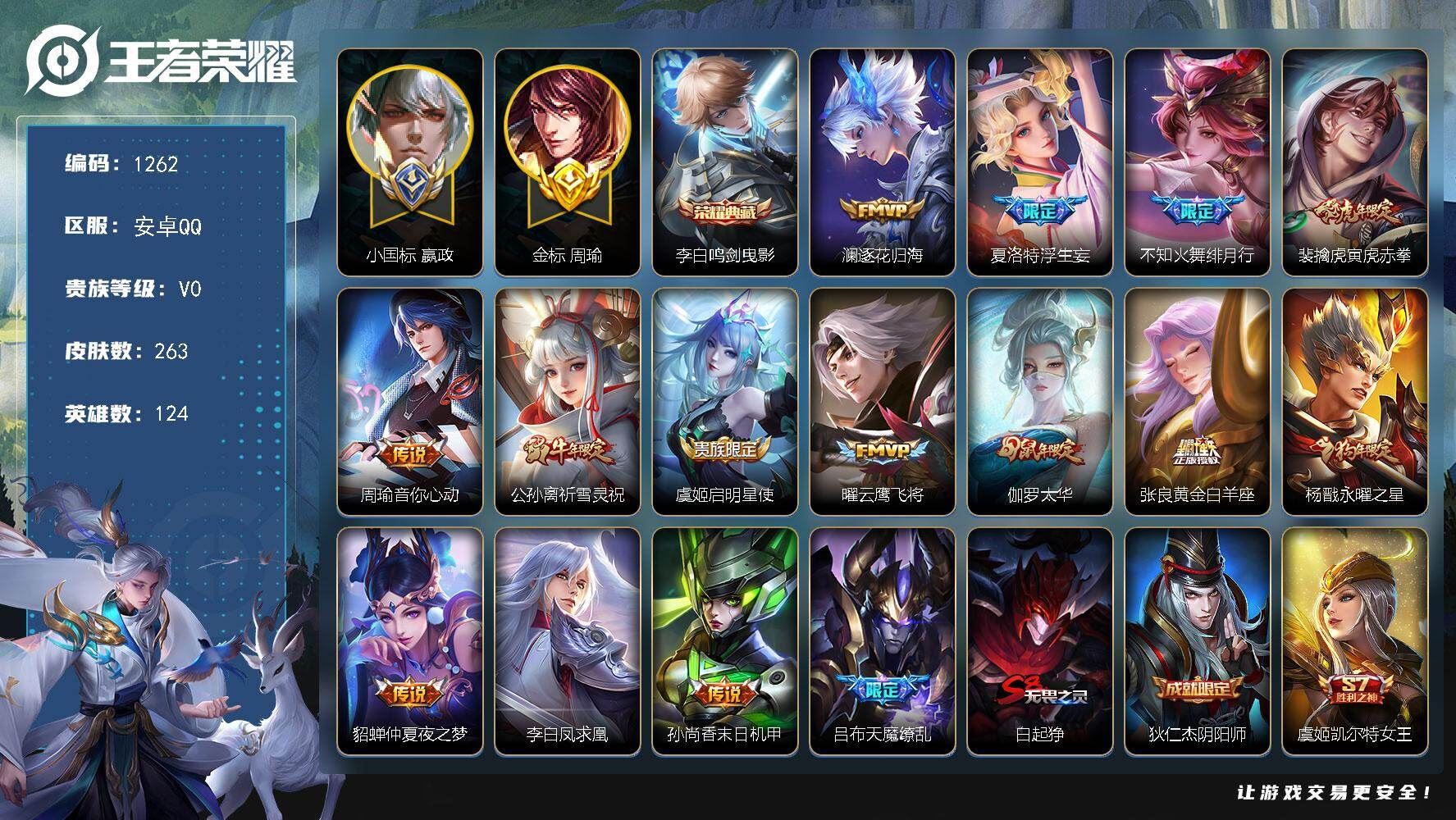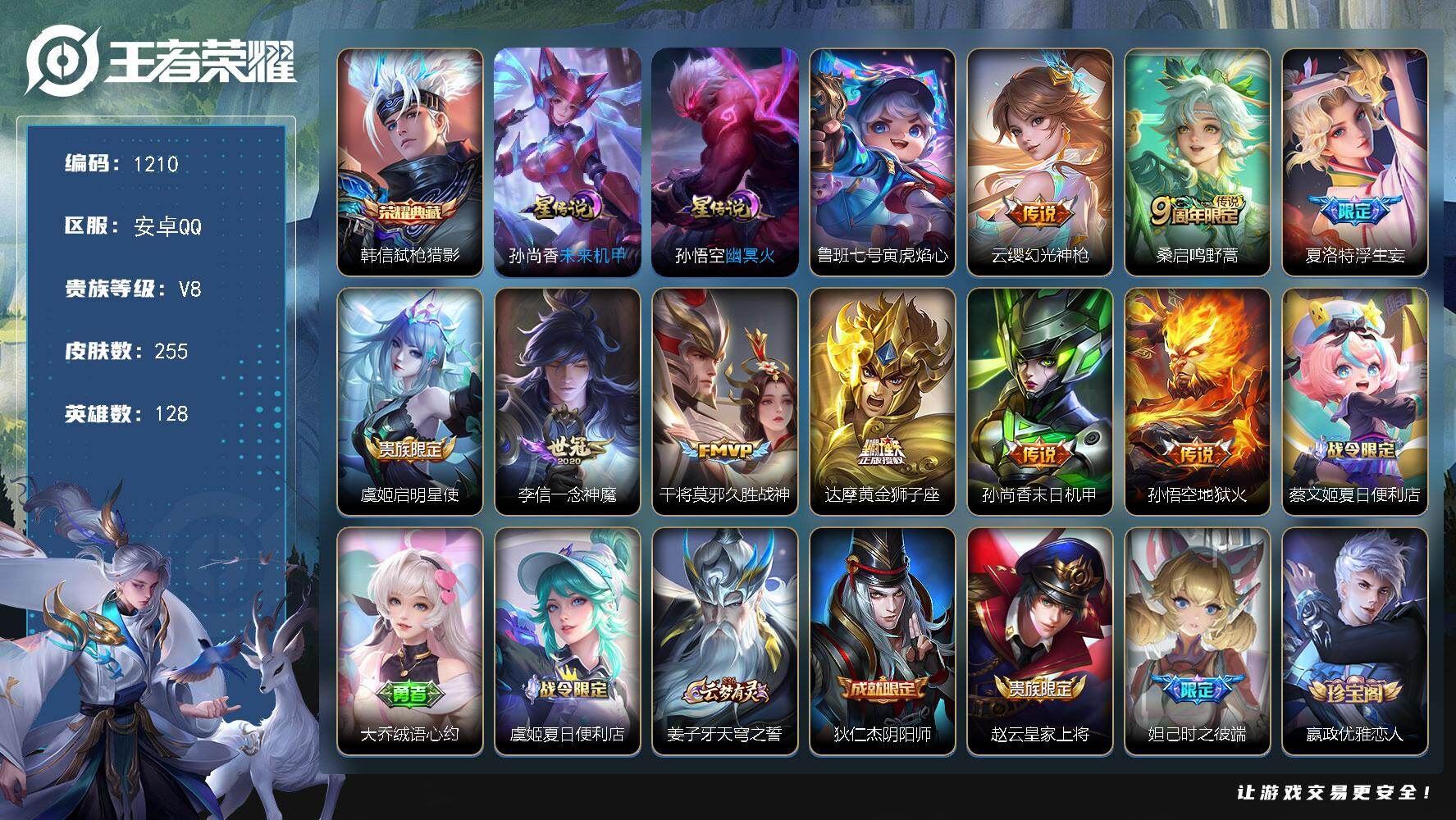 【账号佳】 【可二次实名】可二次安卓Q【营地:514122016】-V8-最强王者段位-128英雄-255皮肤-1典藏皮肤-9传说-72史诗【荣耀典藏】:韩信弑枪猎影【传说皮肤】:云缨幻光神枪,桑启鸣野蒿,夏洛特浮生妄,虞姬启明星使,李信一念神魔,干将莫邪久胜战神,达摩黄金狮子座,孙尚香末日机甲,孙悟空地狱火【限定皮肤】:蔡文姬夏日便利店,大乔绒语心约,虞姬夏日便利店,姜子牙天穹之誓,狄仁杰阴阳师,赵云皇家上将,妲己时之彼端,嬴政优雅恋人,鲁班七号狮舞东方,阿轲迷踪丽影,周瑜赤莲之焰,元歌云间偶戏,元歌无心,夏侯惇朔风刀,曹操天狼征服者,典韦蓝屏警告,马可波罗暗影游猎,狄仁杰魔术师,狄仁杰万华元夜,达摩星际陆战队,项羽海滩派对,老夫子醍醐杖,程咬金演武夺筹,露娜一生所爱,刘邦夺宝奇兵,韩信飞衡,兰陵王驯魔猎人,亚瑟潮玩骑士王,孙悟空至尊宝,孙悟空大圣娶亲,牛魔御旌,后羿如梦令,李元芳银河之约,虞姬启明星使,钟馗神迹守卫,钟馗驱傩正仪,女娲朔望之晖,蔡文姬繁星吟游,鬼谷子原初探秘者,弈星混沌棋,沈梦溪星空之诺,明世隐疑决卦,裴擒虎李小龙,狂铁御狮,米莱狄御霄,米莱狄胡桃异想国,云中君纤云弄巧,盾山御銮,猪八戒西部大镖客,上官婉儿梁祝,夏洛特浮生妄,鬼谷子天穹祈灯,沈梦溪龙舞盛年,鲁班七号蔬乡物语,李元芳蔬乡物语,刘邦剑破天穹,程咬金群星魔术团,周瑜熔金海岸【年限皮肤】:韩信飞衡,各种道具详情看截图、低价出售找回包 赔、截图展示段位不代 表实际段位,如赛季更新等不可抗拒因素发生变化、时限道具不保证所剩时间、标题未写送点劵默认不送【卖号买号首选亿梦】