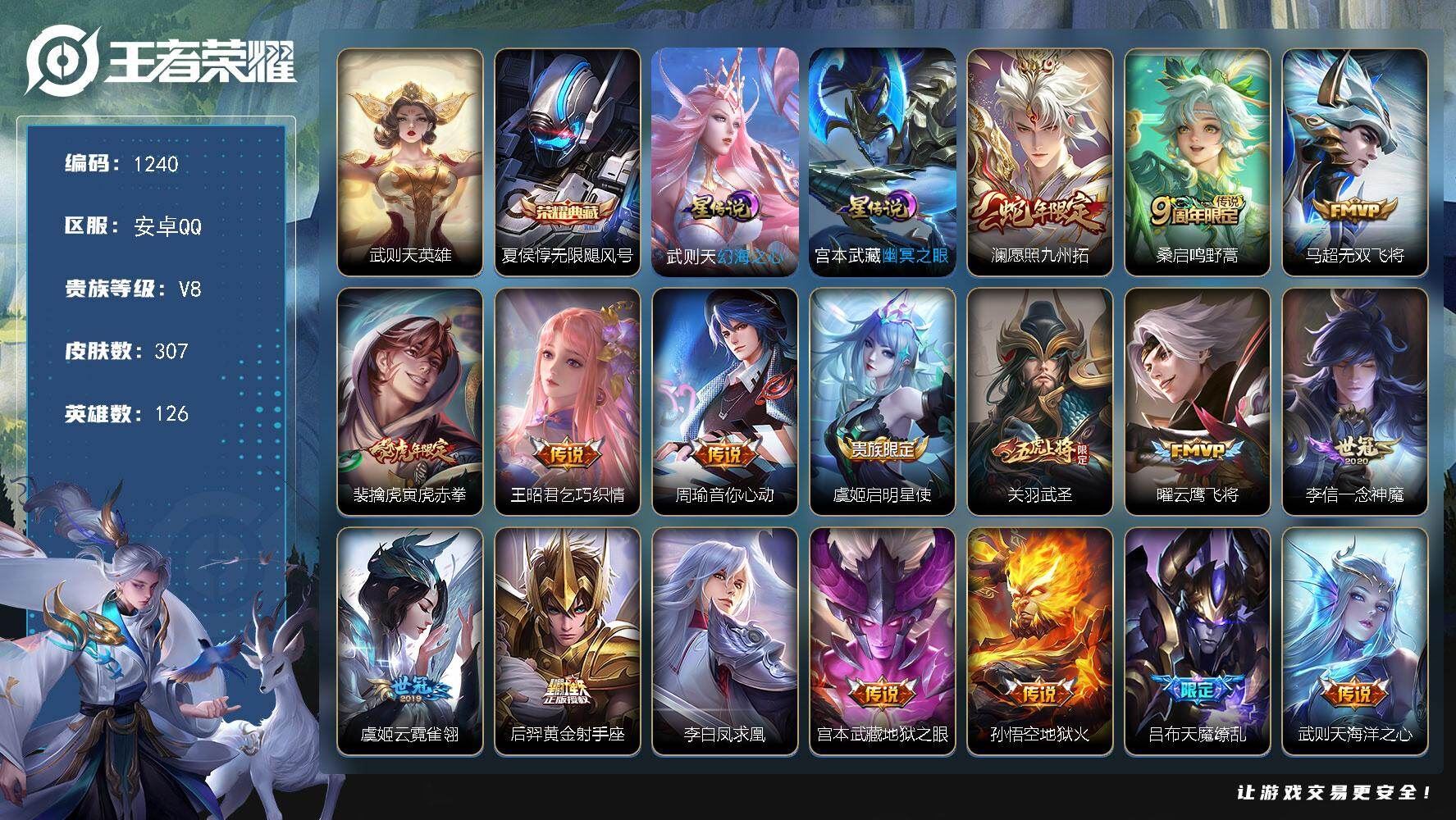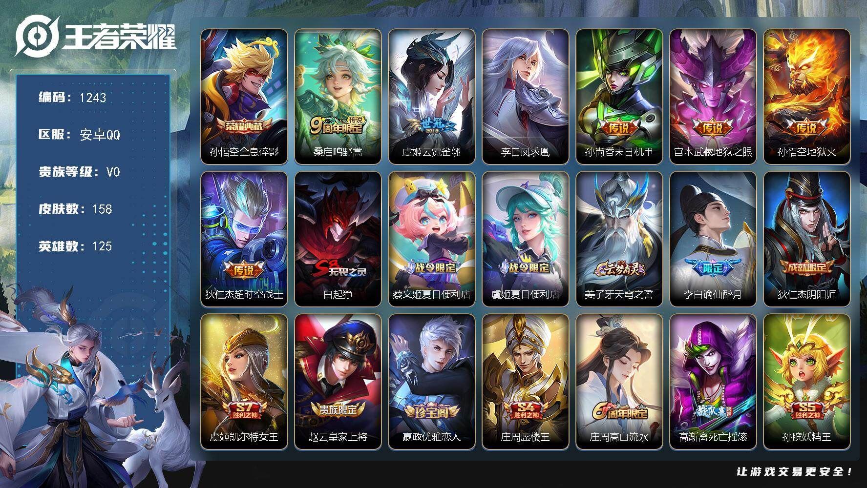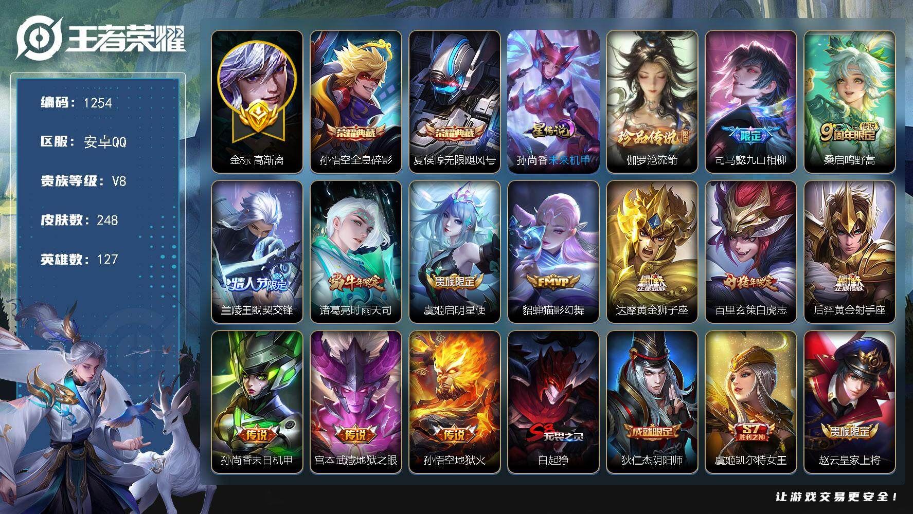 【账号佳】 【可二次实名】可二次安卓Q【营地:226971470】-V8-至尊星耀II段位-127英雄-248皮肤-2典藏皮肤-1珍品传说-12传说-58史诗【荣耀典藏】:孙悟空全息碎影,夏侯惇无限飓风号【珍品传说】:伽罗沧流箭【传说皮肤】:司马懿九山相柳,桑启鸣野蒿,兰陵王默契交锋,诸葛亮时雨天司,虞姬启明星使,貂蝉猫影幻舞,达摩黄金狮子座,百里玄策白虎志,后羿黄金射手座,孙尚香末日机甲,宫本武藏地狱之眼,孙悟空地狱火【限定皮肤】:白起狰,狄仁杰阴阳师,虞姬凯尔特女王,赵云皇家上将,妲己时之彼端,嬴政优雅恋人,嬴政白昼王子,庄周蜃楼王,高渐离死亡摇滚,阿轲迷踪丽影,孙膑妖精王,扁鹊炼金王,扁鹊奇幻香踪,芈月重明,吕布猎兽之王,吕布御风骁将,周瑜真爱至上,元歌云间偶戏,元歌无心,夏侯惇朔风刀,甄姬游园惊梦,曹操烛龙,典韦穷奇,马可波罗暗影游猎,马可波罗山海玄木吟,狄仁杰魔术师,狄仁杰万华元夜,项羽海滩派对,项羽霸王别姬,老夫子醍醐杖,关羽百相守梦,貂蝉逐梦之音,程咬金演武夺筹,刘邦夺宝奇兵,韩信飞衡,兰陵王默契交锋,兰陵王金庭之子,亚瑟潮玩骑士王,孙悟空美猴王,牛魔御旌,李元芳云中旅人,虞姬霸王别姬,虞姬启明星使,钟馗神迹守卫,钟馗驱傩正仪,杨玉环遇见飞天,杨戬潮玩骑兵,女娲朔望之晖,雅典娜单词大作战,雅典娜黎明之约,太乙真人饕餮,太乙真人华丽摇滚,鬼谷子原初探秘者,鬼谷子五谷丰年,诸葛亮时雨天司,铠青龙志,百里玄策白虎志,百里玄策原初追逐者,弈星混沌棋,沈梦溪大漠名商,明世隐疑决卦,裴擒虎李小龙,裴擒虎擒涛扼浪,狂铁御狮,米莱狄御霄,云中君纤云弄巧,盾山御銮,猪八戒西部大镖客,蒙犽狂想玩偶喵,鲁班大师探海日志,桑启海盐诗旅,艾琳女武神【年限皮肤】:孙悟空美猴王,百里玄策白虎志,铠青龙志,韩信飞衡,诸葛亮时雨天司,吕布御风骁将,马可波罗山海玄木吟,各种道具详情看截图、低价出售找回包 赔、截图展示段位不代 表实际段位,如赛季更新等不可抗拒因素发生变化、时限道具不保证所剩时间、标题未写送点劵默认不送【卖号买号首选亿梦】